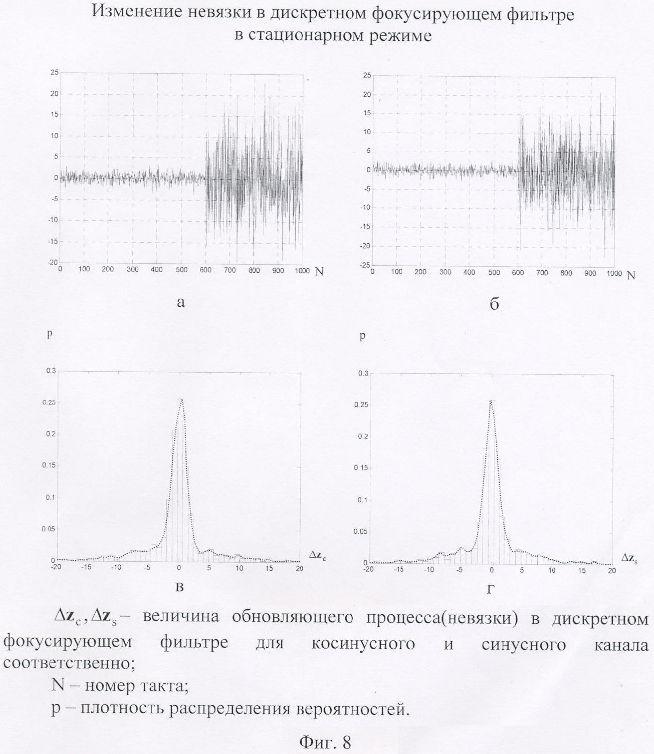 На фигуре 8 представлены зависимости невязок zc и zs от дискретного времени N в отдельности для синусного и косинусного каналов системы обработки (фигура 8 а, б) и их плотности распределения вероятностей р (гистограммы) (фигура 8 в, г) при ухудшении условий работы фильтра в случайный момент времени.