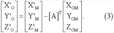 Поскольку вектор (ХОМ, YOM, ZOM) в системе координат OXYZ непосредственно измеряется с помощью СТЗ, а вектор известен по условию задачи, то это соотношение можно использовать для вычисления координат ЛА относительно ВПП.