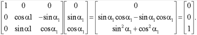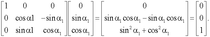 Из полученного выражения видно, что этот вектор лежит в плоскости OYZ и по-прежнему имеет длину, равную единице, то есть такое умножение эквивалентно повороту вектора на угол 1. Умножим теперь полученный вектор на матрицу поворота вокруг оси ОХ на угол – 1, получим