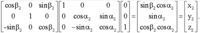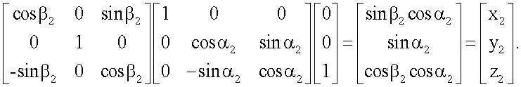 В результате двух последовательных поворотов исходного вектора r1 мы получили единичный вектор, совпадающий с осью OZ. Если теперь полученный вектор повернуть на угол 2 вокруг оси ОХ, а затем на угол 2 вокруг оси OY, то получим вектор r2.