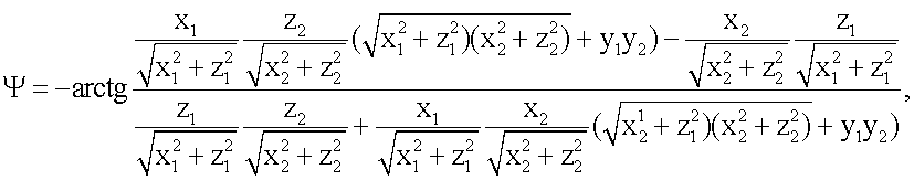 где Y1 , Z1 , Y2 , Z2 – координаты изображений маяков, м; первый индекс обозначает номер фотоматрицы, второй индекс – номер маяка =1, 2, для маяка M1 и M2 соответственно; F – фокусное расстояние объектива, м; В – расстояние между первым и вторым ОЛБ, м; вычисляют углы ориентации ЛА относительно ВПП – углы рыскания , крена , тангажа ,