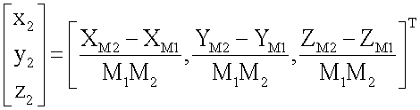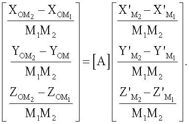 X’M1, Y’M1, Z’M1, X’M2, Y’M2, Z’M2 – известные координаты первого и второго маяков в системе координат, связанной с ВПП, вычисляют матрицу направляющих косинусов