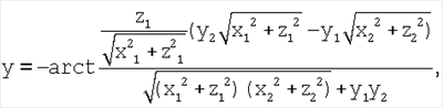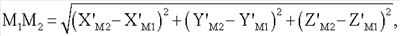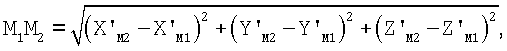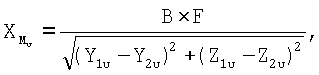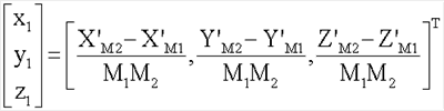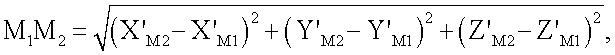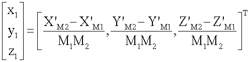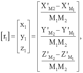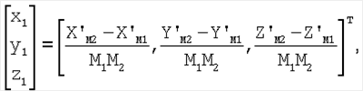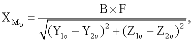 где Y1 , Z1 , Y2 , Z2 – координаты изображений маяков, м, первый индекс обозначает номер фотоматрицы, второй индекс – номер маяка =1, 2, для маяка M1 и