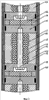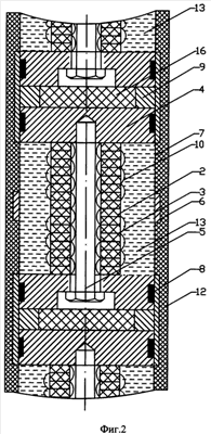 Для выполнения этого условия эффективная скорость звука в пьезопакетах, определяющая частоту продольного резонанса, уменьшена частотопонижающими накладками до значения (1.2-1.3)С, где С-скорость звука во внешней рабочей среде. Кроме того, рабочая частота пьезопакета с частотопонижающими накладками уменьшена дополнительно тем, что накладки оперты на пружинные элементы, каждый из которых выполнен в виде короткого цилиндра таких размеров, что резонансная частота изгибных колебаний торцевой накладки, опертой на пружинный элемент, составляет fpeз=(0.8-0.9)f1, где f1-частота полуволнового резонанса пьезопакета. Для выполнения этого условия достаточно подобрать материал цилиндра (сплавы А1, сталь) и его внутренний радиальный размер, сохраняя неизменной его толщину (высоту), которая будет определяться толщиной мягких экранов. При выполнении этих двух условий скорость распространения бегущей волны вдоль скважинного акустического излучателя близка к скорости звука во внешней рабочей среде, а излучатель формирует однонаправленное излучение вдоль своей оси. Угол максимума характеристики направленности определяется выражением ( =arccos(C/Cэфф), где Сэфф-эффективная скорость звука в пеьзопакетах (скорость распространения бегущей волны), а ширина характеристики направленности определяется апертурой акустического скважинного излучателя в направлении излечения, т.е. его длиной.