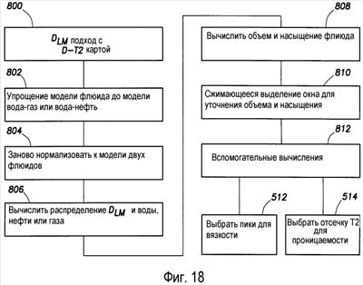 Фиг.18 изображает блок-схему иллюстративного способа, использующего DLM определение. Вначале, на этапе 800, из процесса инверсии, независящей от модели, генерируется или импортируется D-T2 карта. На этапе 802, модель флюида выбирается пользователем частично на основе визуального наблюдения D-T2 карты или предшествующего знания образца или их комбинации. Наиболее общие модели флюидов включают воду-нефть или воду-газ, хотя одинаково применимы другие комбинации. Дополнительно, на этапе 802, артефакты флюидов, не включенные в выбранную модель флюида, но присутствующие на D-T2 карте, удаляются из распределения. Указанная процедура может быть выполнена либо вручную, используя, например, мышь компьютера, либо автоматически программным обеспечением, на основе близости нежелательного артефакта к теоретическому отклику флюида, который не является частью модели. Например, для выбранной модели вода-нефть программное обеспечение может детектировать, что концентрация амплитуды, указывающая вероятное присутствие флюидов, возникает вблизи теоретического отклика газа. Для определения области артефакта, интерпретируемого как газ, осуществляется процедура детектирования края, а затем указанная область карты удаляется из суммарного распределения.