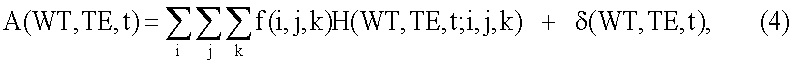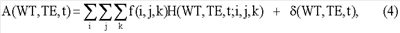 где WT, TE, t представляют собой время ожидания, разнесение эхо-сигналов и время ЯМР последовательностей импульсов; (i, j k) представляет собой индексы T2, D и T1/T2 распределений, f(i,j,k) – амплитуда трехмерной составляющей в T2, D, T1/T2 пространстве, H(WT, TE, t,i,j, k) – ядро этой составляющей, а – шумовая составляющая.