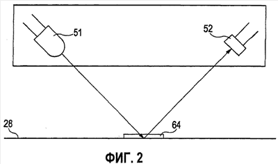 На фиг.2 показана структура датчика 41 плотности. Датчик 41 плотности включает в себя излучающий инфракрасный свет элемент 51, такой как светоизлучающий диод (СД) (LED), светоприемный элемент 52, такой как фотодиод, интегральную схему (ИС) (IC) (не показана) и т.д., используемую для обработки светоприемных данных, и держатель (не показан) для размещения. Светоприемный элемент 52 определяет интенсивность отраженного света от пятна 64 тонера. Хотя датчик 41 плотности согласно этому варианту осуществления формируется так, чтобы определять зеркально отраженный свет, способ определения плотности не ограничивается этим. Например, датчик 41 плотности может быть сформирован так, чтобы определять диффузно отраженный свет. Оптический элемент (не показан), такой как объектив, может быть использован для связи светоизлучающего элемента 51 и светоприемного элемента 52.