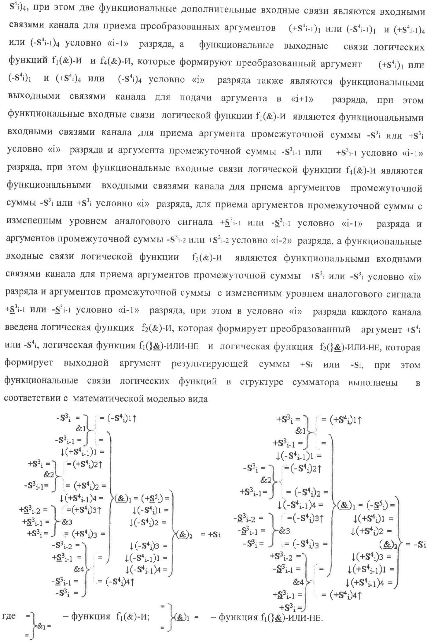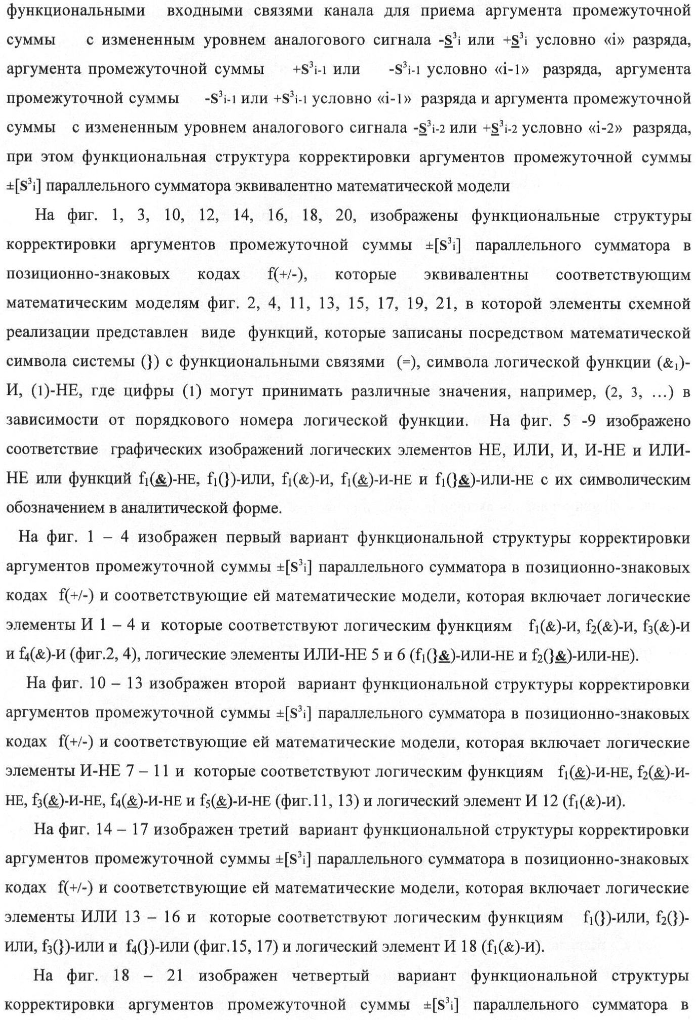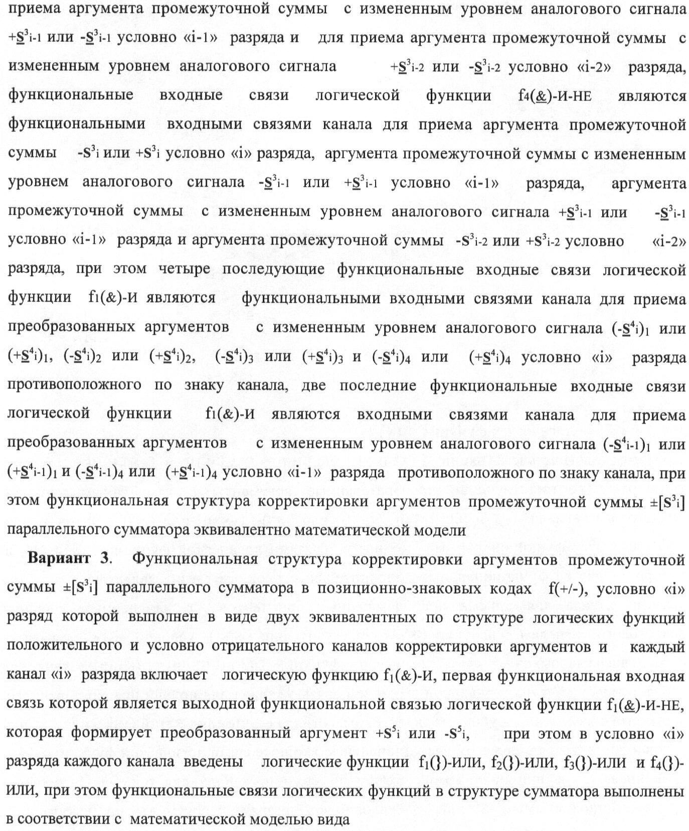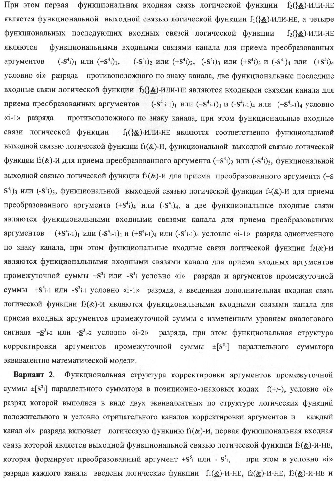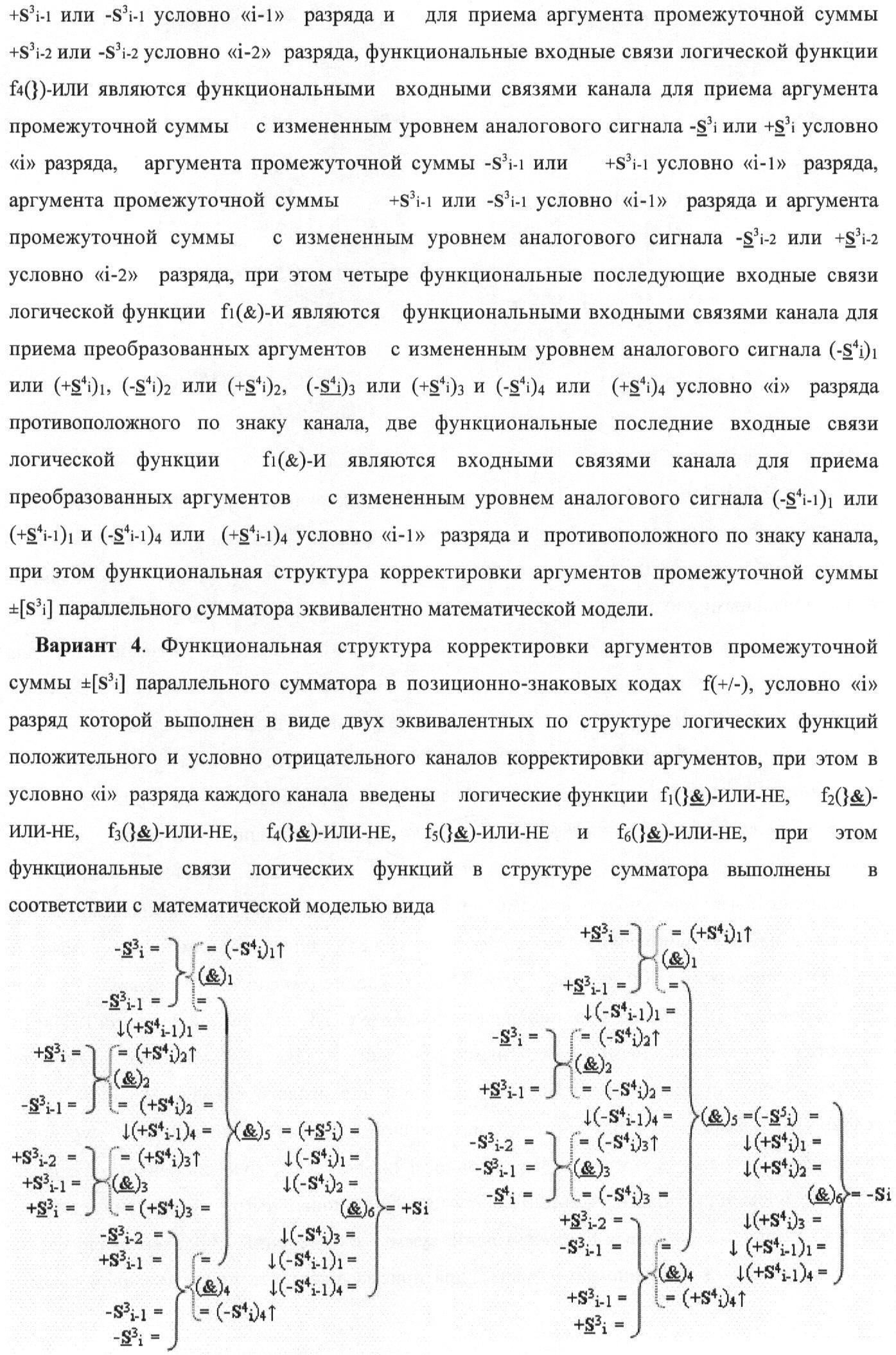 1. Функциональная структура корректировки аргументов промежуточной суммы ±[S3i] параллельного сумматора в позиционно-знаковых кодах f(+/-), условно «i» разряд которой выполнен в виде двух эквивалентных по структуре логических функций положительного и условно отрицательного каналов корректировки аргументов, и каждый канал «i» разряда включает три логические функции f1(&)-И, f3(&)-И и f4(&)-И, которые формируют преобразованные аргументы или  или и или при этом две функциональные дополнительные входные связи являются входными связями канала для приема преобразованных аргументов или и или условно «i-1» разряда, а функциональные выходные связи логических функций f1(&)-И и f4(&)-И, которые формируют преобразованный аргумент или и или условно «i» разряда также являются функциональными выходными связями канала для подачи аргумента в «i+1» разряда, при этом функциональные входные связи логической функции f1(&)-И являются функциональными входными связями канала для приема аргумента промежуточной суммы или условно «i» разряда и аргумента промежуточной суммы или условно «i-1» разряда, при этом функциональные входные связи логической функции f4(&)-И являются функциональными входными связями канала для приема аргументов промежуточной суммы или условно «i» разряда, для приема аргументов промежуточной суммы с измененным уровнем аналогового сигнала или условно «i-1» разряда и аргументов промежуточной суммы или условно «i-2» разряда, а функциональные входные связи логической функции f3(&)-И являются функциональными входными связями канала для приема аргументов промежуточной суммы или условно «i» разряда и аргументов промежуточной суммы с измененным уровнем аналогового сигнала или условно «i-1» разряда, отличающаяся тем, что в условно «i» разряда каждого канала введена логическая функция f2(&)-И, которая формирует преобразованный аргумент или логическая функция f1(}&)-ИЛИ-НЕ и логическая функция f2(}&)-ИЛИ-НЕ, которая формирует выходной аргумент результирующей суммы +Si или -Si, при этом функциональные связи логических функций в структуре сумматора выполнены в соответствии с математической моделью вида