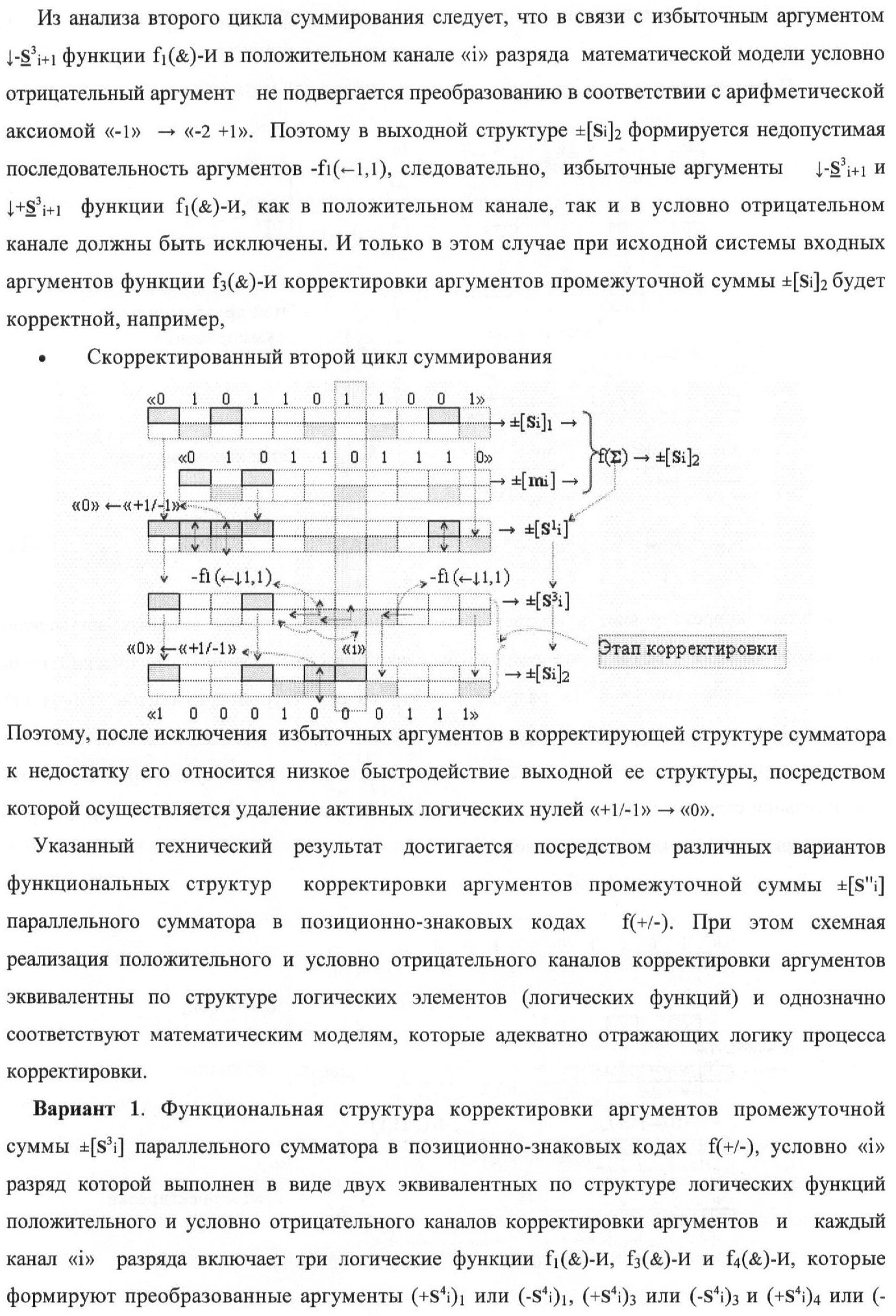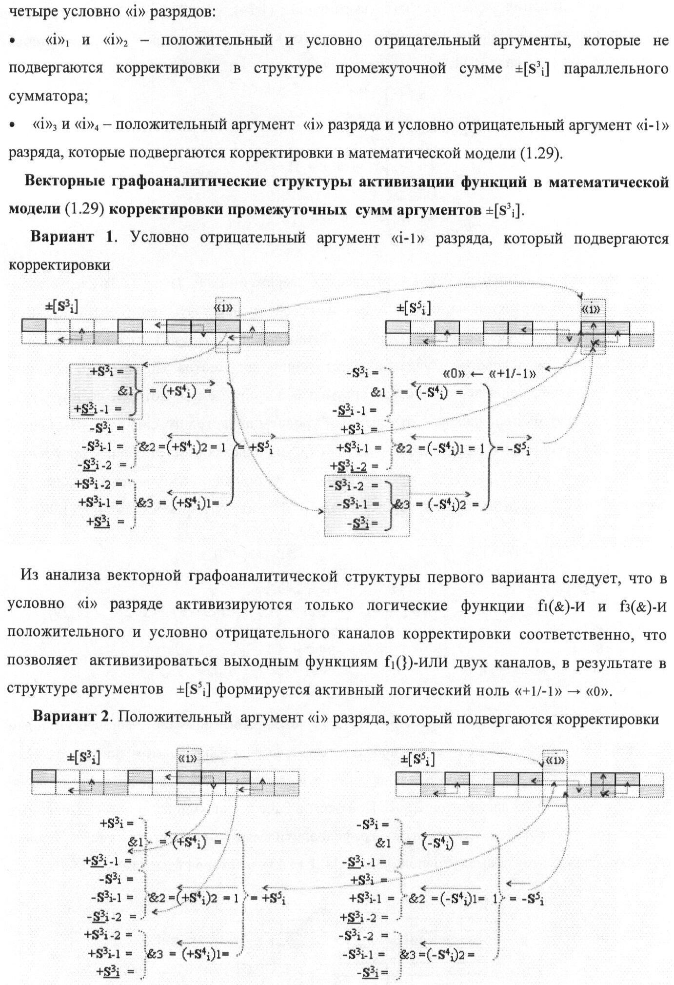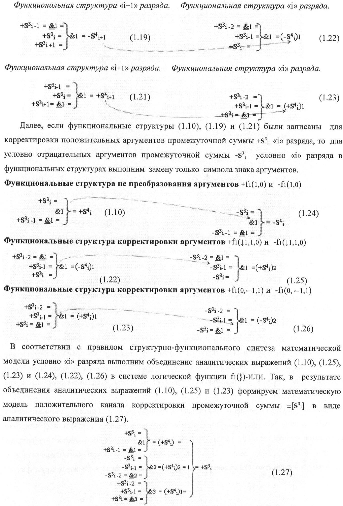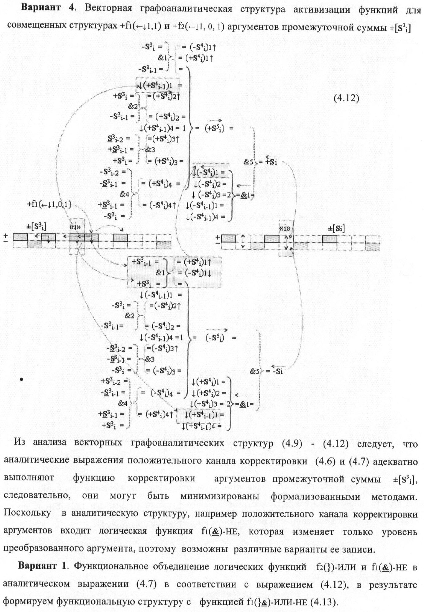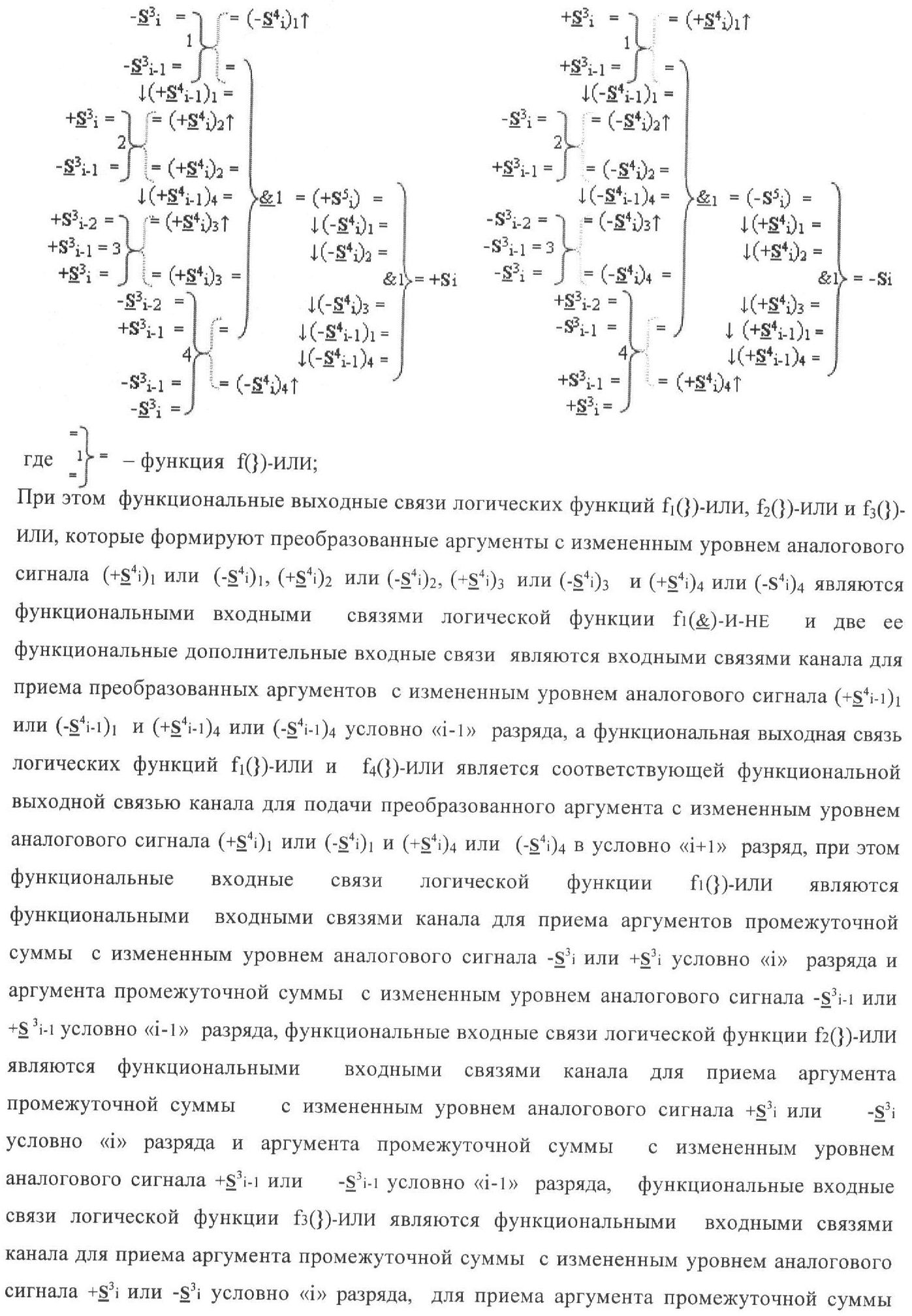 1. Функциональная структура корректировки аргументов промежуточной суммы ±[S3i] параллельного сумматора в позиционно-знаковых кодах f(+/-), условно «i» разряд которой выполнен в виде двух эквивалентных по структуре логических функций положительного и условно отрицательного каналов корректировки аргументов, и каждый канал «i» разряда включает три логические функции f1(&)-И, f3(&)-И и f4(&)-И, которые формируют преобразованные аргументы или  или и или при этом две функциональные дополнительные входные связи являются входными связями канала для приема преобразованных аргументов или и или условно «i-1» разряда, а функциональные выходные связи логических функций f1(&)-И и f4(&)-И, которые формируют преобразованный аргумент или и или условно «i» разряда также являются функциональными выходными связями канала для подачи аргумента в «i+1» разряда, при этом функциональные входные связи логической функции f1(&)-И являются функциональными входными связями канала для приема аргумента промежуточной суммы или условно «i» разряда и аргумента промежуточной суммы или условно «i-1» разряда, при этом функциональные входные связи логической функции f4(&)-И являются функциональными входными связями канала для приема аргументов промежуточной суммы или условно «i» разряда, для приема аргументов промежуточной суммы с измененным уровнем аналогового сигнала или условно «i-1» разряда и аргументов промежуточной суммы или условно «i-2» разряда, а функциональные входные связи логической функции f3(&)-И являются функциональными входными связями канала для приема аргументов промежуточной суммы или условно «i» разряда и аргументов промежуточной суммы с измененным уровнем аналогового сигнала или условно «i-1» разряда, отличающаяся тем, что в условно «i» разряда каждого канала введена логическая функция f2(&)-И, которая формирует преобразованный аргумент или логическая функция f1(}&)-ИЛИ-НЕ и логическая функция f2(}&)-ИЛИ-НЕ, которая формирует выходной аргумент результирующей суммы +Si или -Si, при этом функциональные связи логических функций в структуре сумматора выполнены в соответствии с математической моделью вида