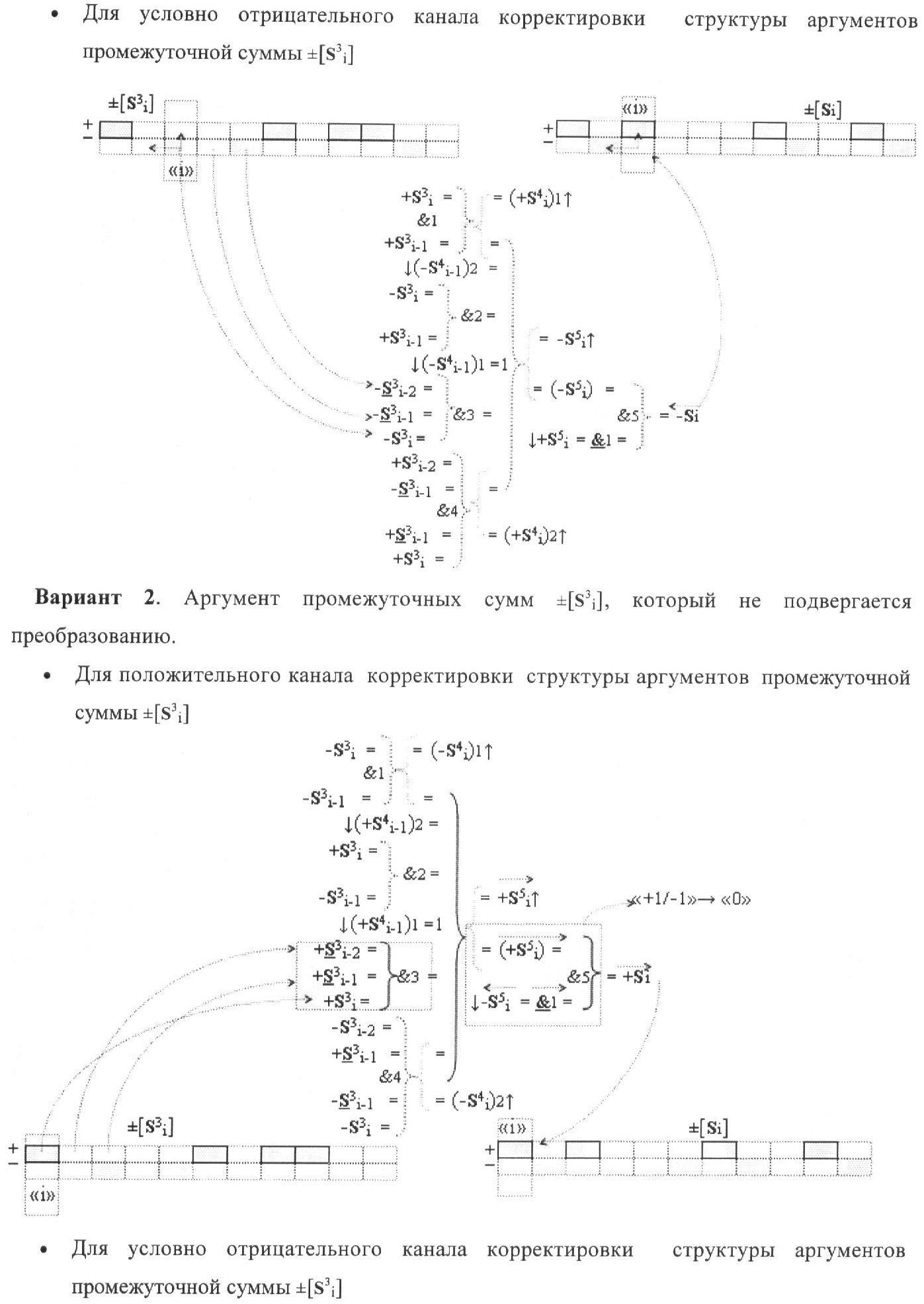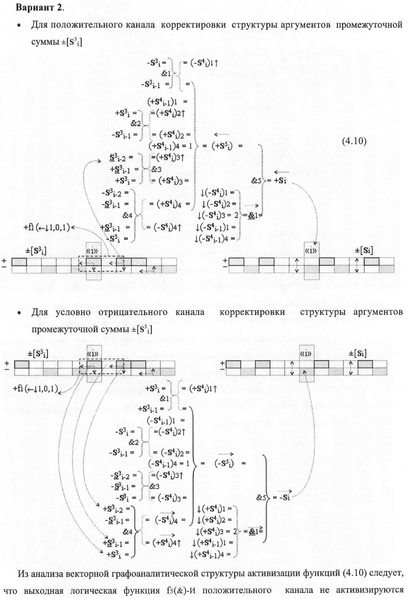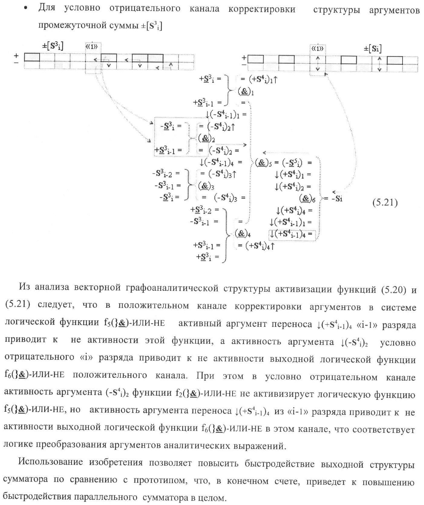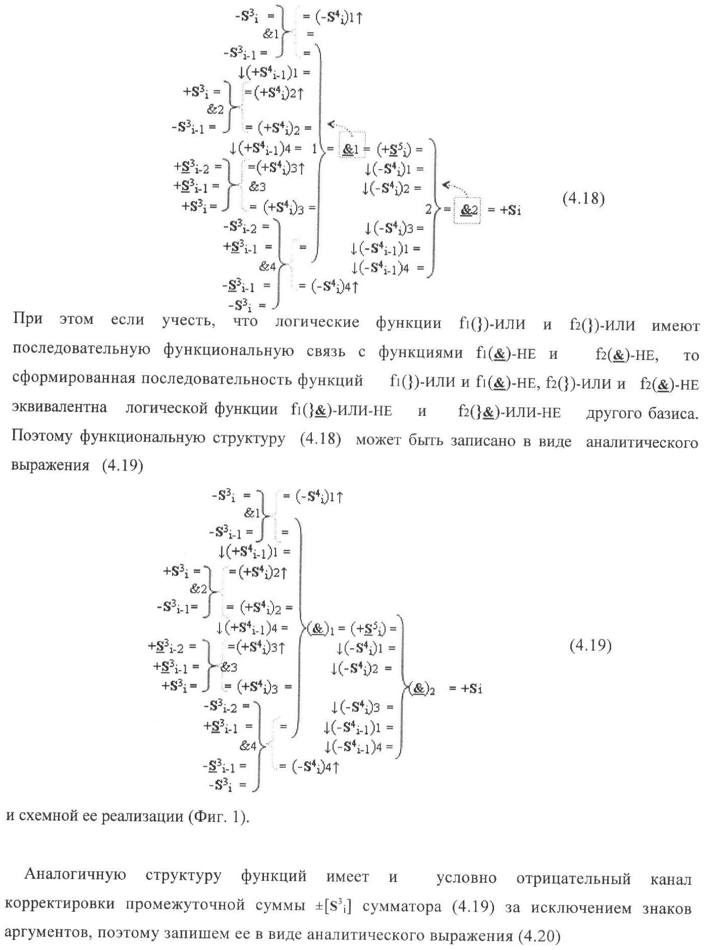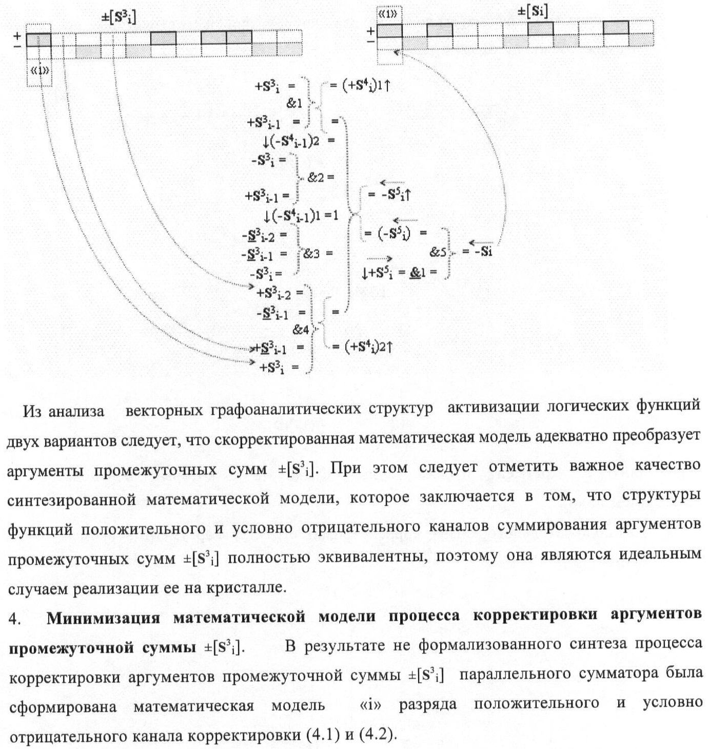 1. Функциональная структура корректировки аргументов промежуточной суммы ±[S3i] параллельного сумматора в позиционно-знаковых кодах f(+/-), условно «i» разряд которой выполнен в виде двух эквивалентных по структуре логических функций положительного и условно отрицательного каналов корректировки аргументов, и каждый канал «i» разряда включает три логические функции f1(&)-И, f3(&)-И и f4(&)-И, которые формируют преобразованные аргументы или  или и или при этом две функциональные дополнительные входные связи являются входными связями канала для приема преобразованных аргументов или и или условно «i-1» разряда, а функциональные выходные связи логических функций f1(&)-И и f4(&)-И, которые формируют преобразованный аргумент или и или условно «i» разряда также являются функциональными выходными связями канала для подачи аргумента в «i+1» разряда, при этом функциональные входные связи логической функции f1(&)-И являются функциональными входными связями канала для приема аргумента промежуточной суммы или условно «i» разряда и аргумента промежуточной суммы или условно «i-1» разряда, при этом функциональные входные связи логической функции f4(&)-И являются функциональными входными связями канала для приема аргументов промежуточной суммы или условно «i» разряда, для приема аргументов промежуточной суммы с измененным уровнем аналогового сигнала или условно «i-1» разряда и аргументов промежуточной суммы или условно «i-2» разряда, а функциональные входные связи логической функции f3(&)-И являются функциональными входными связями канала для приема аргументов промежуточной суммы или условно «i» разряда и аргументов промежуточной суммы с измененным уровнем аналогового сигнала или условно «i-1» разряда, отличающаяся тем, что в условно «i» разряда каждого канала введена логическая функция f2(&)-И, которая формирует преобразованный аргумент или логическая функция f1(}&)-ИЛИ-НЕ и логическая функция f2(}&)-ИЛИ-НЕ, которая формирует выходной аргумент результирующей суммы +Si или -Si, при этом функциональные связи логических функций в структуре сумматора выполнены в соответствии с математической моделью вида