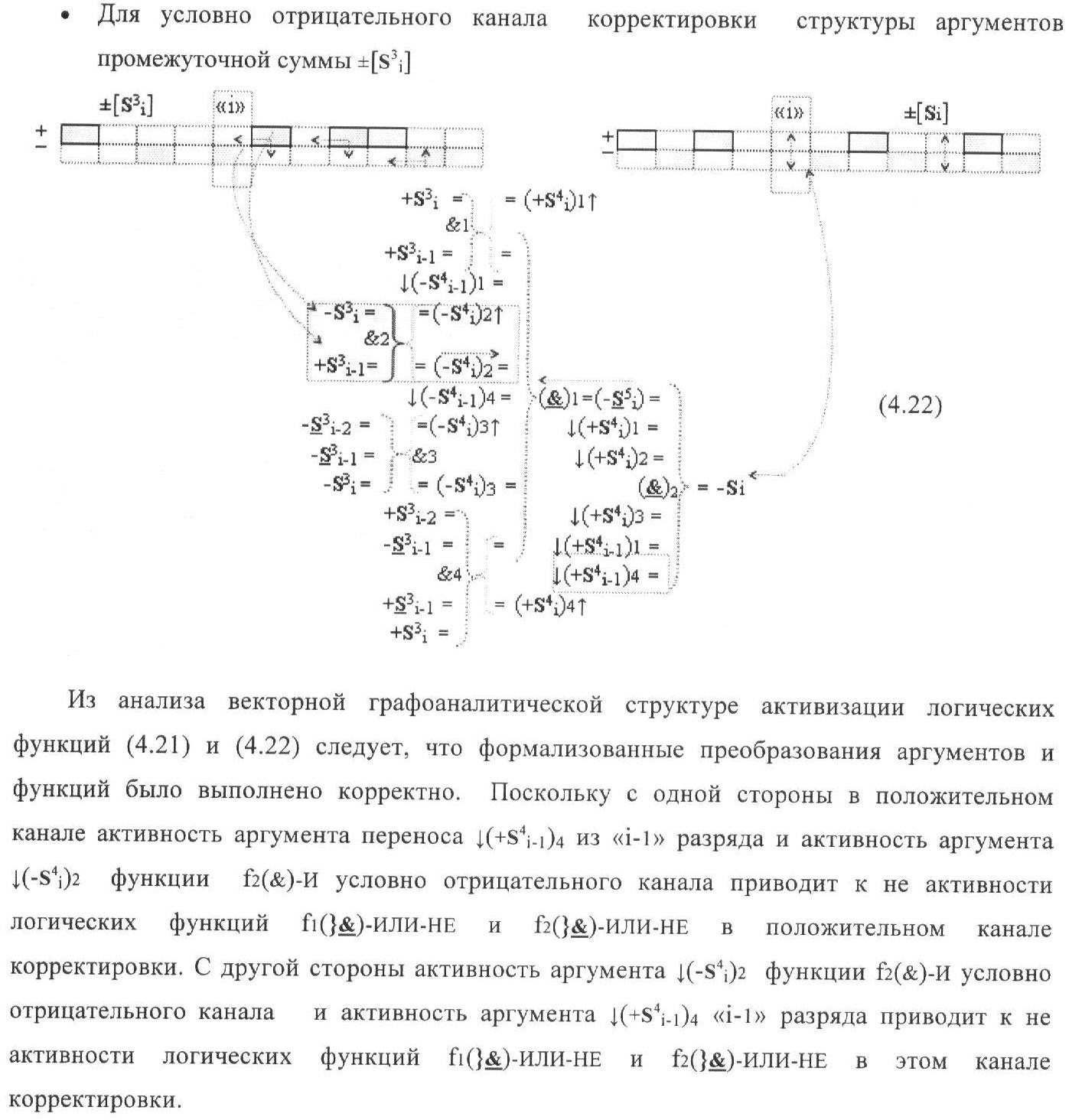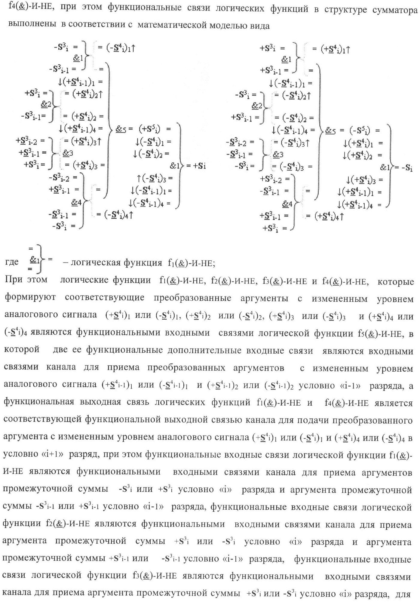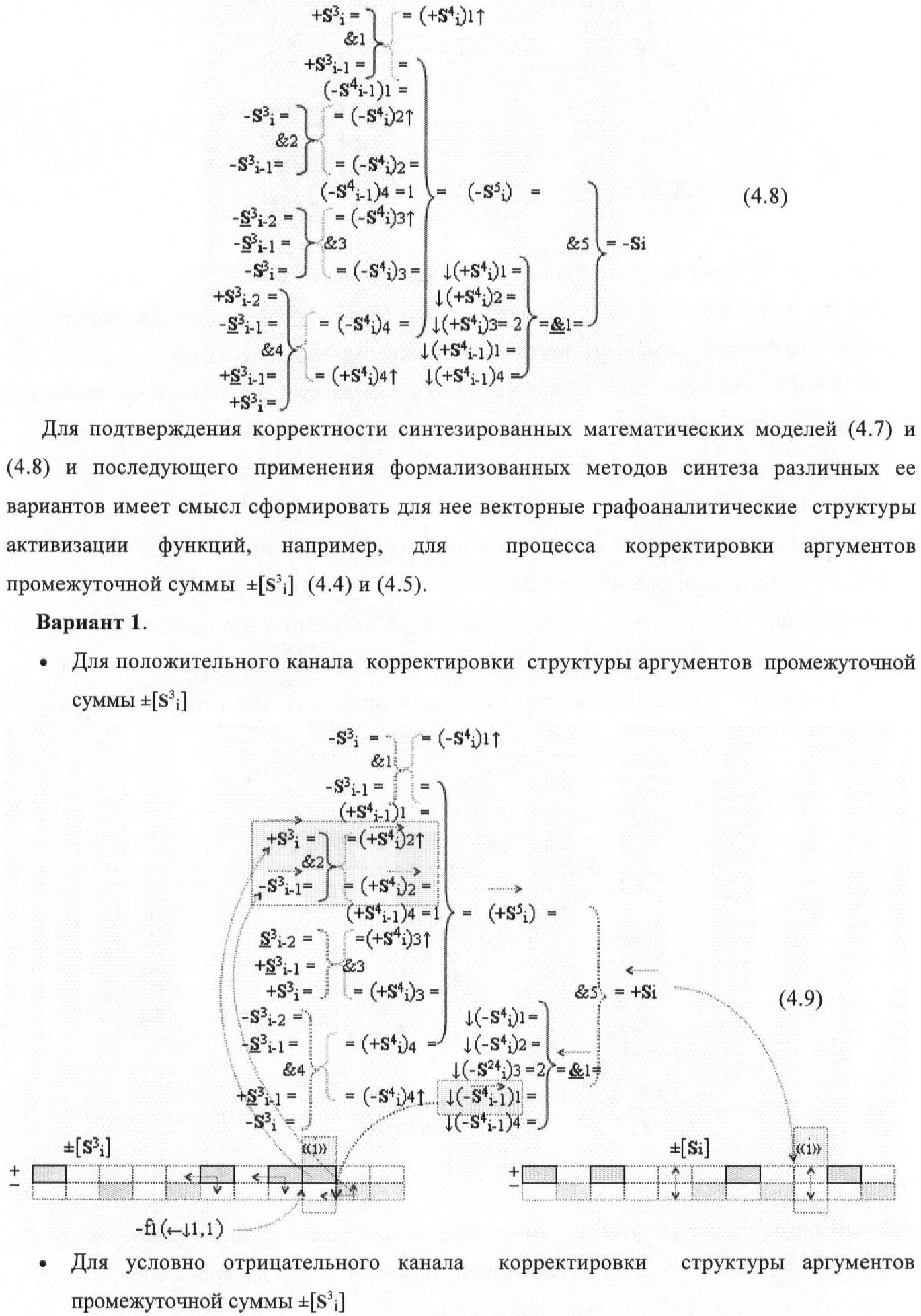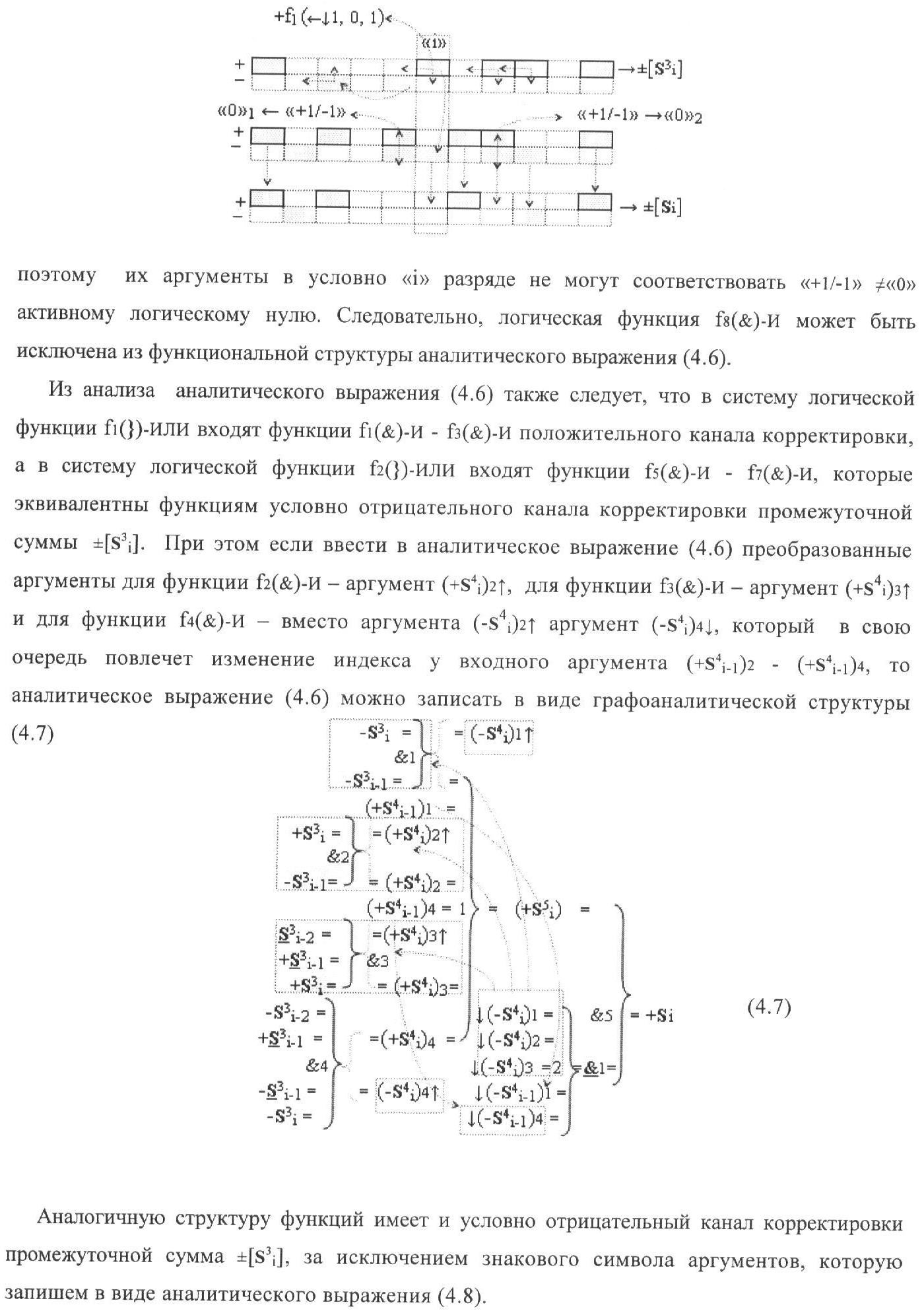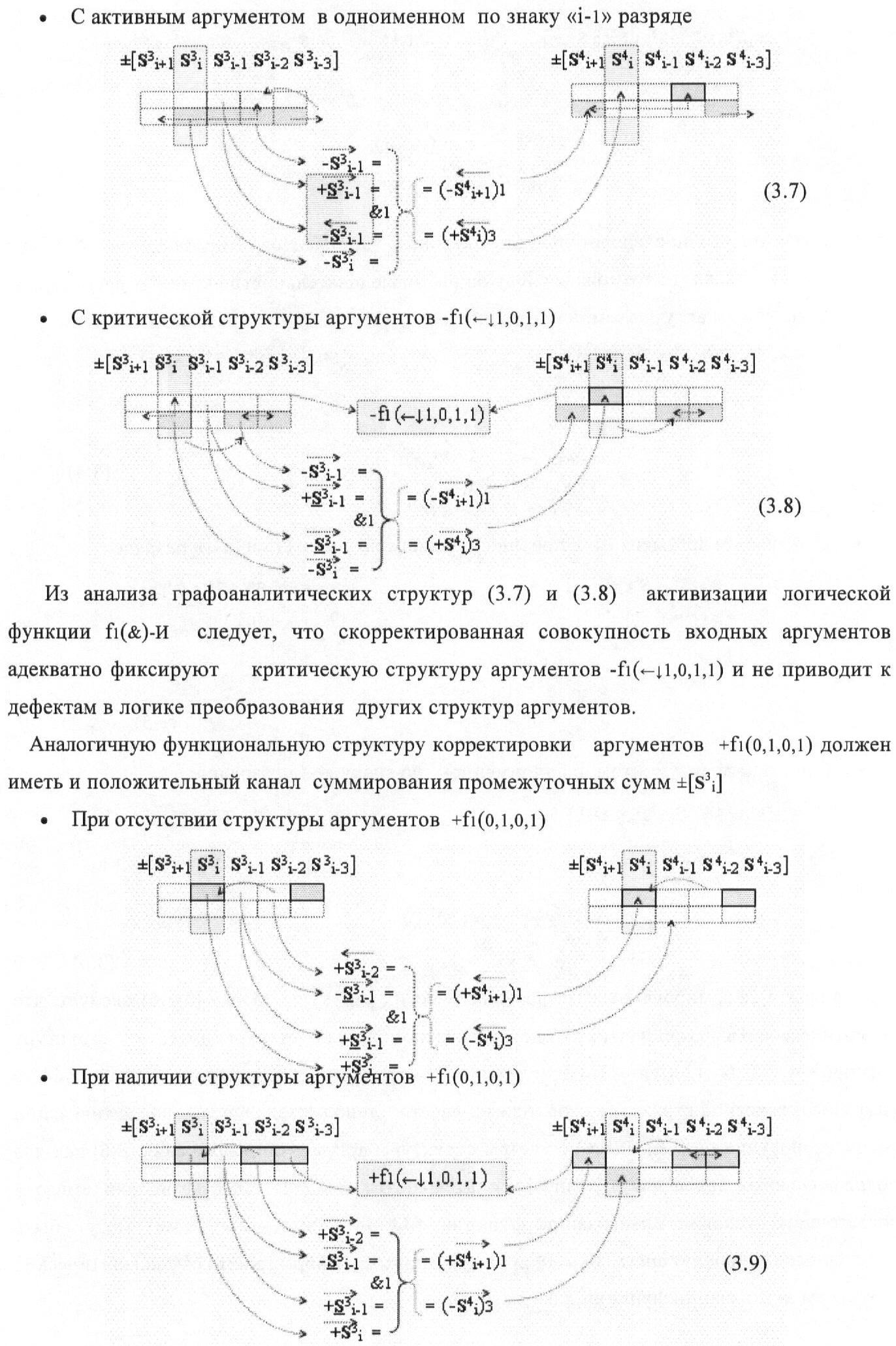 1. Функциональная структура корректировки аргументов промежуточной суммы ±[S3i] параллельного сумматора в позиционно-знаковых кодах f(+/-), условно «i» разряд которой выполнен в виде двух эквивалентных по структуре логических функций положительного и условно отрицательного каналов корректировки аргументов, и каждый канал «i» разряда включает три логические функции f1(&)-И, f3(&)-И и f4(&)-И, которые формируют преобразованные аргументы или  или и или при этом две функциональные дополнительные входные связи являются входными связями канала для приема преобразованных аргументов или и или условно «i-1» разряда, а функциональные выходные связи логических функций f1(&)-И и f4(&)-И, которые формируют преобразованный аргумент или и или условно «i» разряда также являются функциональными выходными связями канала для подачи аргумента в «i+1» разряда, при этом функциональные входные связи логической функции f1(&)-И являются функциональными входными связями канала для приема аргумента промежуточной суммы или условно «i» разряда и аргумента промежуточной суммы или условно «i-1» разряда, при этом функциональные входные связи логической функции f4(&)-И являются функциональными входными связями канала для приема аргументов промежуточной суммы или условно «i» разряда, для приема аргументов промежуточной суммы с измененным уровнем аналогового сигнала или условно «i-1» разряда и аргументов промежуточной суммы или условно «i-2» разряда, а функциональные входные связи логической функции f3(&)-И являются функциональными входными связями канала для приема аргументов промежуточной суммы или условно «i» разряда и аргументов промежуточной суммы с измененным уровнем аналогового сигнала или условно «i-1» разряда, отличающаяся тем, что в условно «i» разряда каждого канала введена логическая функция f2(&)-И, которая формирует преобразованный аргумент или логическая функция f1(}&)-ИЛИ-НЕ и логическая функция f2(}&)-ИЛИ-НЕ, которая формирует выходной аргумент результирующей суммы +Si или -Si, при этом функциональные связи логических функций в структуре сумматора выполнены в соответствии с математической моделью вида