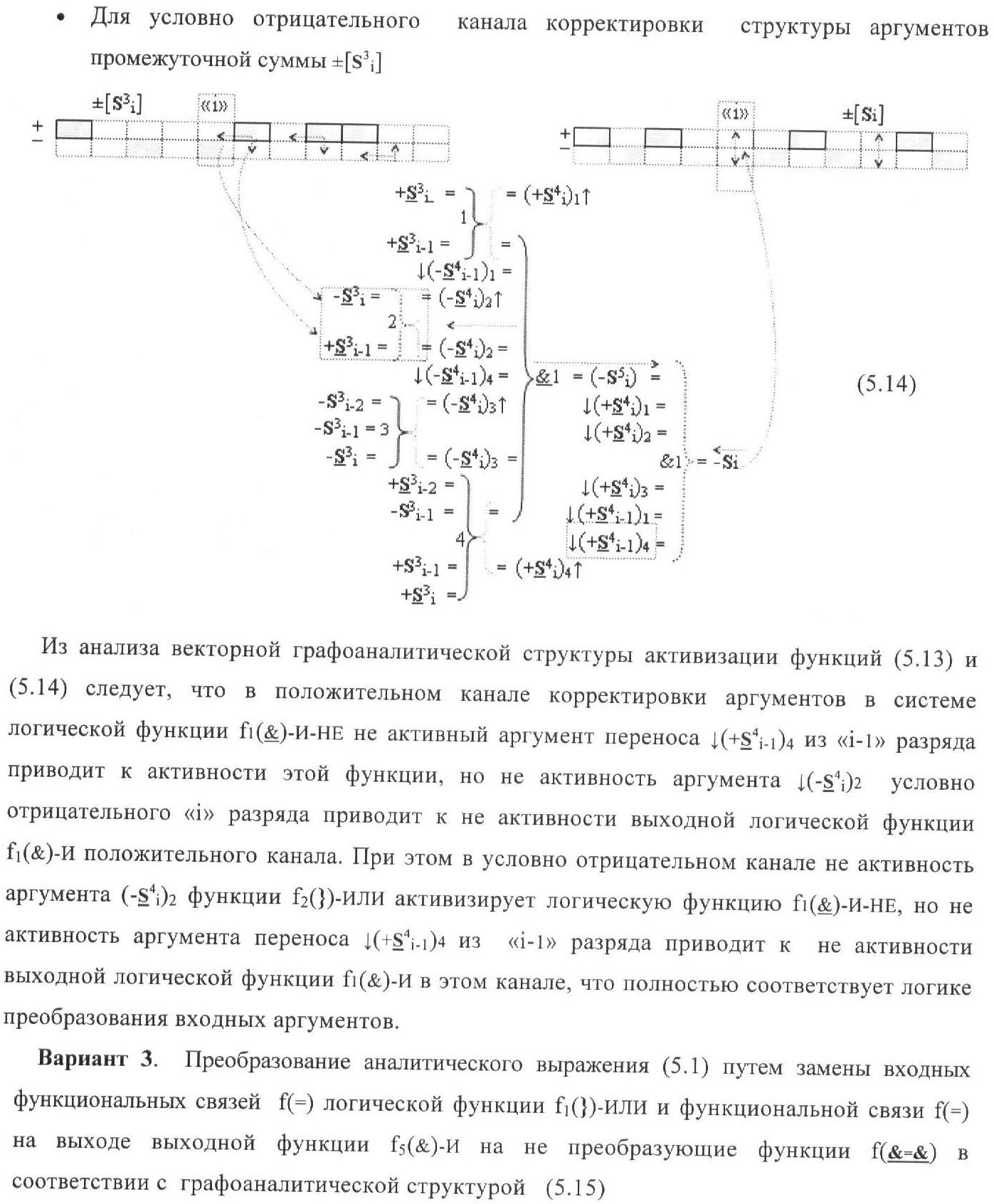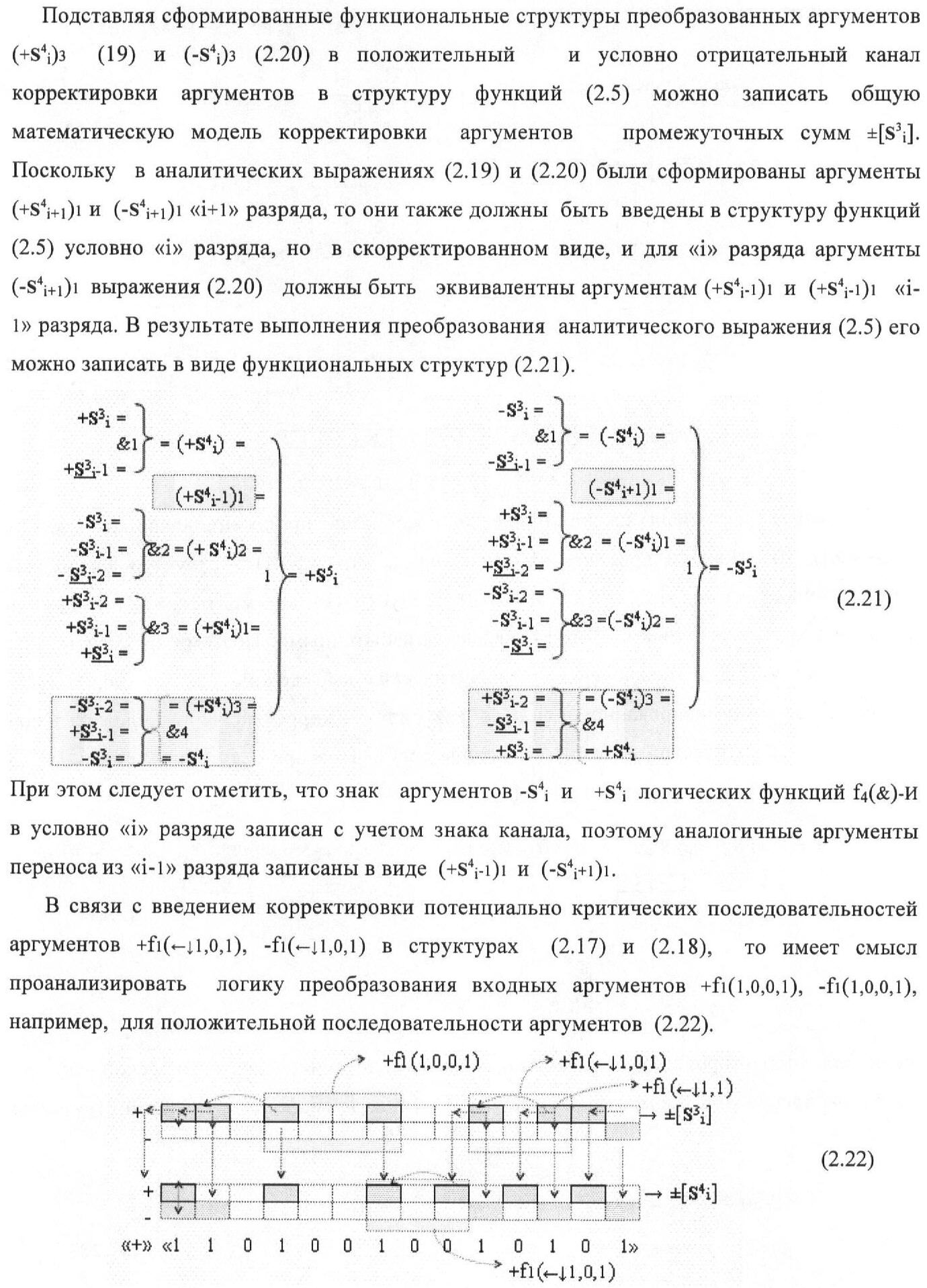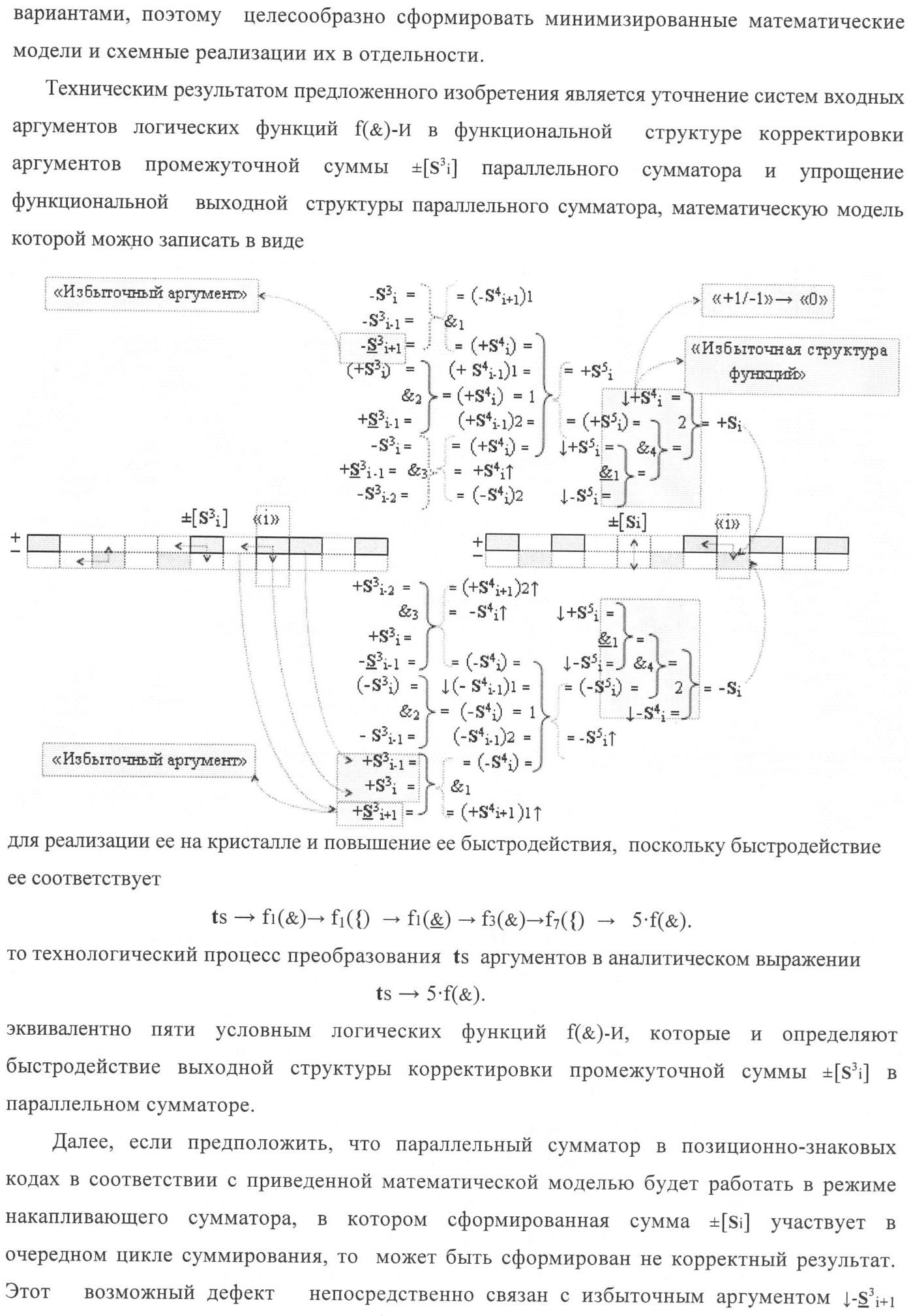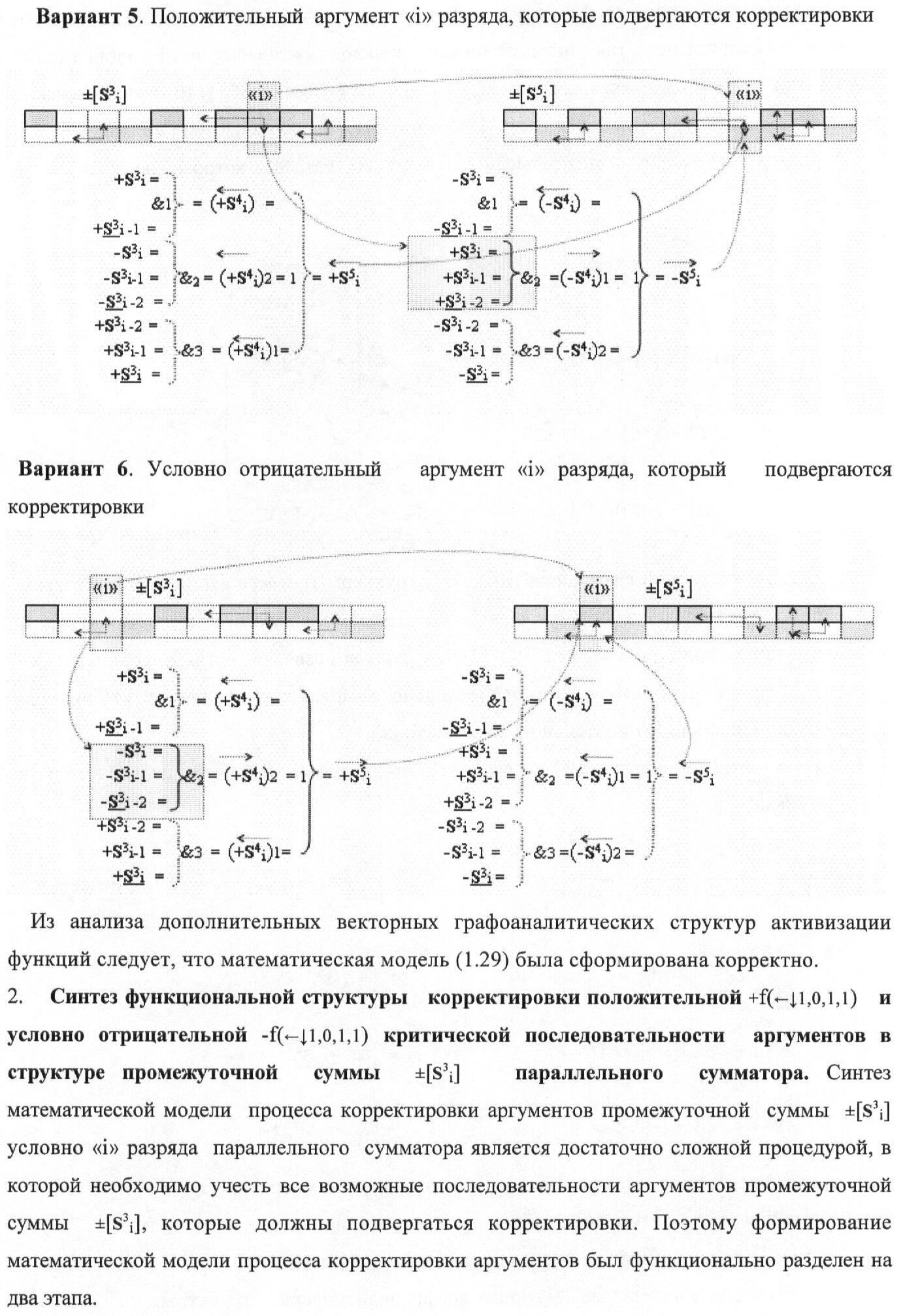 1. Функциональная структура корректировки аргументов промежуточной суммы ±[S3i] параллельного сумматора в позиционно-знаковых кодах f(+/-), условно «i» разряд которой выполнен в виде двух эквивалентных по структуре логических функций положительного и условно отрицательного каналов корректировки аргументов, и каждый канал «i» разряда включает три логические функции f1(&)-И, f3(&)-И и f4(&)-И, которые формируют преобразованные аргументы или  или и или при этом две функциональные дополнительные входные связи являются входными связями канала для приема преобразованных аргументов или и или условно «i-1» разряда, а функциональные выходные связи логических функций f1(&)-И и f4(&)-И, которые формируют преобразованный аргумент или и или условно «i» разряда также являются функциональными выходными связями канала для подачи аргумента в «i+1» разряда, при этом функциональные входные связи логической функции f1(&)-И являются функциональными входными связями канала для приема аргумента промежуточной суммы или условно «i» разряда и аргумента промежуточной суммы или условно «i-1» разряда, при этом функциональные входные связи логической функции f4(&)-И являются функциональными входными связями канала для приема аргументов промежуточной суммы или условно «i» разряда, для приема аргументов промежуточной суммы с измененным уровнем аналогового сигнала или условно «i-1» разряда и аргументов промежуточной суммы или условно «i-2» разряда, а функциональные входные связи логической функции f3(&)-И являются функциональными входными связями канала для приема аргументов промежуточной суммы или условно «i» разряда и аргументов промежуточной суммы с измененным уровнем аналогового сигнала или условно «i-1» разряда, отличающаяся тем, что в условно «i» разряда каждого канала введена логическая функция f2(&)-И, которая формирует преобразованный аргумент или логическая функция f1(}&)-ИЛИ-НЕ и логическая функция f2(}&)-ИЛИ-НЕ, которая формирует выходной аргумент результирующей суммы +Si или -Si, при этом функциональные связи логических функций в структуре сумматора выполнены в соответствии с математической моделью вида