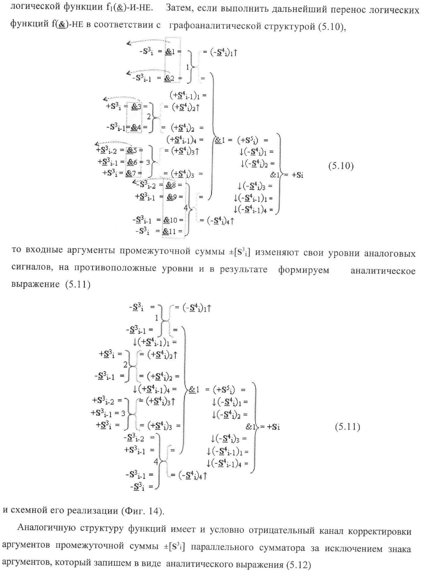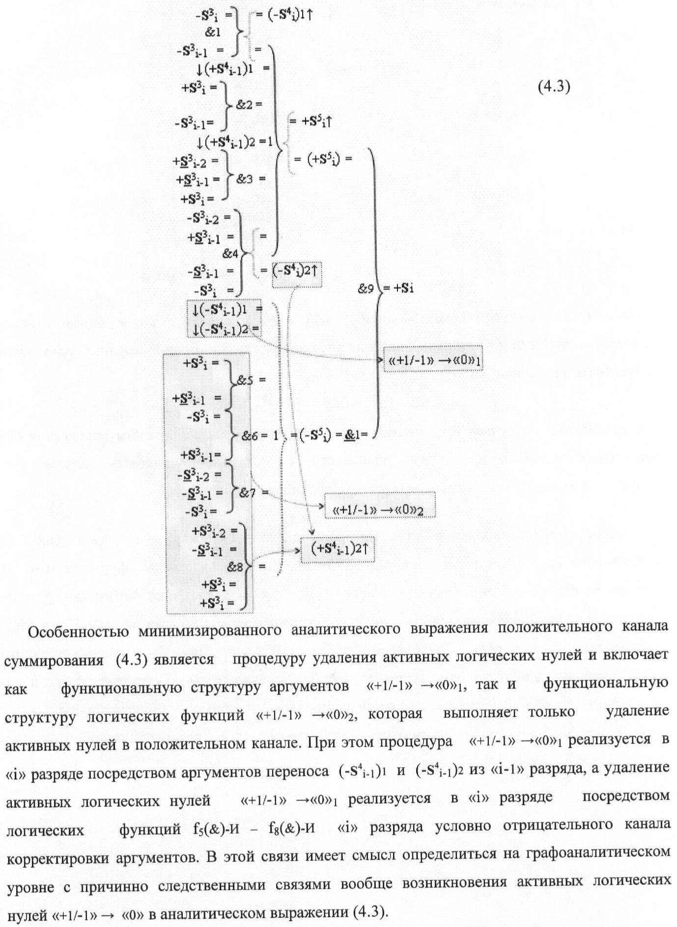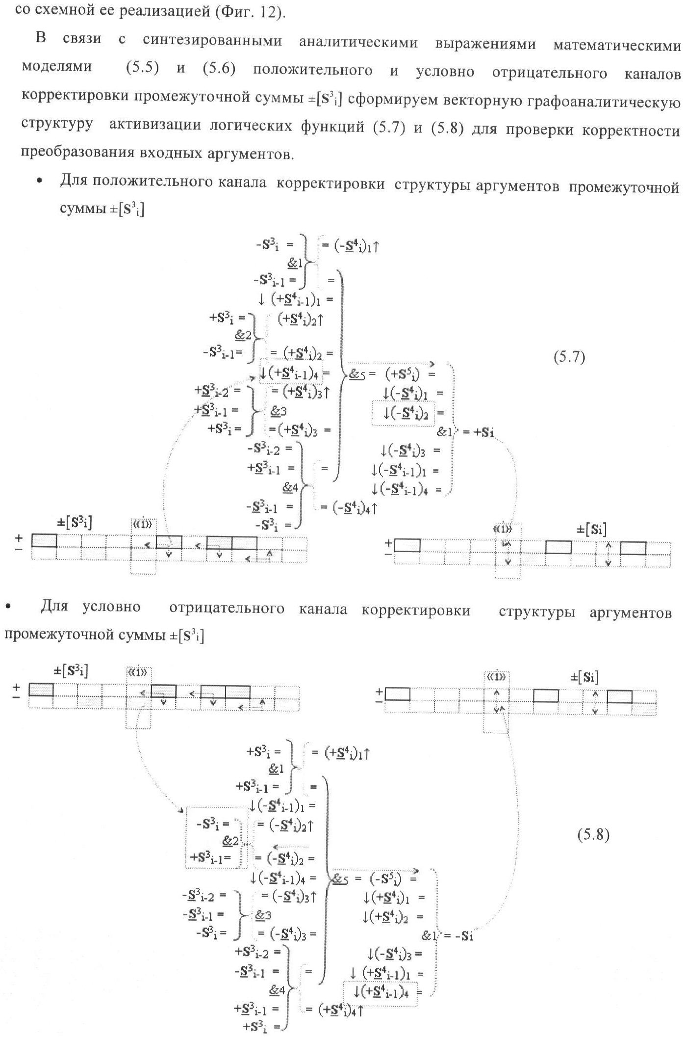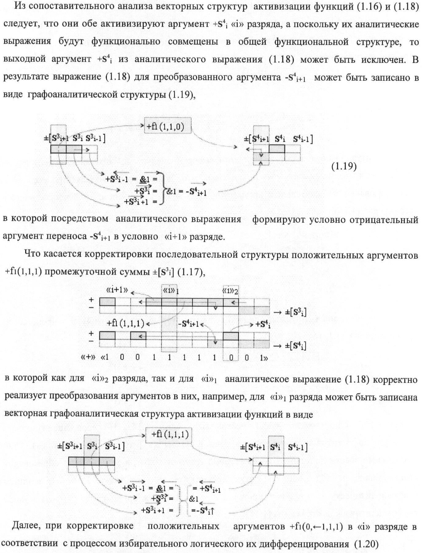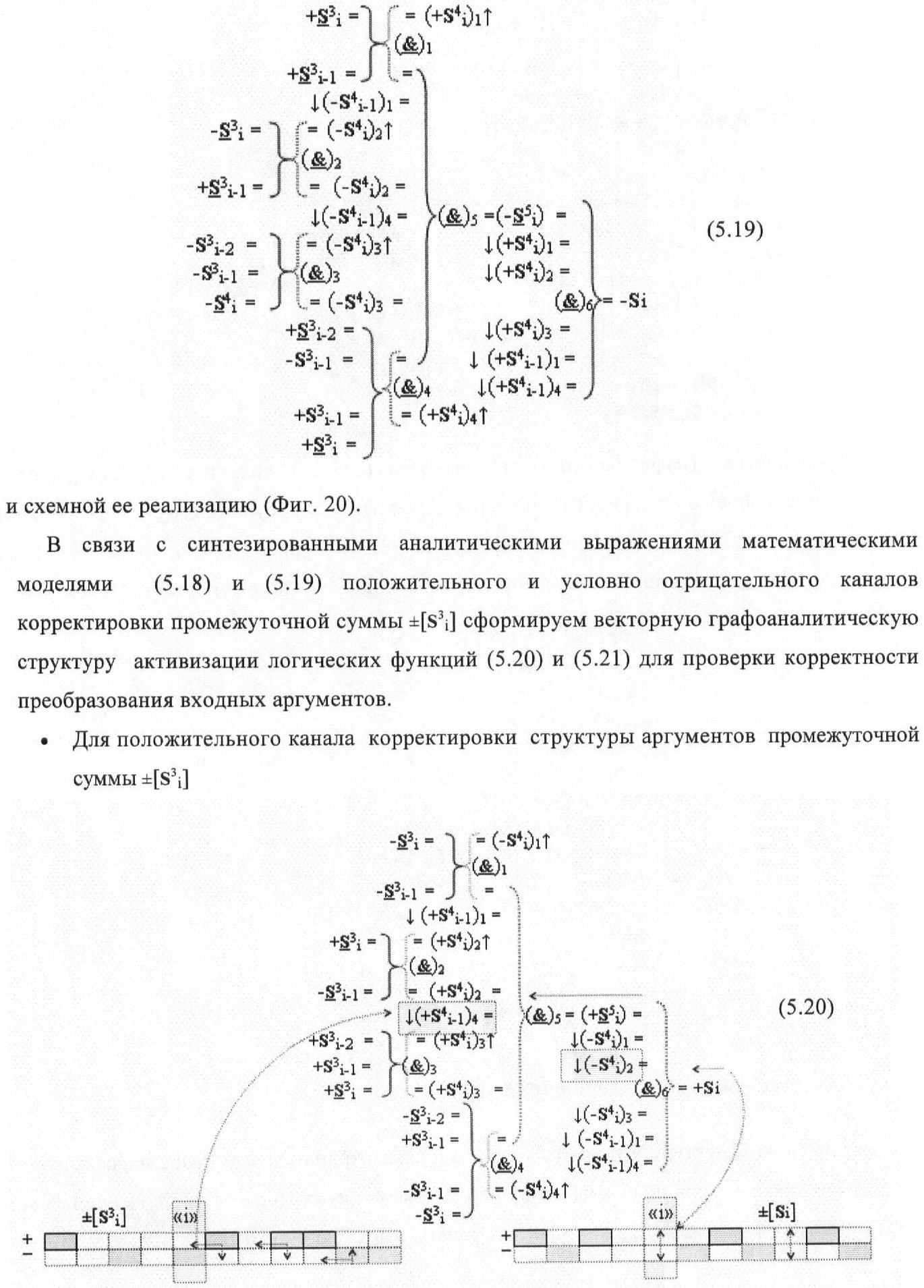 1. Функциональная структура корректировки аргументов промежуточной суммы ±[S3i] параллельного сумматора в позиционно-знаковых кодах f(+/-), условно «i» разряд которой выполнен в виде двух эквивалентных по структуре логических функций положительного и условно отрицательного каналов корректировки аргументов, и каждый канал «i» разряда включает три логические функции f1(&)-И, f3(&)-И и f4(&)-И, которые формируют преобразованные аргументы или  или и или при этом две функциональные дополнительные входные связи являются входными связями канала для приема преобразованных аргументов или и или условно «i-1» разряда, а функциональные выходные связи логических функций f1(&)-И и f4(&)-И, которые формируют преобразованный аргумент или и или условно «i» разряда также являются функциональными выходными связями канала для подачи аргумента в «i+1» разряда, при этом функциональные входные связи логической функции f1(&)-И являются функциональными входными связями канала для приема аргумента промежуточной суммы или условно «i» разряда и аргумента промежуточной суммы или условно «i-1» разряда, при этом функциональные входные связи логической функции f4(&)-И являются функциональными входными связями канала для приема аргументов промежуточной суммы или условно «i» разряда, для приема аргументов промежуточной суммы с измененным уровнем аналогового сигнала или условно «i-1» разряда и аргументов промежуточной суммы или условно «i-2» разряда, а функциональные входные связи логической функции f3(&)-И являются функциональными входными связями канала для приема аргументов промежуточной суммы или условно «i» разряда и аргументов промежуточной суммы с измененным уровнем аналогового сигнала или условно «i-1» разряда, отличающаяся тем, что в условно «i» разряда каждого канала введена логическая функция f2(&)-И, которая формирует преобразованный аргумент или логическая функция f1(}&)-ИЛИ-НЕ и логическая функция f2(}&)-ИЛИ-НЕ, которая формирует выходной аргумент результирующей суммы +Si или -Si, при этом функциональные связи логических функций в структуре сумматора выполнены в соответствии с математической моделью вида