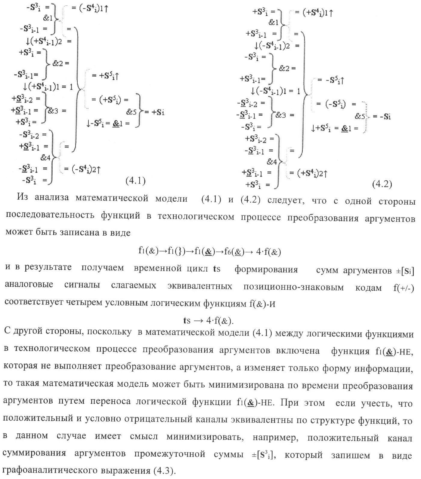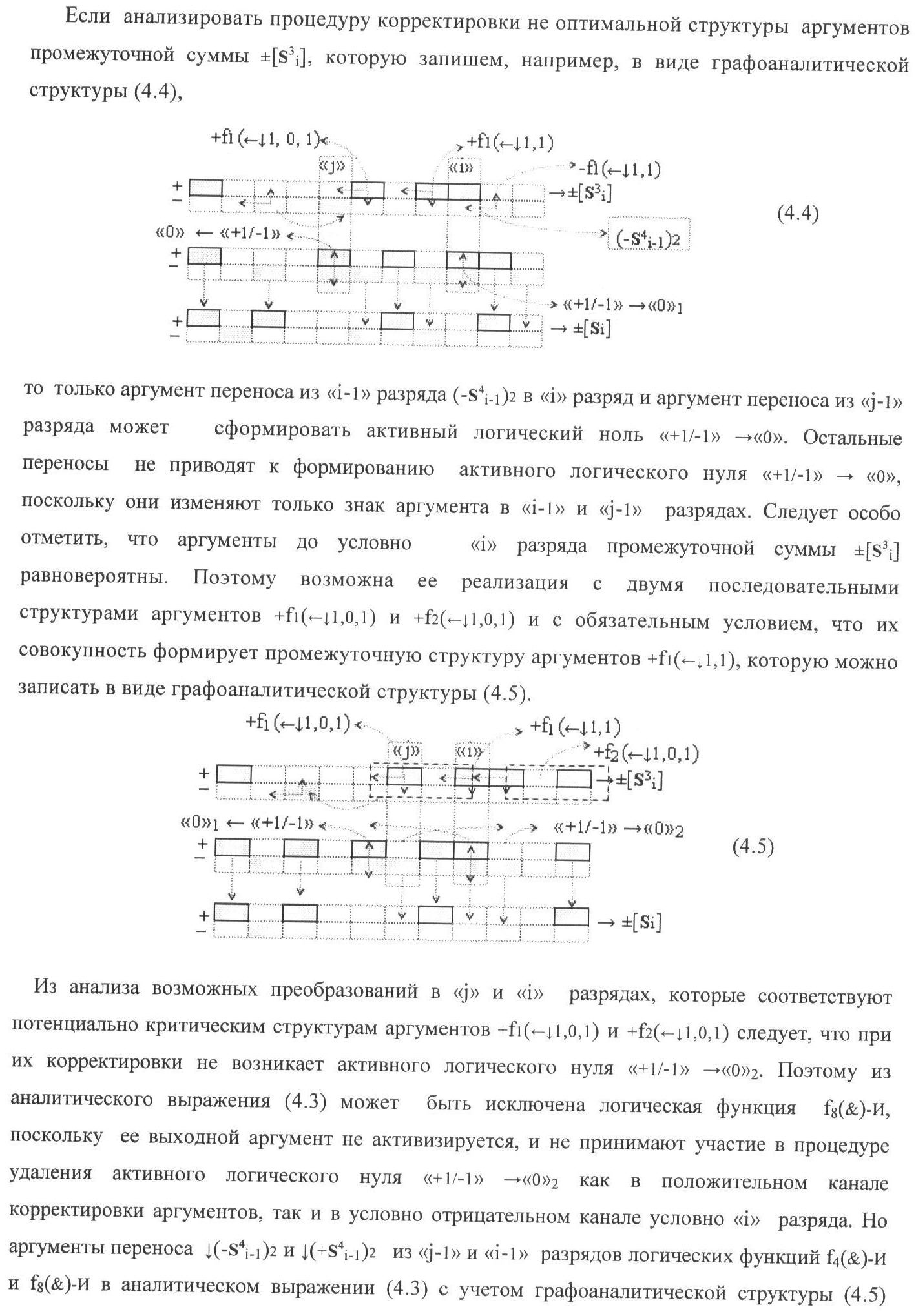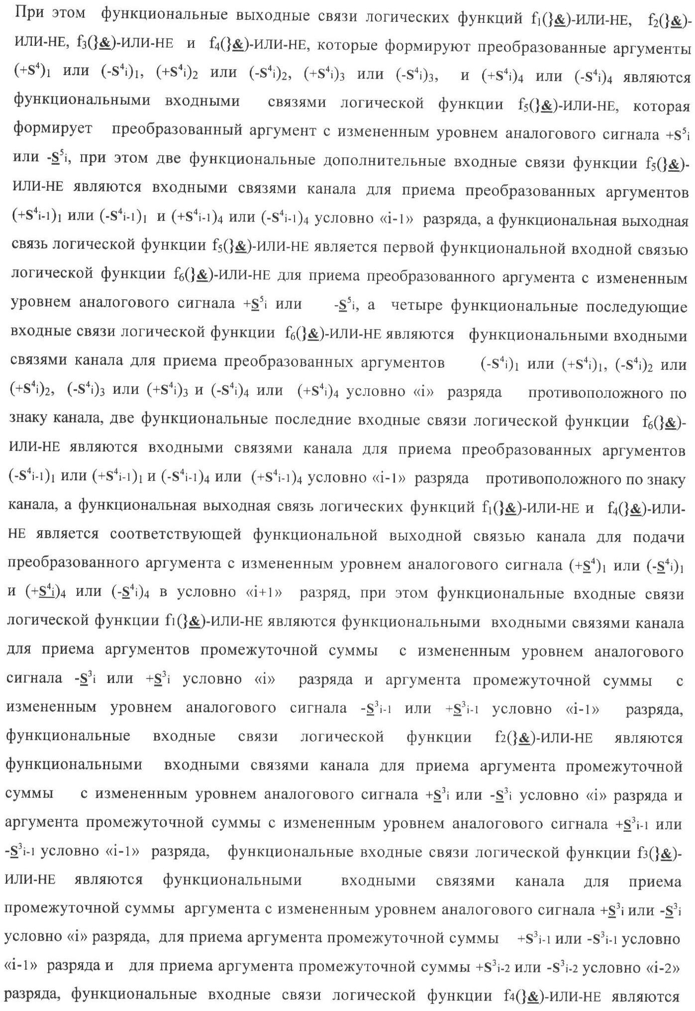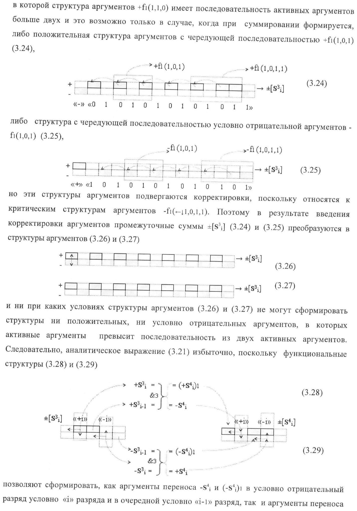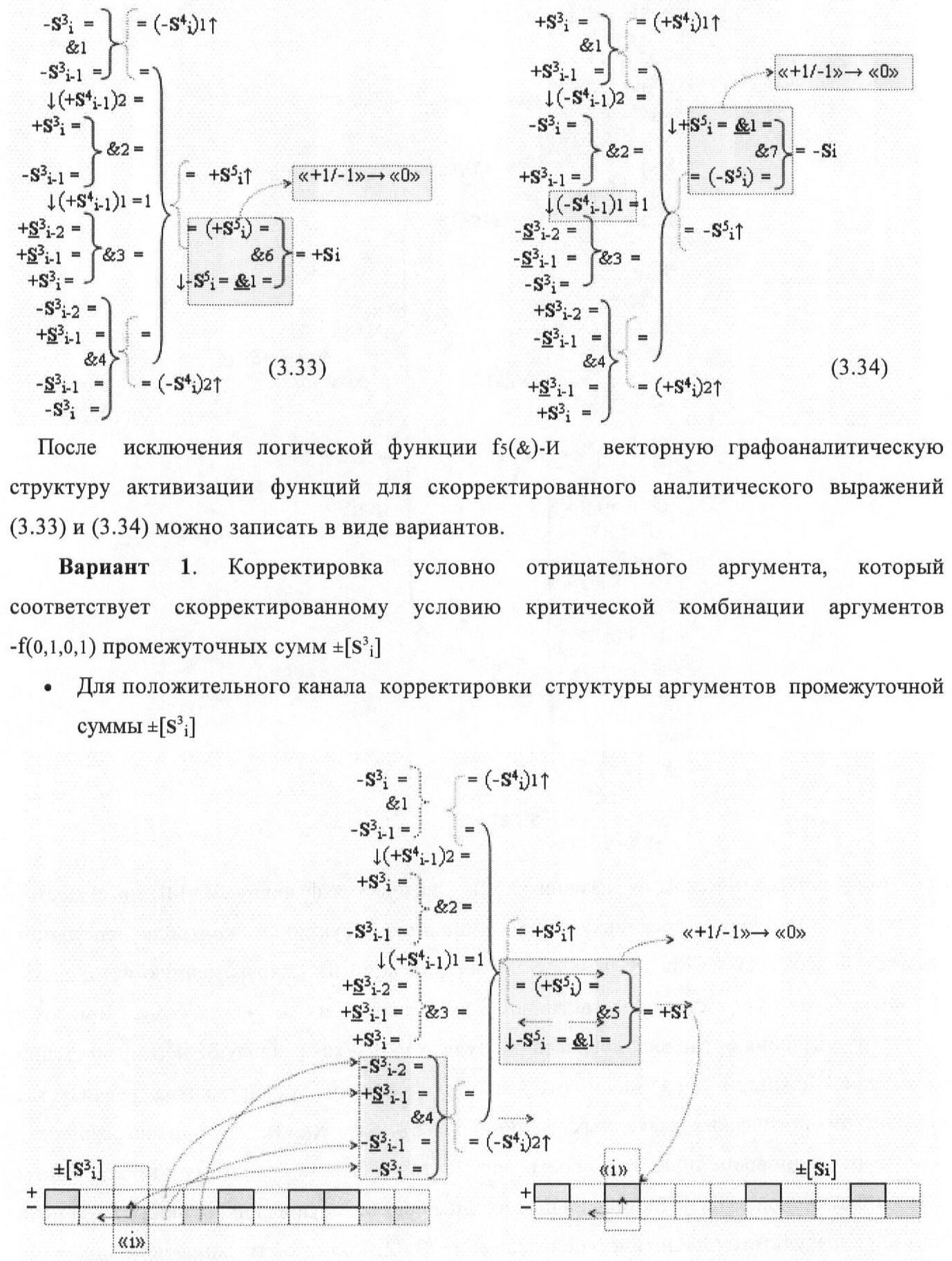1. Функциональная структура корректировки аргументов промежуточной суммы ±[S3i] параллельного сумматора в позиционно-знаковых кодах f(+/-), условно «i» разряд которой выполнен в виде двух эквивалентных по структуре логических функций положительного и условно отрицательного каналов корректировки аргументов, и каждый канал «i» разряда включает три логические функции f1(&)-И, f3(&)-И и f4(&)-И, которые формируют преобразованные аргументы или  или и или при этом две функциональные дополнительные входные связи являются входными связями канала для приема преобразованных аргументов или и или условно «i-1» разряда, а функциональные выходные связи логических функций f1(&)-И и f4(&)-И, которые формируют преобразованный аргумент или и или условно «i» разряда также являются функциональными выходными связями канала для подачи аргумента в «i+1» разряда, при этом функциональные входные связи логической функции f1(&)-И являются функциональными входными связями канала для приема аргумента промежуточной суммы или условно «i» разряда и аргумента промежуточной суммы или условно «i-1» разряда, при этом функциональные входные связи логической функции f4(&)-И являются функциональными входными связями канала для приема аргументов промежуточной суммы или условно «i» разряда, для приема аргументов промежуточной суммы с измененным уровнем аналогового сигнала или условно «i-1» разряда и аргументов промежуточной суммы или условно «i-2» разряда, а функциональные входные связи логической функции f3(&)-И являются функциональными входными связями канала для приема аргументов промежуточной суммы или условно «i» разряда и аргументов промежуточной суммы с измененным уровнем аналогового сигнала или условно «i-1» разряда, отличающаяся тем, что в условно «i» разряда каждого канала введена логическая функция f2(&)-И, которая формирует преобразованный аргумент или логическая функция f1(}&)-ИЛИ-НЕ и логическая функция f2(}&)-ИЛИ-НЕ, которая формирует выходной аргумент результирующей суммы +Si или -Si, при этом функциональные связи логических функций в структуре сумматора выполнены в соответствии с математической моделью вида