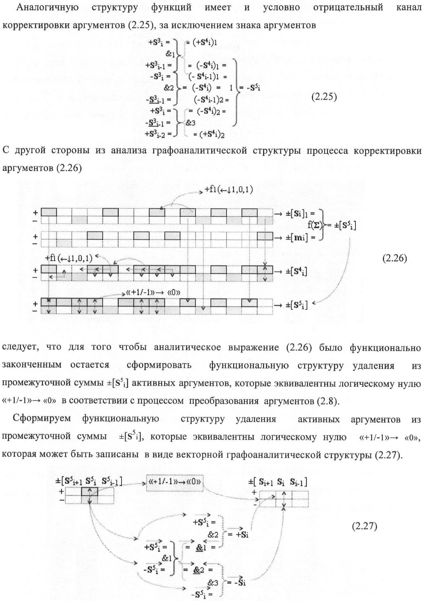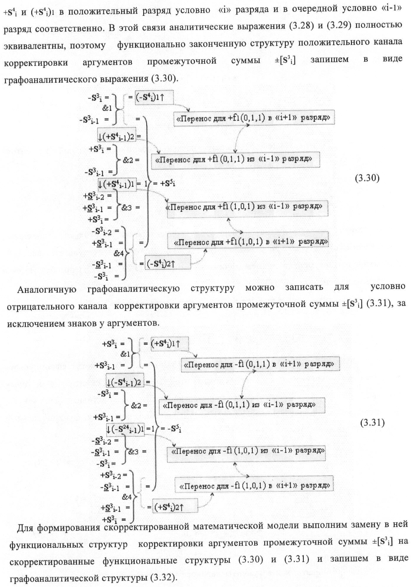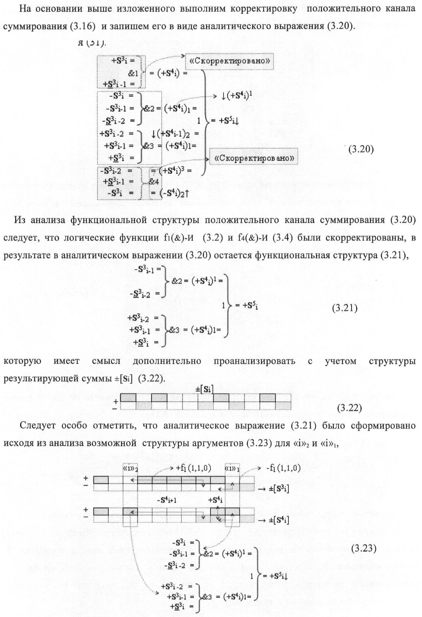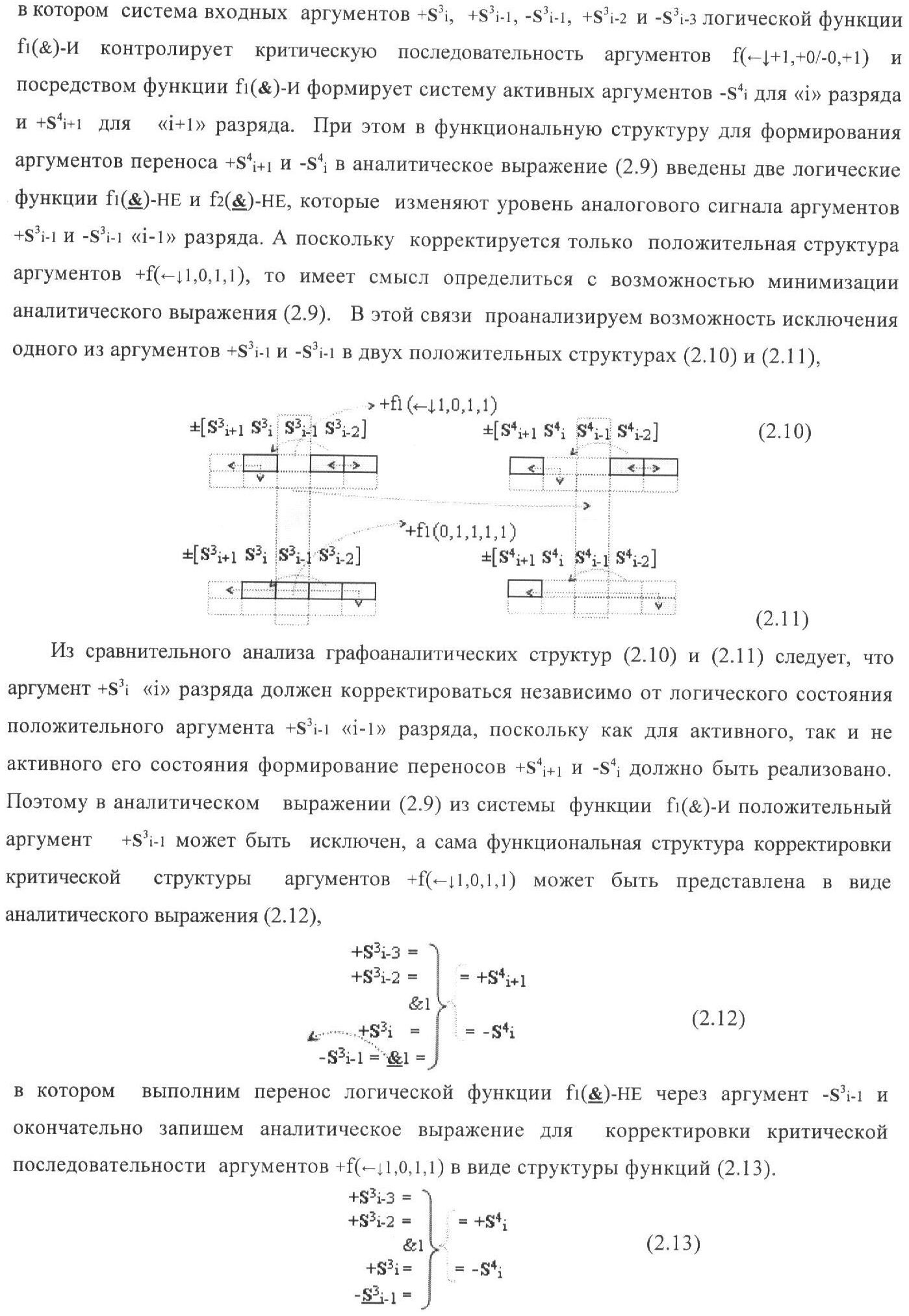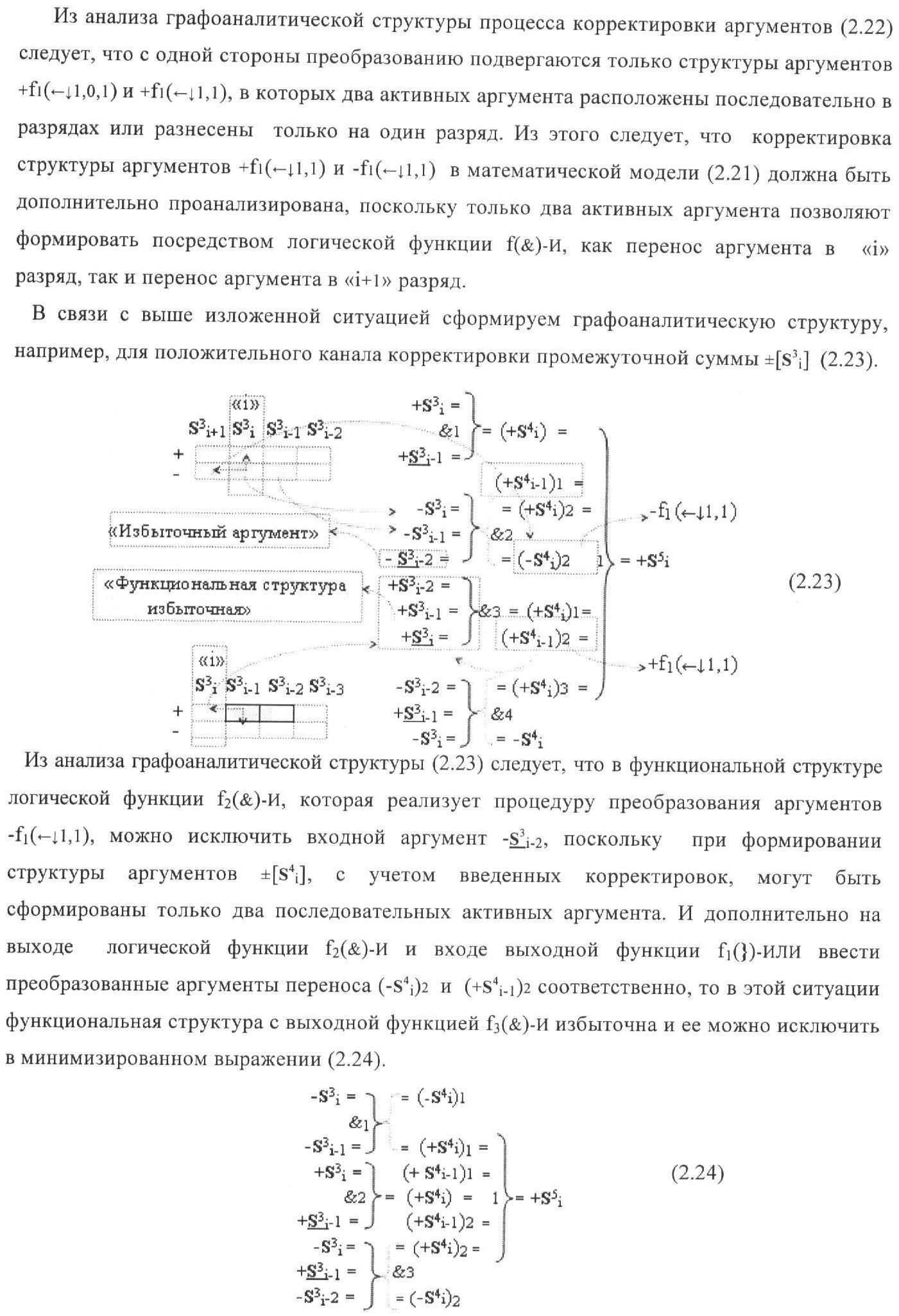 1. Функциональная структура корректировки аргументов промежуточной суммы ±[S3i] параллельного сумматора в позиционно-знаковых кодах f(+/-), условно «i» разряд которой выполнен в виде двух эквивалентных по структуре логических функций положительного и условно отрицательного каналов корректировки аргументов, и каждый канал «i» разряда включает три логические функции f1(&)-И, f3(&)-И и f4(&)-И, которые формируют преобразованные аргументы или  или и или при этом две функциональные дополнительные входные связи являются входными связями канала для приема преобразованных аргументов или и или условно «i-1» разряда, а функциональные выходные связи логических функций f1(&)-И и f4(&)-И, которые формируют преобразованный аргумент или и или условно «i» разряда также являются функциональными выходными связями канала для подачи аргумента в «i+1» разряда, при этом функциональные входные связи логической функции f1(&)-И являются функциональными входными связями канала для приема аргумента промежуточной суммы или условно «i» разряда и аргумента промежуточной суммы или условно «i-1» разряда, при этом функциональные входные связи логической функции f4(&)-И являются функциональными входными связями канала для приема аргументов промежуточной суммы или условно «i» разряда, для приема аргументов промежуточной суммы с измененным уровнем аналогового сигнала или условно «i-1» разряда и аргументов промежуточной суммы или условно «i-2» разряда, а функциональные входные связи логической функции f3(&)-И являются функциональными входными связями канала для приема аргументов промежуточной суммы или условно «i» разряда и аргументов промежуточной суммы с измененным уровнем аналогового сигнала или условно «i-1» разряда, отличающаяся тем, что в условно «i» разряда каждого канала введена логическая функция f2(&)-И, которая формирует преобразованный аргумент или логическая функция f1(}&)-ИЛИ-НЕ и логическая функция f2(}&)-ИЛИ-НЕ, которая формирует выходной аргумент результирующей суммы +Si или -Si, при этом функциональные связи логических функций в структуре сумматора выполнены в соответствии с математической моделью вида