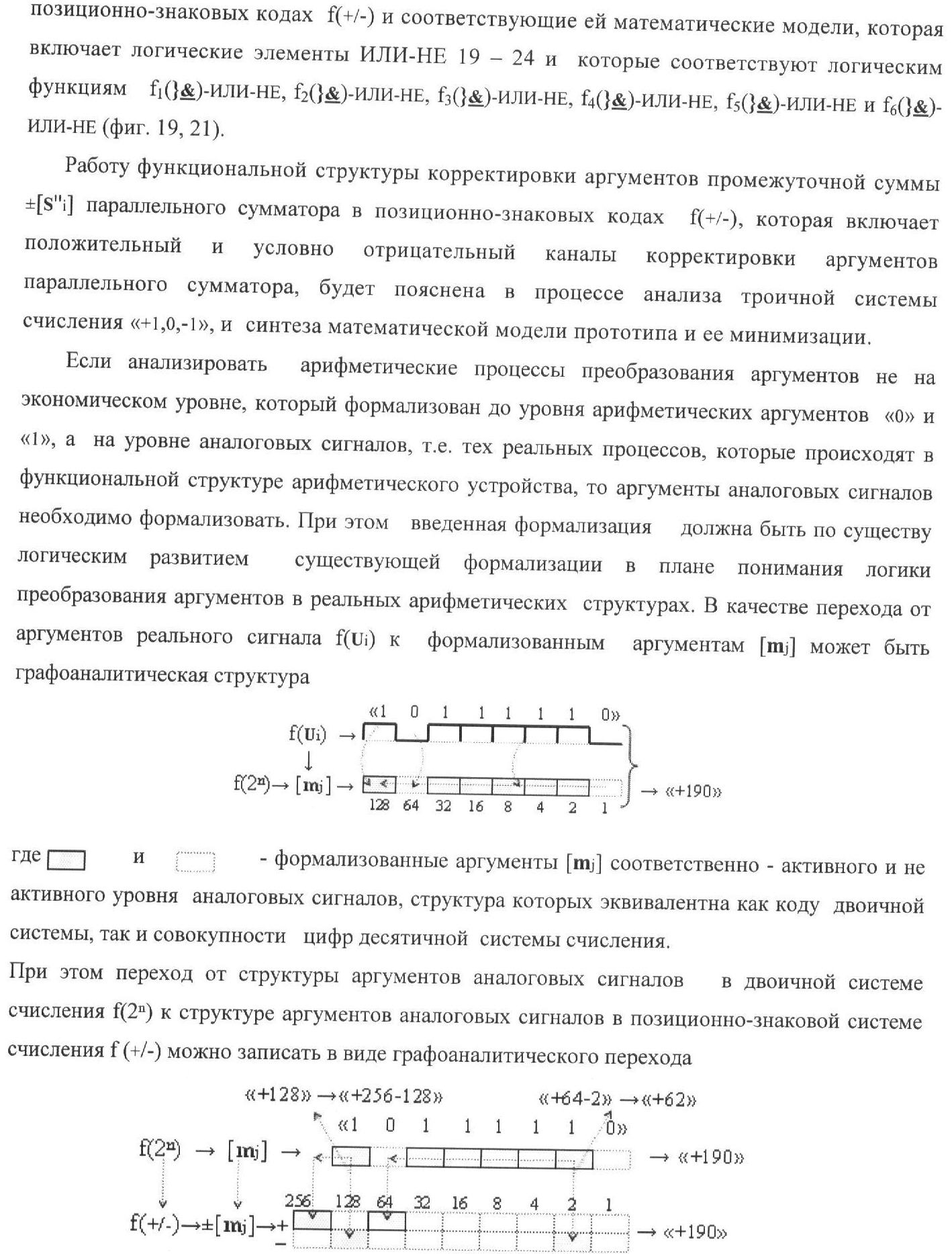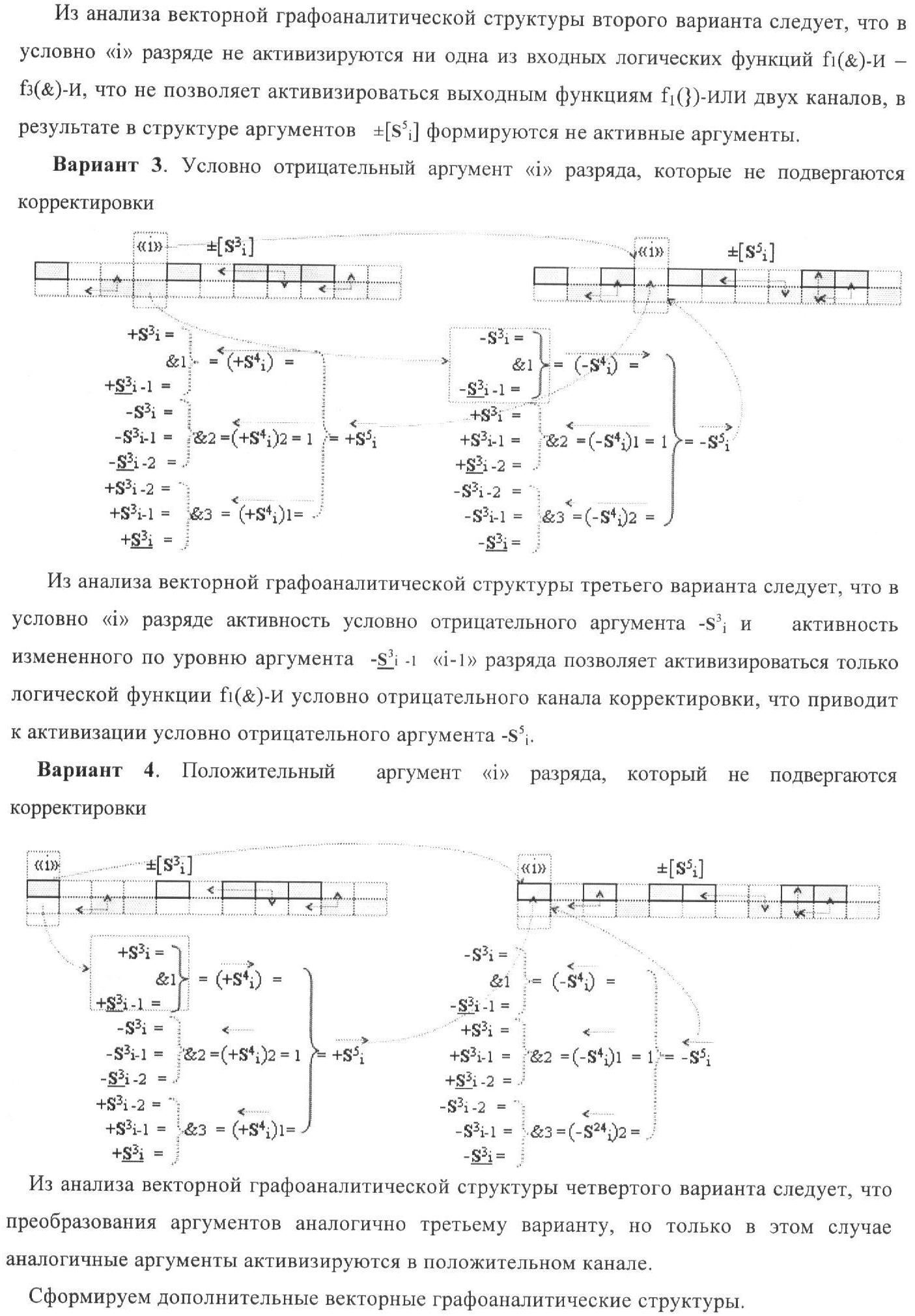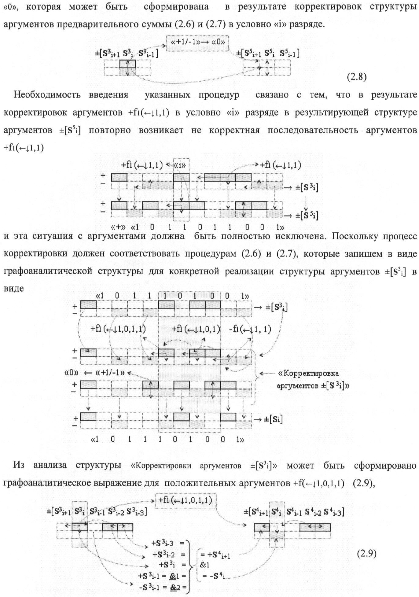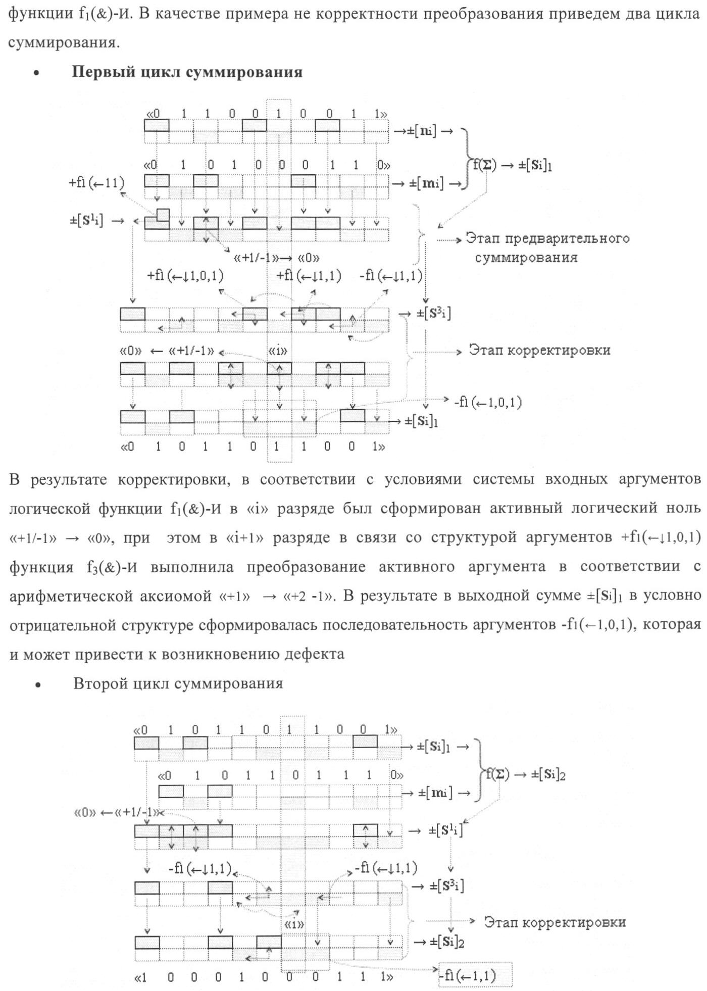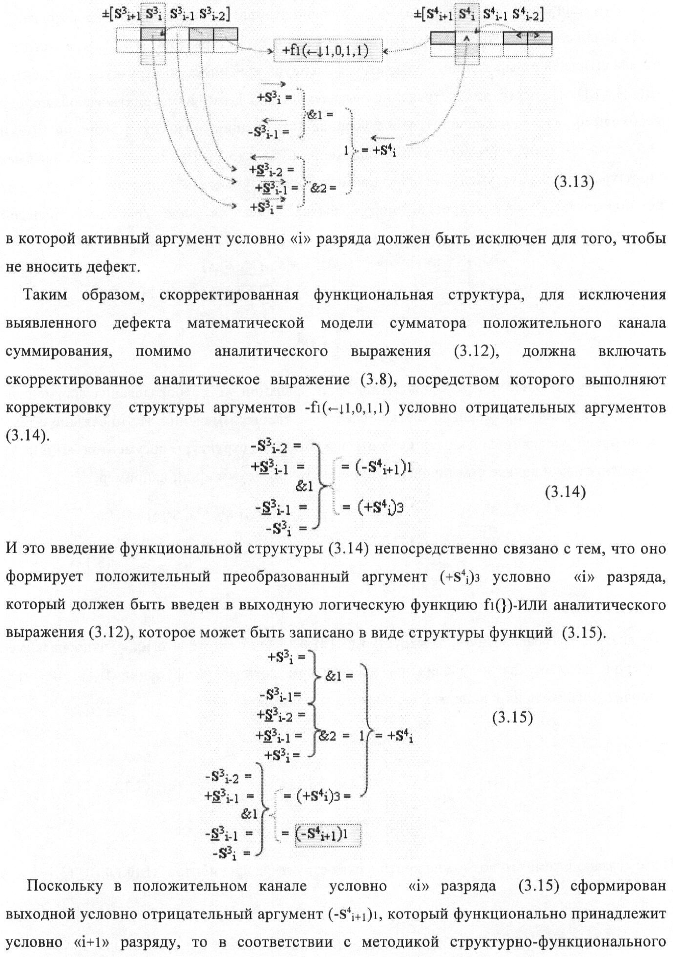 1. Функциональная структура корректировки аргументов промежуточной суммы ±[S3i] параллельного сумматора в позиционно-знаковых кодах f(+/-), условно «i» разряд которой выполнен в виде двух эквивалентных по структуре логических функций положительного и условно отрицательного каналов корректировки аргументов, и каждый канал «i» разряда включает три логические функции f1(&)-И, f3(&)-И и f4(&)-И, которые формируют преобразованные аргументы или  или и или при этом две функциональные дополнительные входные связи являются входными связями канала для приема преобразованных аргументов или и или условно «i-1» разряда, а функциональные выходные связи логических функций f1(&)-И и f4(&)-И, которые формируют преобразованный аргумент или и или условно «i» разряда также являются функциональными выходными связями канала для подачи аргумента в «i+1» разряда, при этом функциональные входные связи логической функции f1(&)-И являются функциональными входными связями канала для приема аргумента промежуточной суммы или условно «i» разряда и аргумента промежуточной суммы или условно «i-1» разряда, при этом функциональные входные связи логической функции f4(&)-И являются функциональными входными связями канала для приема аргументов промежуточной суммы или условно «i» разряда, для приема аргументов промежуточной суммы с измененным уровнем аналогового сигнала или условно «i-1» разряда и аргументов промежуточной суммы или условно «i-2» разряда, а функциональные входные связи логической функции f3(&)-И являются функциональными входными связями канала для приема аргументов промежуточной суммы или условно «i» разряда и аргументов промежуточной суммы с измененным уровнем аналогового сигнала или условно «i-1» разряда, отличающаяся тем, что в условно «i» разряда каждого канала введена логическая функция f2(&)-И, которая формирует преобразованный аргумент или логическая функция f1(}&)-ИЛИ-НЕ и логическая функция f2(}&)-ИЛИ-НЕ, которая формирует выходной аргумент результирующей суммы +Si или -Si, при этом функциональные связи логических функций в структуре сумматора выполнены в соответствии с математической моделью вида