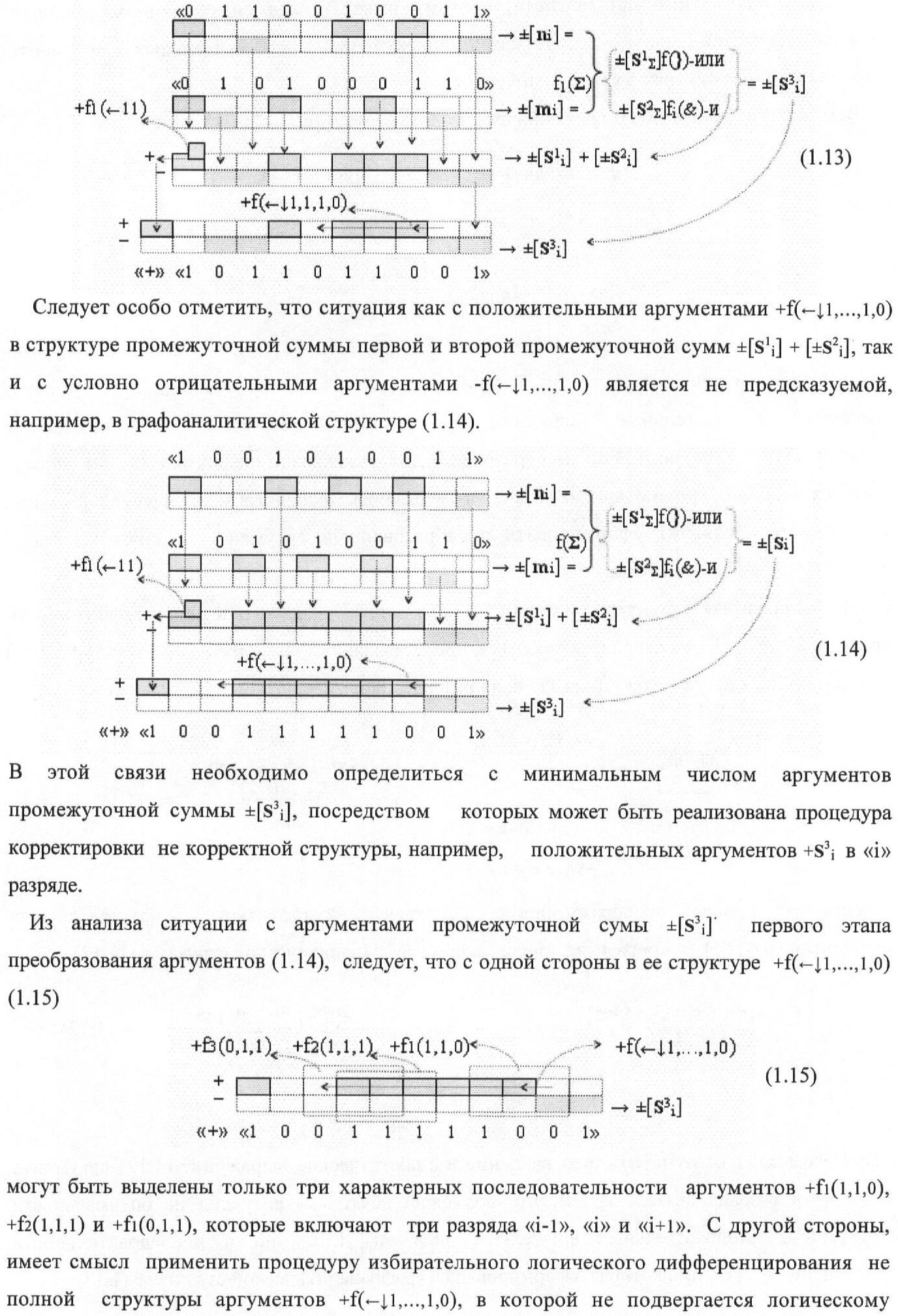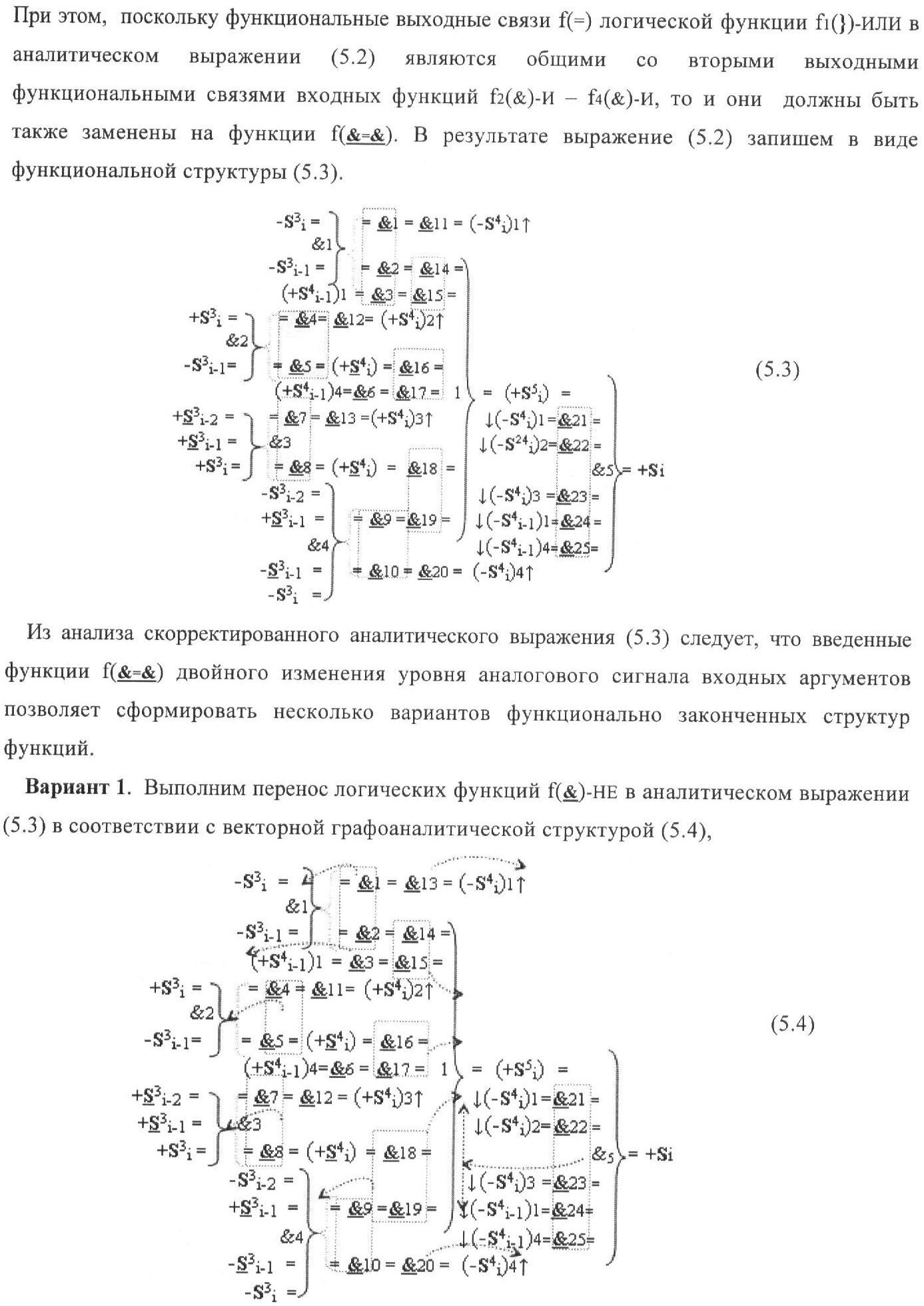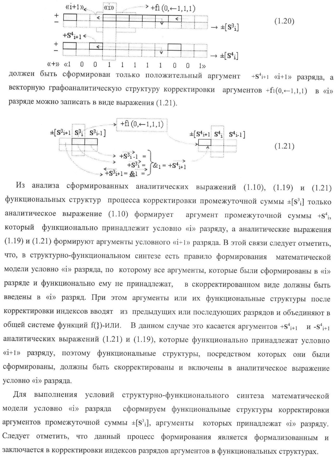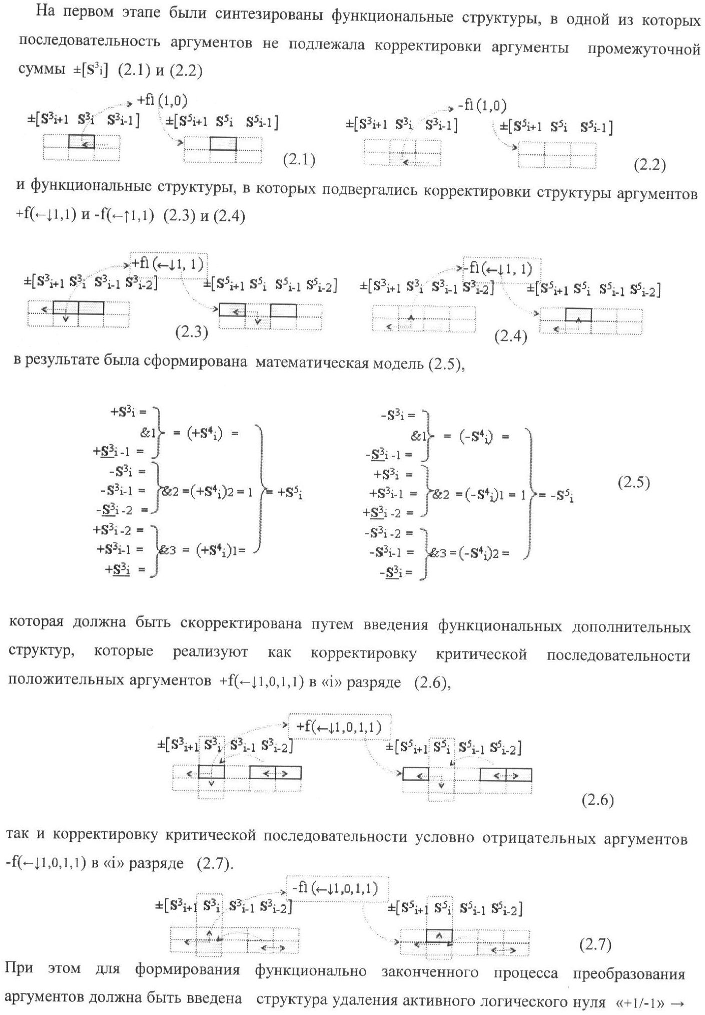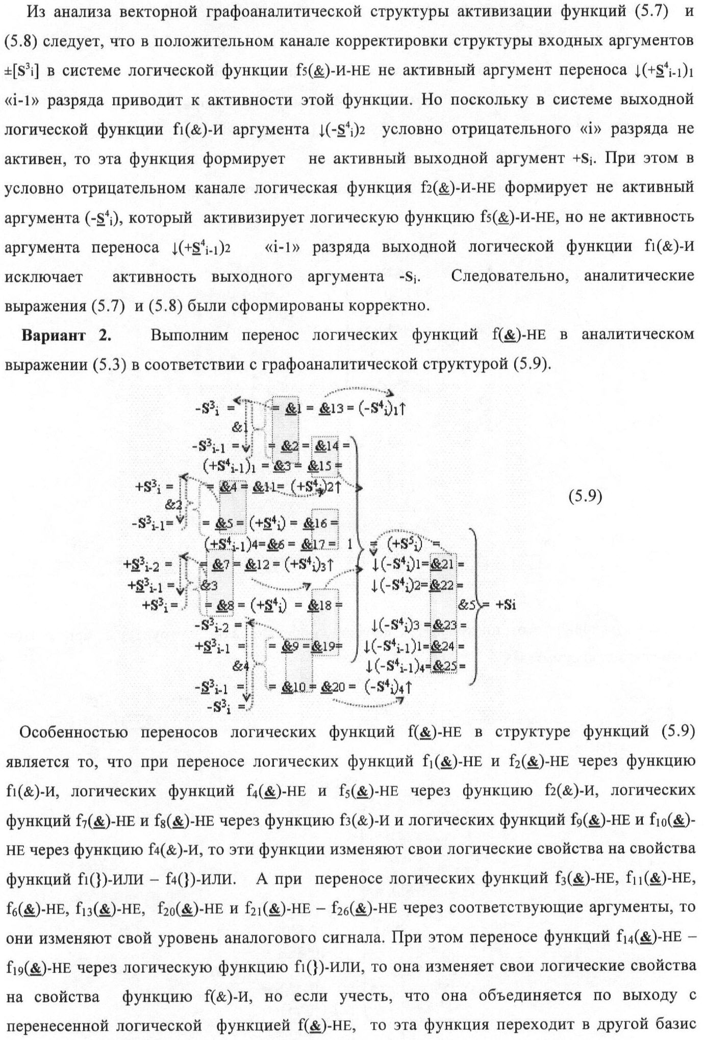 1. Функциональная структура корректировки аргументов промежуточной суммы ±[S3i] параллельного сумматора в позиционно-знаковых кодах f(+/-), условно «i» разряд которой выполнен в виде двух эквивалентных по структуре логических функций положительного и условно отрицательного каналов корректировки аргументов, и каждый канал «i» разряда включает три логические функции f1(&)-И, f3(&)-И и f4(&)-И, которые формируют преобразованные аргументы или  или и или при этом две функциональные дополнительные входные связи являются входными связями канала для приема преобразованных аргументов или и или условно «i-1» разряда, а функциональные выходные связи логических функций f1(&)-И и f4(&)-И, которые формируют преобразованный аргумент или и или условно «i» разряда также являются функциональными выходными связями канала для подачи аргумента в «i+1» разряда, при этом функциональные входные связи логической функции f1(&)-И являются функциональными входными связями канала для приема аргумента промежуточной суммы или условно «i» разряда и аргумента промежуточной суммы или условно «i-1» разряда, при этом функциональные входные связи логической функции f4(&)-И являются функциональными входными связями канала для приема аргументов промежуточной суммы или условно «i» разряда, для приема аргументов промежуточной суммы с измененным уровнем аналогового сигнала или условно «i-1» разряда и аргументов промежуточной суммы или условно «i-2» разряда, а функциональные входные связи логической функции f3(&)-И являются функциональными входными связями канала для приема аргументов промежуточной суммы или условно «i» разряда и аргументов промежуточной суммы с измененным уровнем аналогового сигнала или условно «i-1» разряда, отличающаяся тем, что в условно «i» разряда каждого канала введена логическая функция f2(&)-И, которая формирует преобразованный аргумент или логическая функция f1(}&)-ИЛИ-НЕ и логическая функция f2(}&)-ИЛИ-НЕ, которая формирует выходной аргумент результирующей суммы +Si или -Si, при этом функциональные связи логических функций в структуре сумматора выполнены в соответствии с математической моделью вида