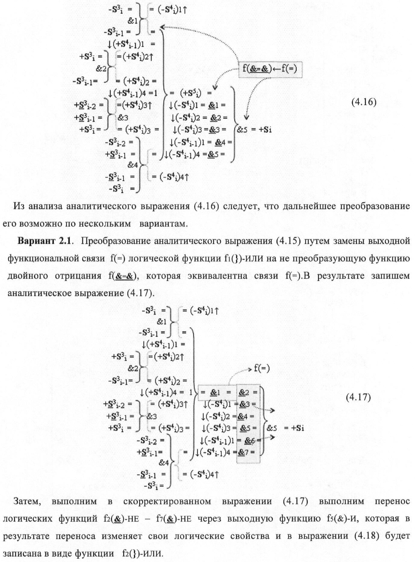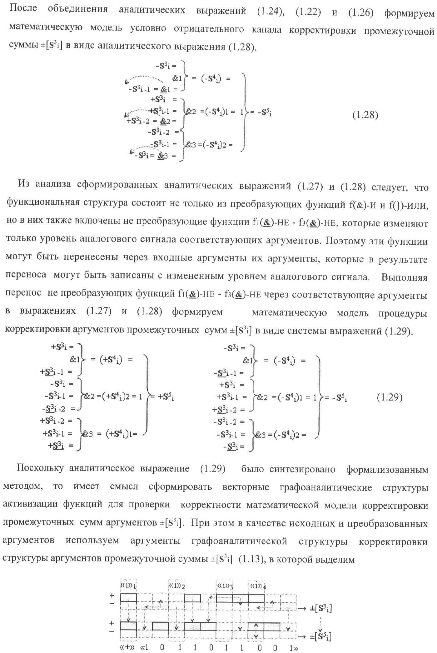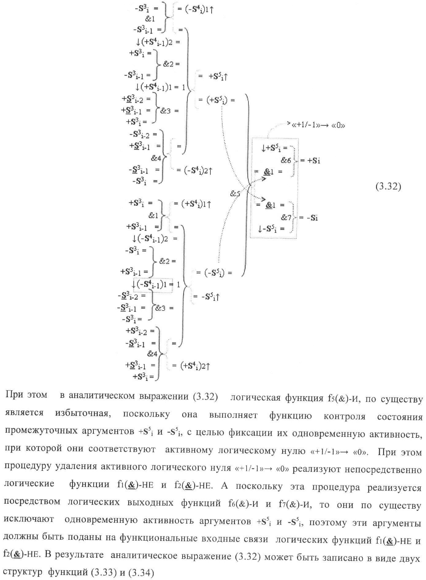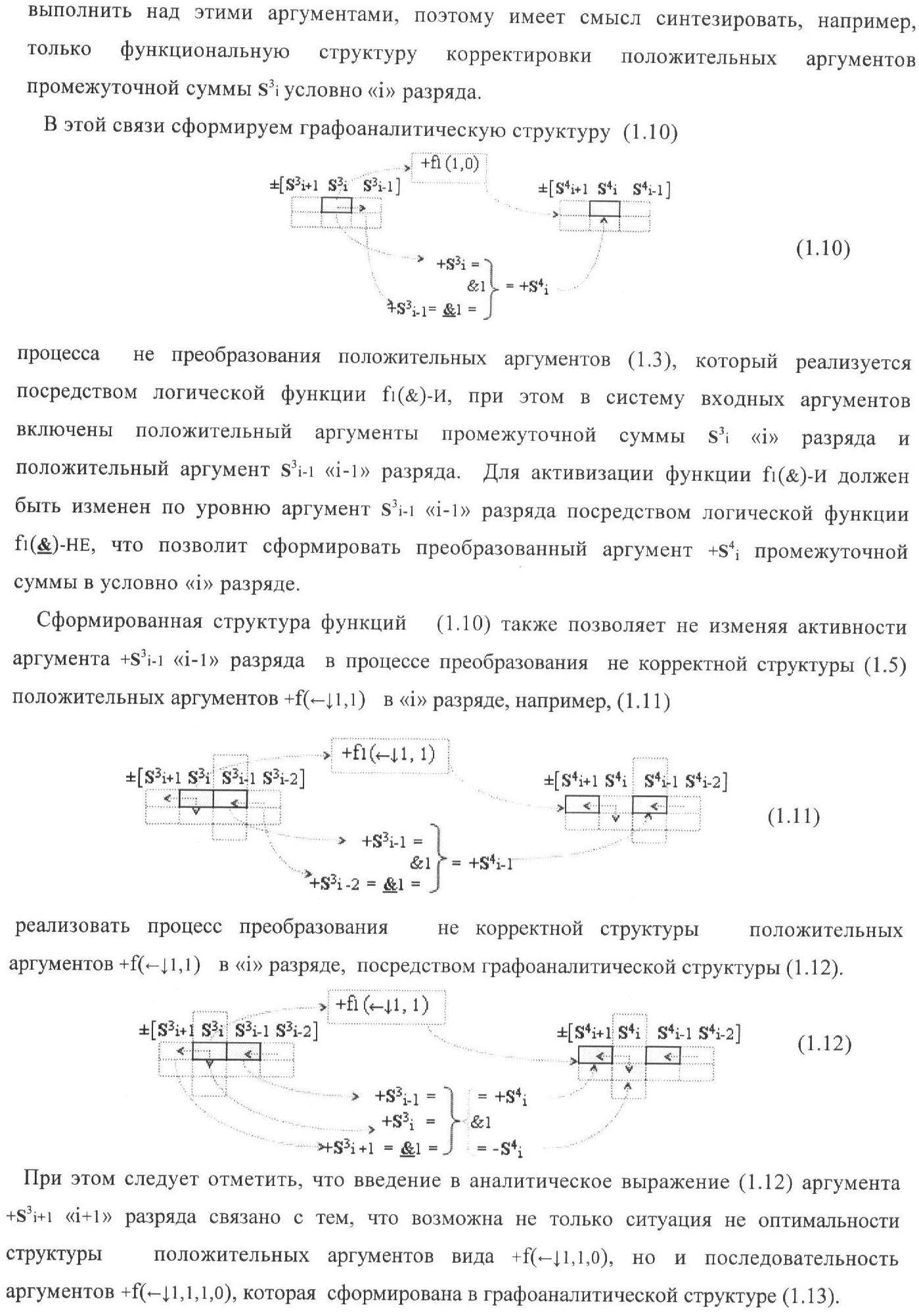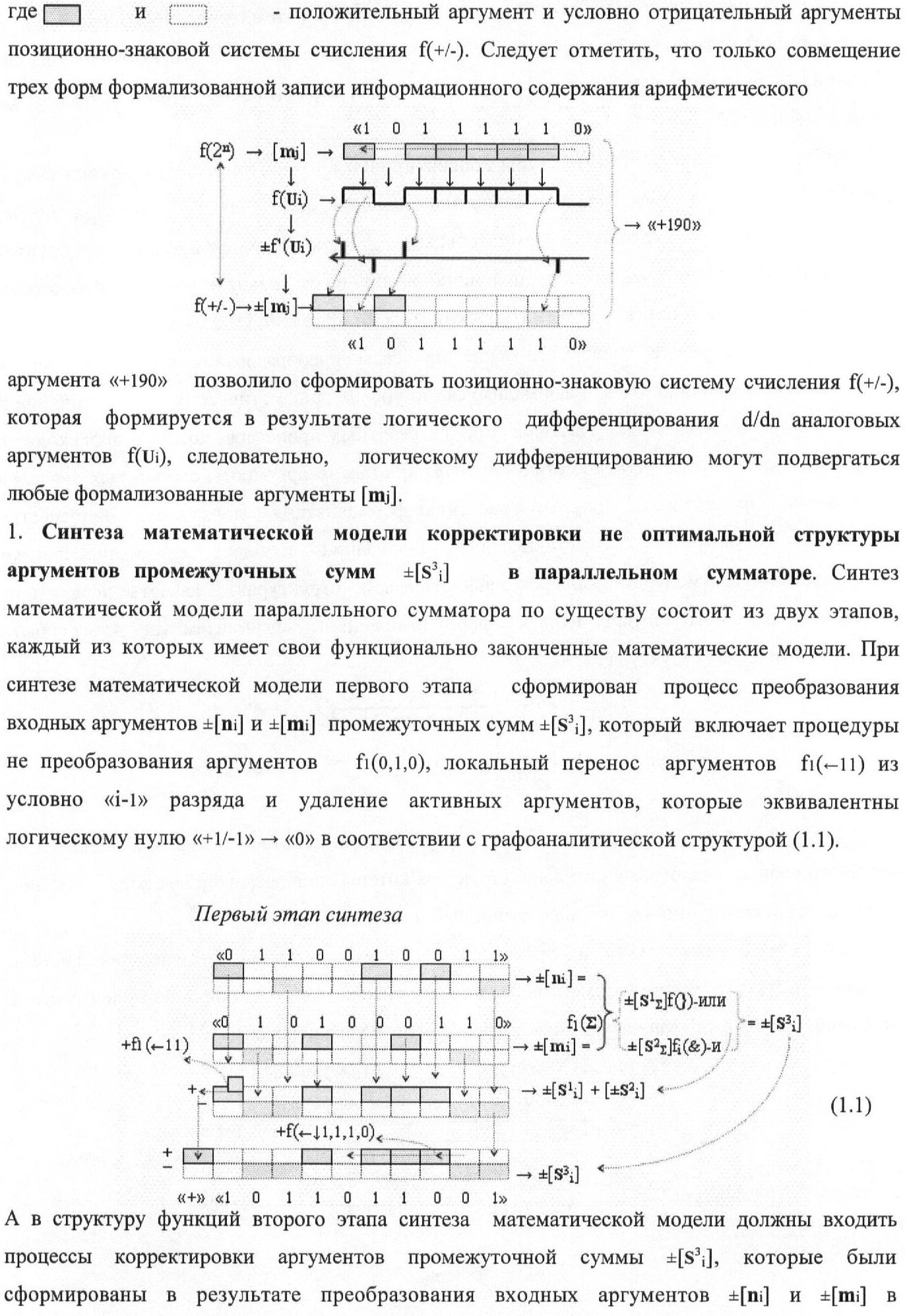 1. Функциональная структура корректировки аргументов промежуточной суммы ±[S3i] параллельного сумматора в позиционно-знаковых кодах f(+/-), условно «i» разряд которой выполнен в виде двух эквивалентных по структуре логических функций положительного и условно отрицательного каналов корректировки аргументов, и каждый канал «i» разряда включает три логические функции f1(&)-И, f3(&)-И и f4(&)-И, которые формируют преобразованные аргументы или  или и или при этом две функциональные дополнительные входные связи являются входными связями канала для приема преобразованных аргументов или и или условно «i-1» разряда, а функциональные выходные связи логических функций f1(&)-И и f4(&)-И, которые формируют преобразованный аргумент или и или условно «i» разряда также являются функциональными выходными связями канала для подачи аргумента в «i+1» разряда, при этом функциональные входные связи логической функции f1(&)-И являются функциональными входными связями канала для приема аргумента промежуточной суммы или условно «i» разряда и аргумента промежуточной суммы или условно «i-1» разряда, при этом функциональные входные связи логической функции f4(&)-И являются функциональными входными связями канала для приема аргументов промежуточной суммы или условно «i» разряда, для приема аргументов промежуточной суммы с измененным уровнем аналогового сигнала или условно «i-1» разряда и аргументов промежуточной суммы или условно «i-2» разряда, а функциональные входные связи логической функции f3(&)-И являются функциональными входными связями канала для приема аргументов промежуточной суммы или условно «i» разряда и аргументов промежуточной суммы с измененным уровнем аналогового сигнала или условно «i-1» разряда, отличающаяся тем, что в условно «i» разряда каждого канала введена логическая функция f2(&)-И, которая формирует преобразованный аргумент или логическая функция f1(}&)-ИЛИ-НЕ и логическая функция f2(}&)-ИЛИ-НЕ, которая формирует выходной аргумент результирующей суммы +Si или -Si, при этом функциональные связи логических функций в структуре сумматора выполнены в соответствии с математической моделью вида