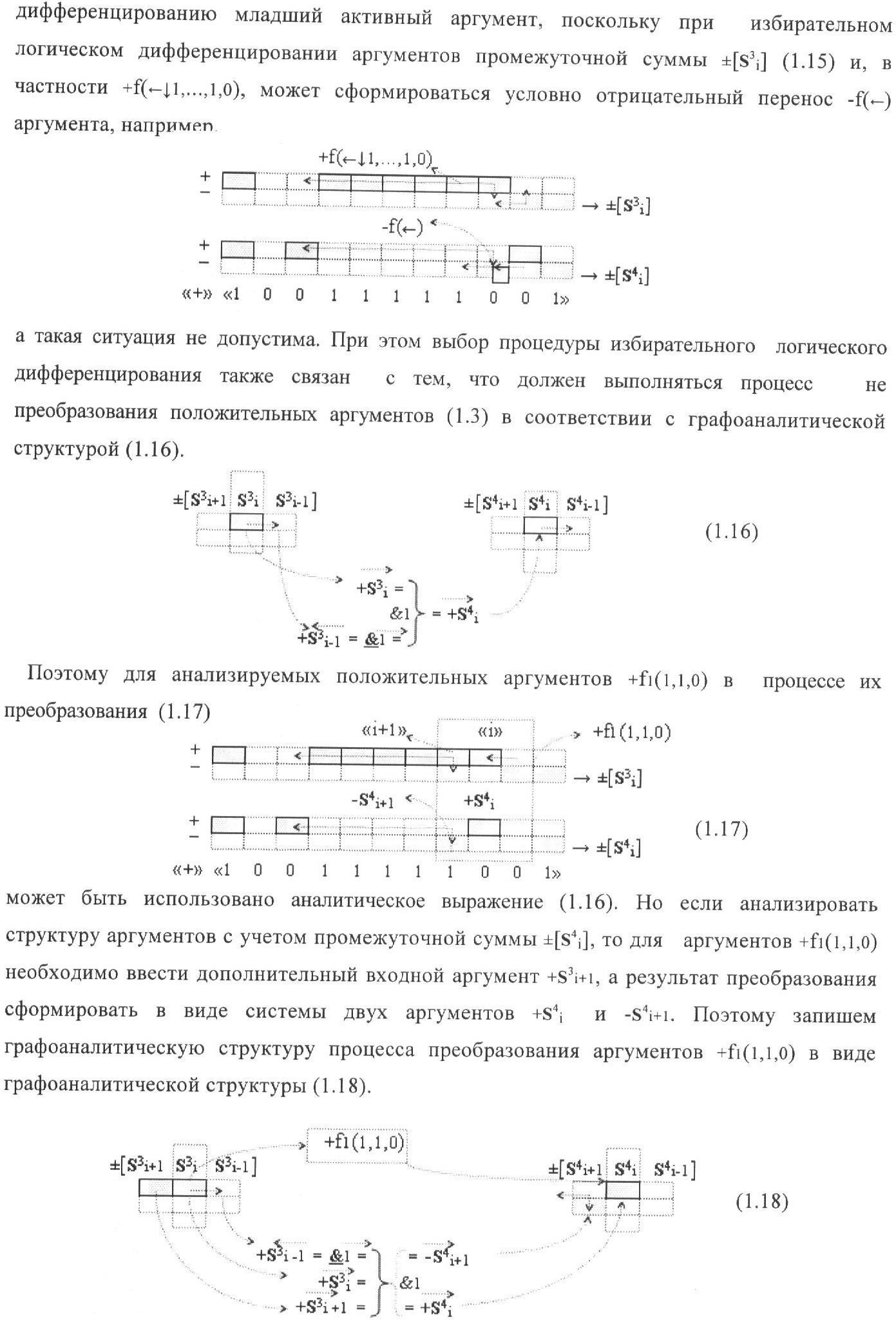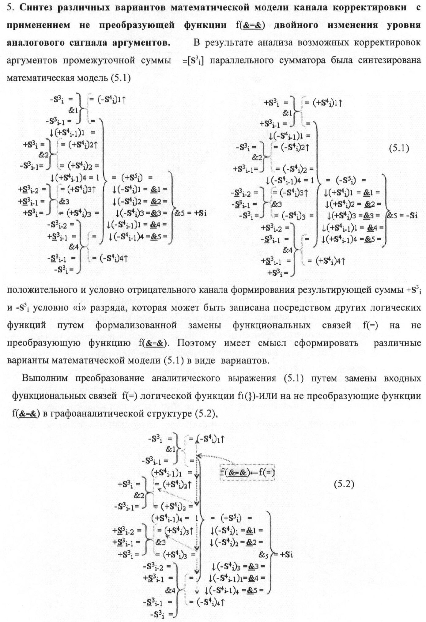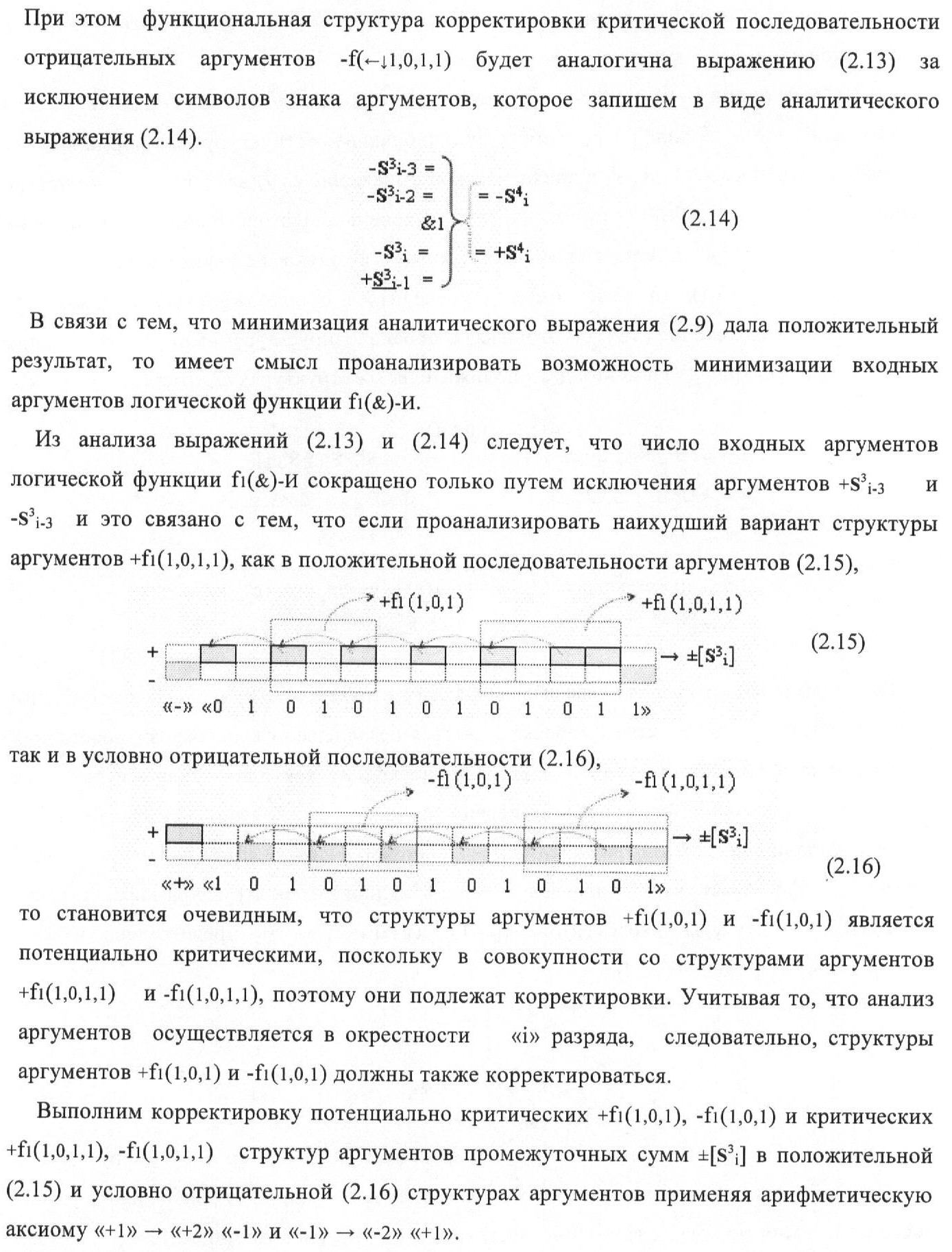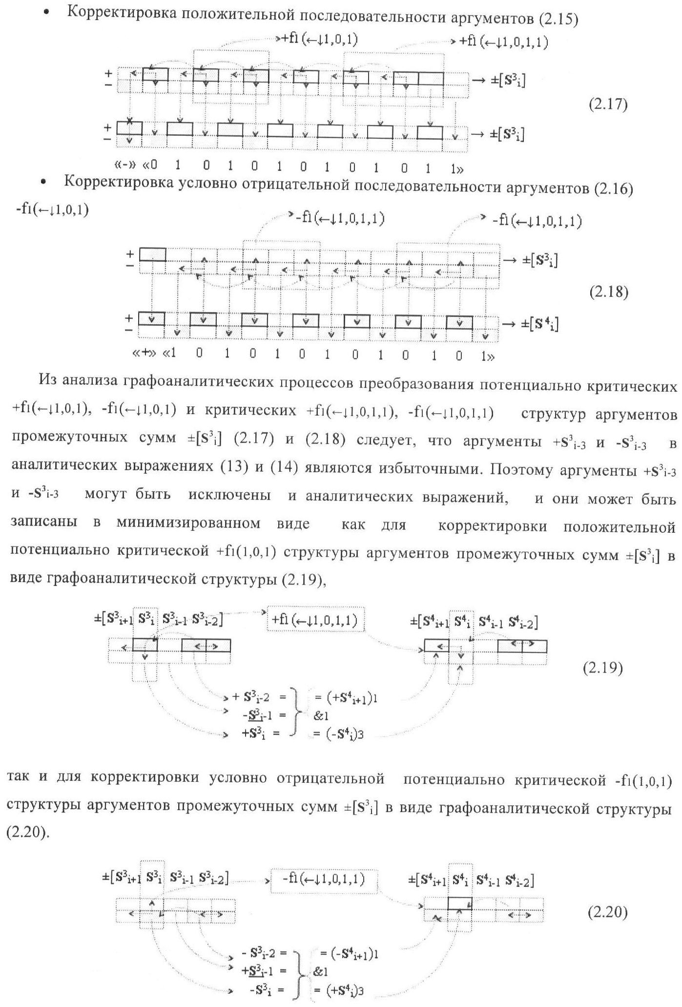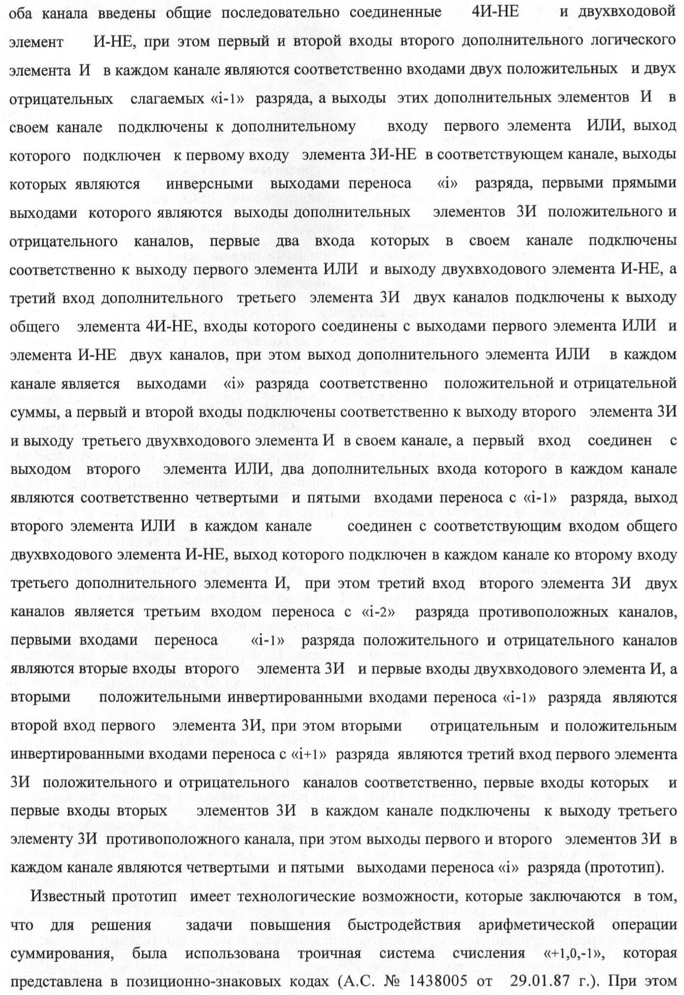 1. Функциональная структура корректировки аргументов промежуточной суммы ±[S3i] параллельного сумматора в позиционно-знаковых кодах f(+/-), условно «i» разряд которой выполнен в виде двух эквивалентных по структуре логических функций положительного и условно отрицательного каналов корректировки аргументов, и каждый канал «i» разряда включает три логические функции f1(&)-И, f3(&)-И и f4(&)-И, которые формируют преобразованные аргументы или  или и или при этом две функциональные дополнительные входные связи являются входными связями канала для приема преобразованных аргументов или и или условно «i-1» разряда, а функциональные выходные связи логических функций f1(&)-И и f4(&)-И, которые формируют преобразованный аргумент или и или условно «i» разряда также являются функциональными выходными связями канала для подачи аргумента в «i+1» разряда, при этом функциональные входные связи логической функции f1(&)-И являются функциональными входными связями канала для приема аргумента промежуточной суммы или условно «i» разряда и аргумента промежуточной суммы или условно «i-1» разряда, при этом функциональные входные связи логической функции f4(&)-И являются функциональными входными связями канала для приема аргументов промежуточной суммы или условно «i» разряда, для приема аргументов промежуточной суммы с измененным уровнем аналогового сигнала или условно «i-1» разряда и аргументов промежуточной суммы или условно «i-2» разряда, а функциональные входные связи логической функции f3(&)-И являются функциональными входными связями канала для приема аргументов промежуточной суммы или условно «i» разряда и аргументов промежуточной суммы с измененным уровнем аналогового сигнала или условно «i-1» разряда, отличающаяся тем, что в условно «i» разряда каждого канала введена логическая функция f2(&)-И, которая формирует преобразованный аргумент или логическая функция f1(}&)-ИЛИ-НЕ и логическая функция f2(}&)-ИЛИ-НЕ, которая формирует выходной аргумент результирующей суммы +Si или -Si, при этом функциональные связи логических функций в структуре сумматора выполнены в соответствии с математической моделью вида