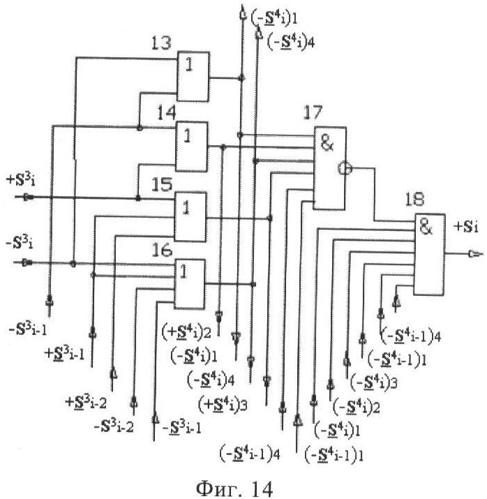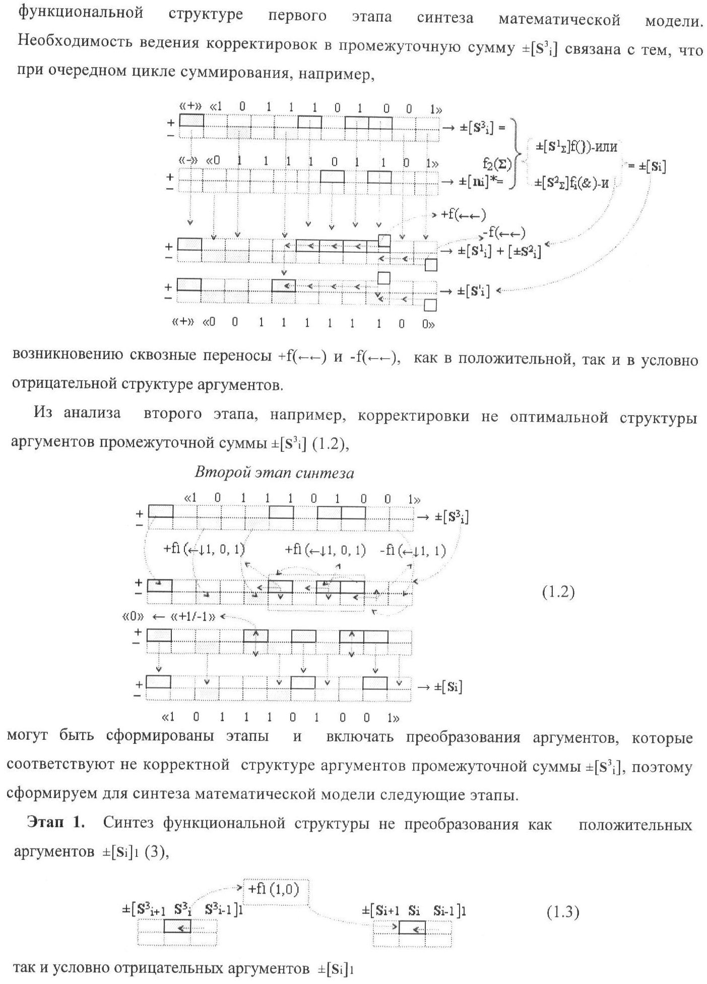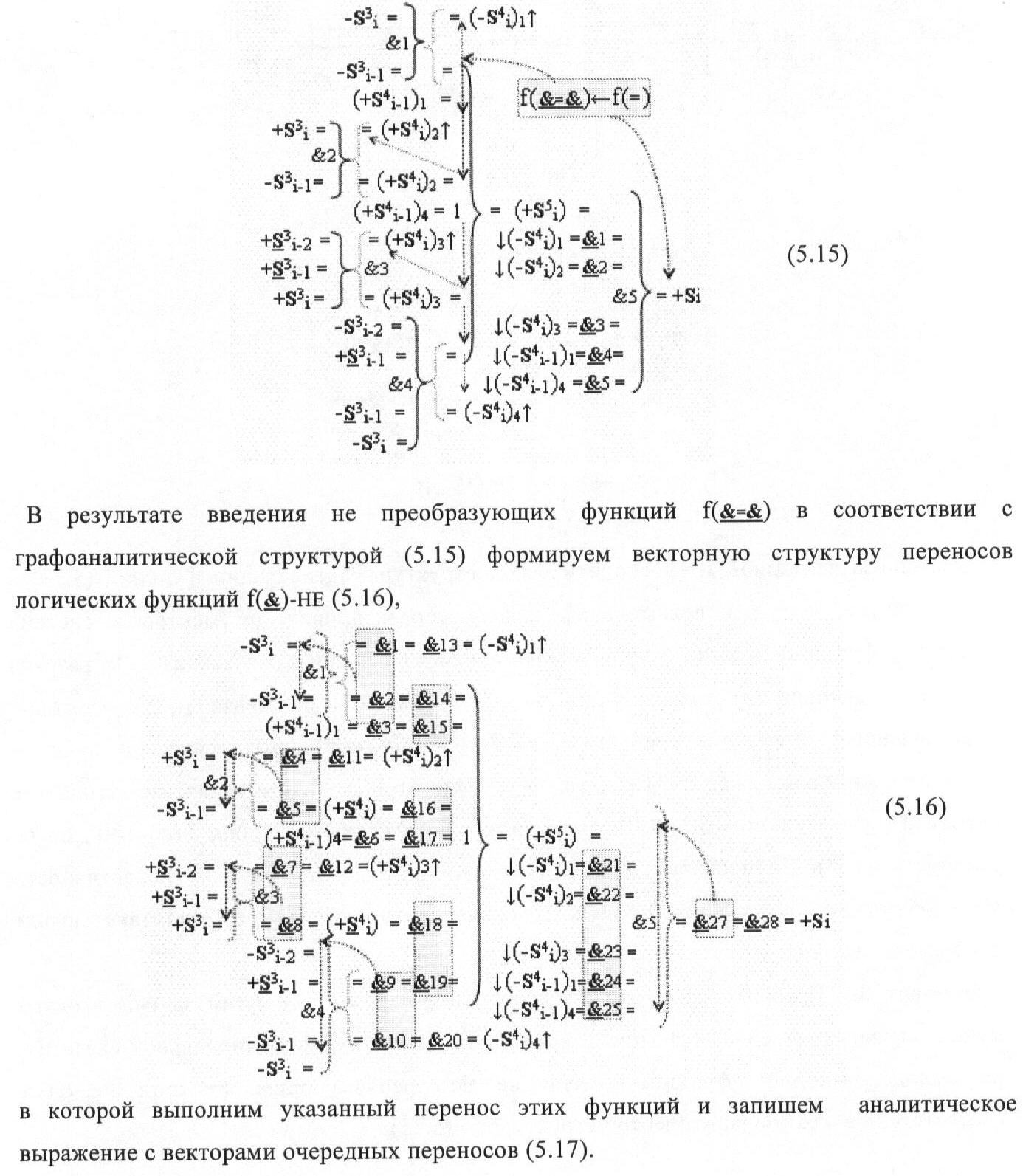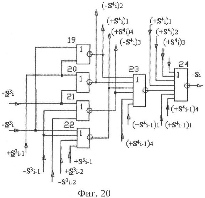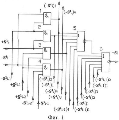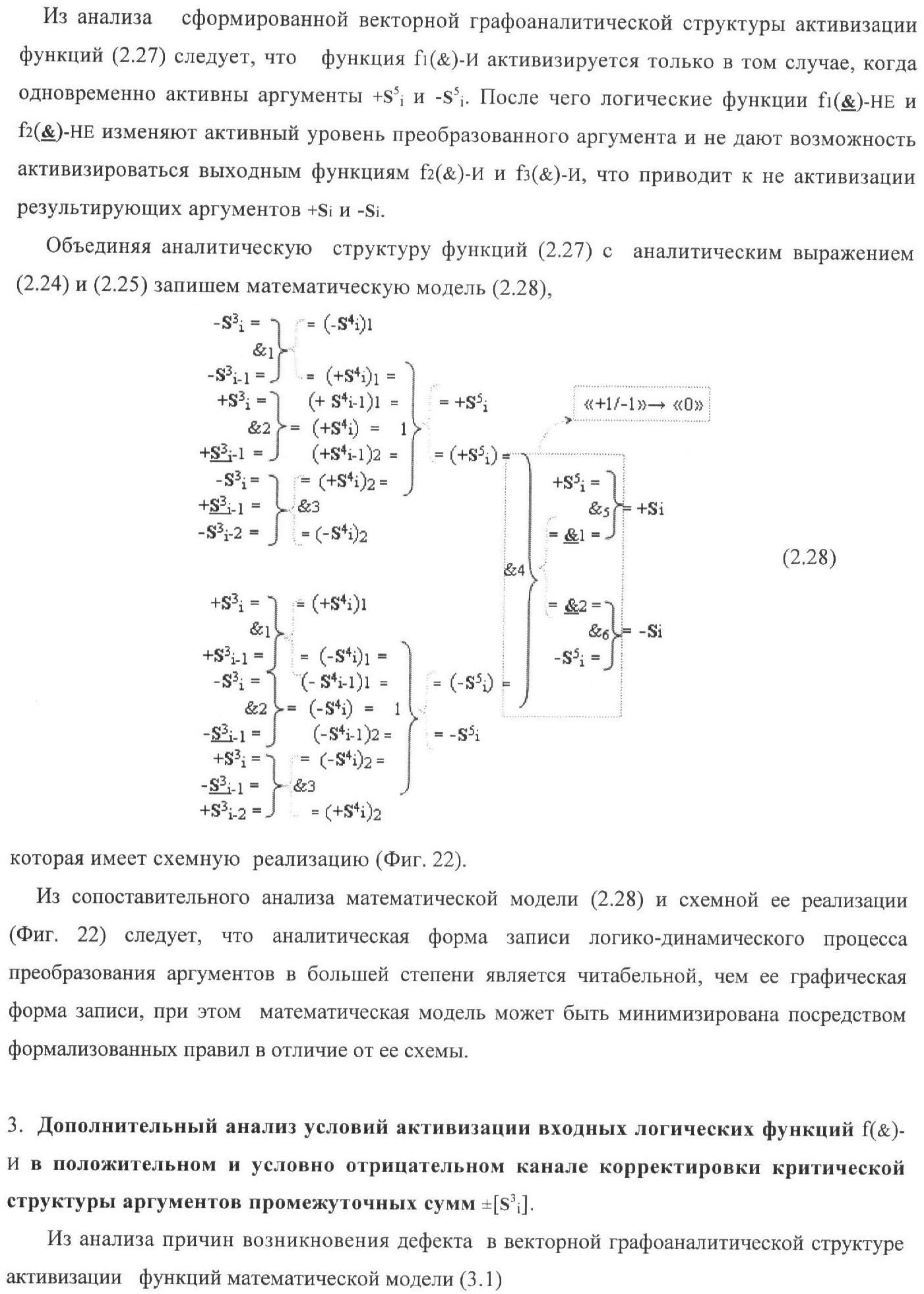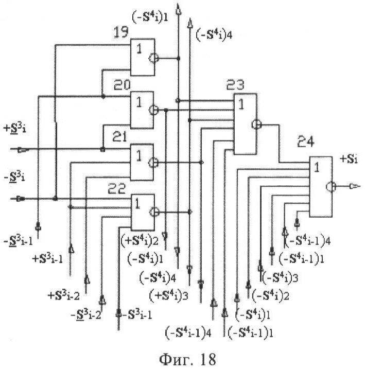 1. Функциональная структура корректировки аргументов промежуточной суммы ±[S3i] параллельного сумматора в позиционно-знаковых кодах f(+/-), условно «i» разряд которой выполнен в виде двух эквивалентных по структуре логических функций положительного и условно отрицательного каналов корректировки аргументов, и каждый канал «i» разряда включает три логические функции f1(&)-И, f3(&)-И и f4(&)-И, которые формируют преобразованные аргументы или  или и или при этом две функциональные дополнительные входные связи являются входными связями канала для приема преобразованных аргументов или и или условно «i-1» разряда, а функциональные выходные связи логических функций f1(&)-И и f4(&)-И, которые формируют преобразованный аргумент или и или условно «i» разряда также являются функциональными выходными связями канала для подачи аргумента в «i+1» разряда, при этом функциональные входные связи логической функции f1(&)-И являются функциональными входными связями канала для приема аргумента промежуточной суммы или условно «i» разряда и аргумента промежуточной суммы или условно «i-1» разряда, при этом функциональные входные связи логической функции f4(&)-И являются функциональными входными связями канала для приема аргументов промежуточной суммы или условно «i» разряда, для приема аргументов промежуточной суммы с измененным уровнем аналогового сигнала или условно «i-1» разряда и аргументов промежуточной суммы или условно «i-2» разряда, а функциональные входные связи логической функции f3(&)-И являются функциональными входными связями канала для приема аргументов промежуточной суммы или условно «i» разряда и аргументов промежуточной суммы с измененным уровнем аналогового сигнала или условно «i-1» разряда, отличающаяся тем, что в условно «i» разряда каждого канала введена логическая функция f2(&)-И, которая формирует преобразованный аргумент или логическая функция f1(}&)-ИЛИ-НЕ и логическая функция f2(}&)-ИЛИ-НЕ, которая формирует выходной аргумент результирующей суммы +Si или -Si, при этом функциональные связи логических функций в структуре сумматора выполнены в соответствии с математической моделью вида