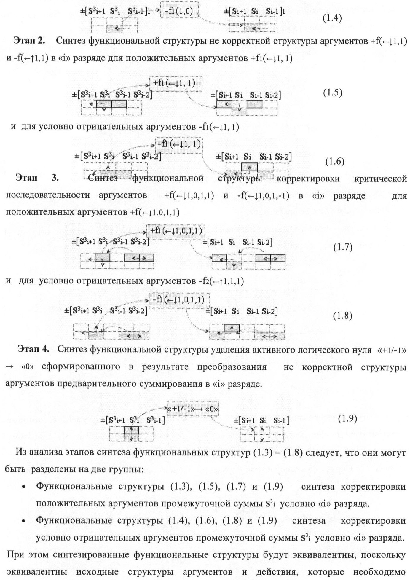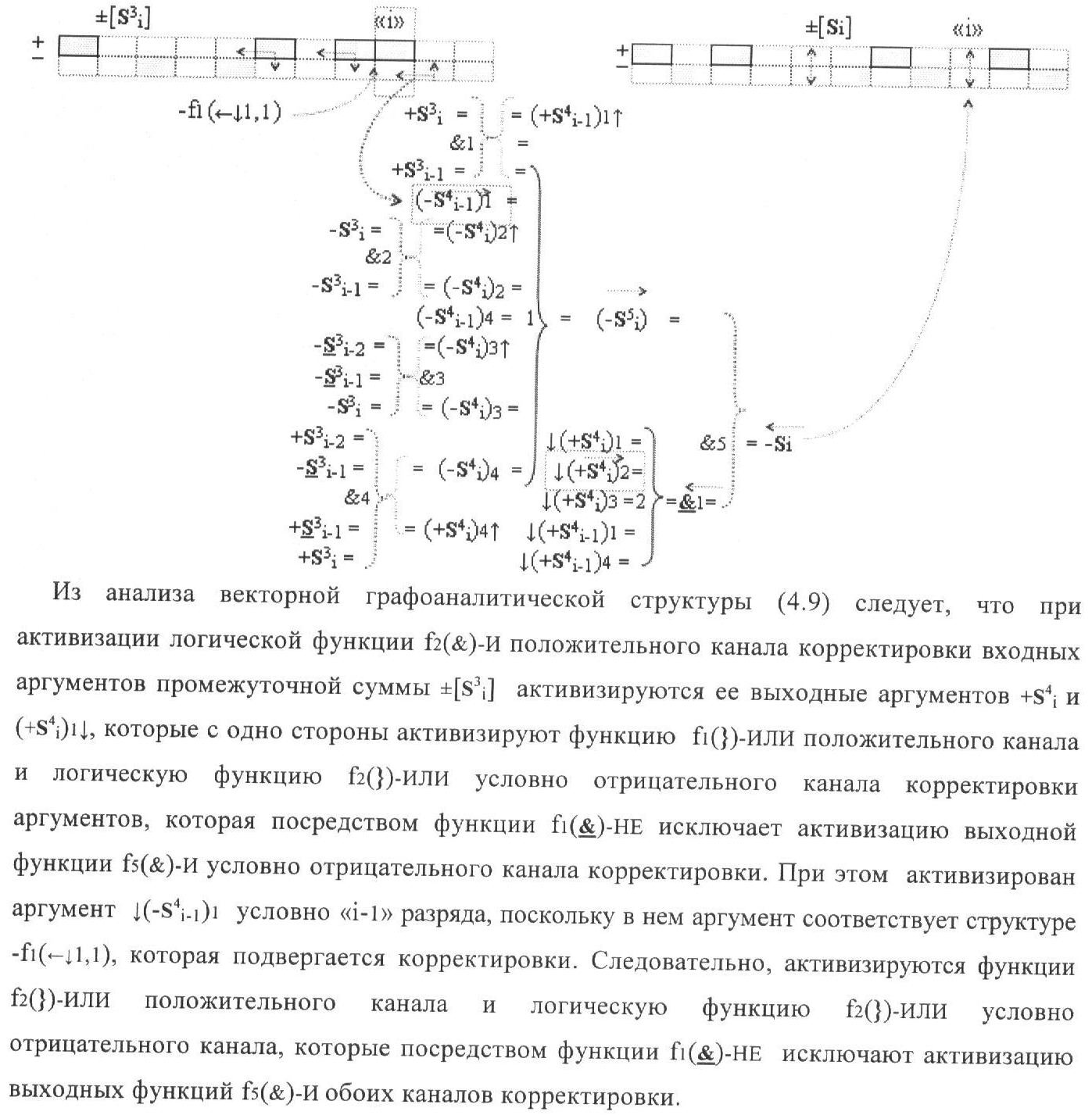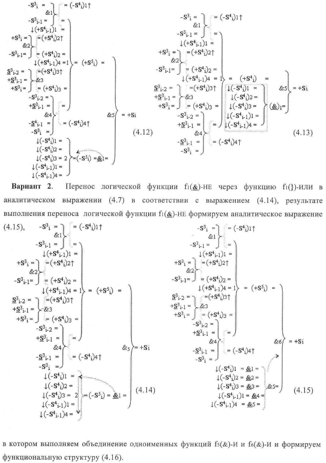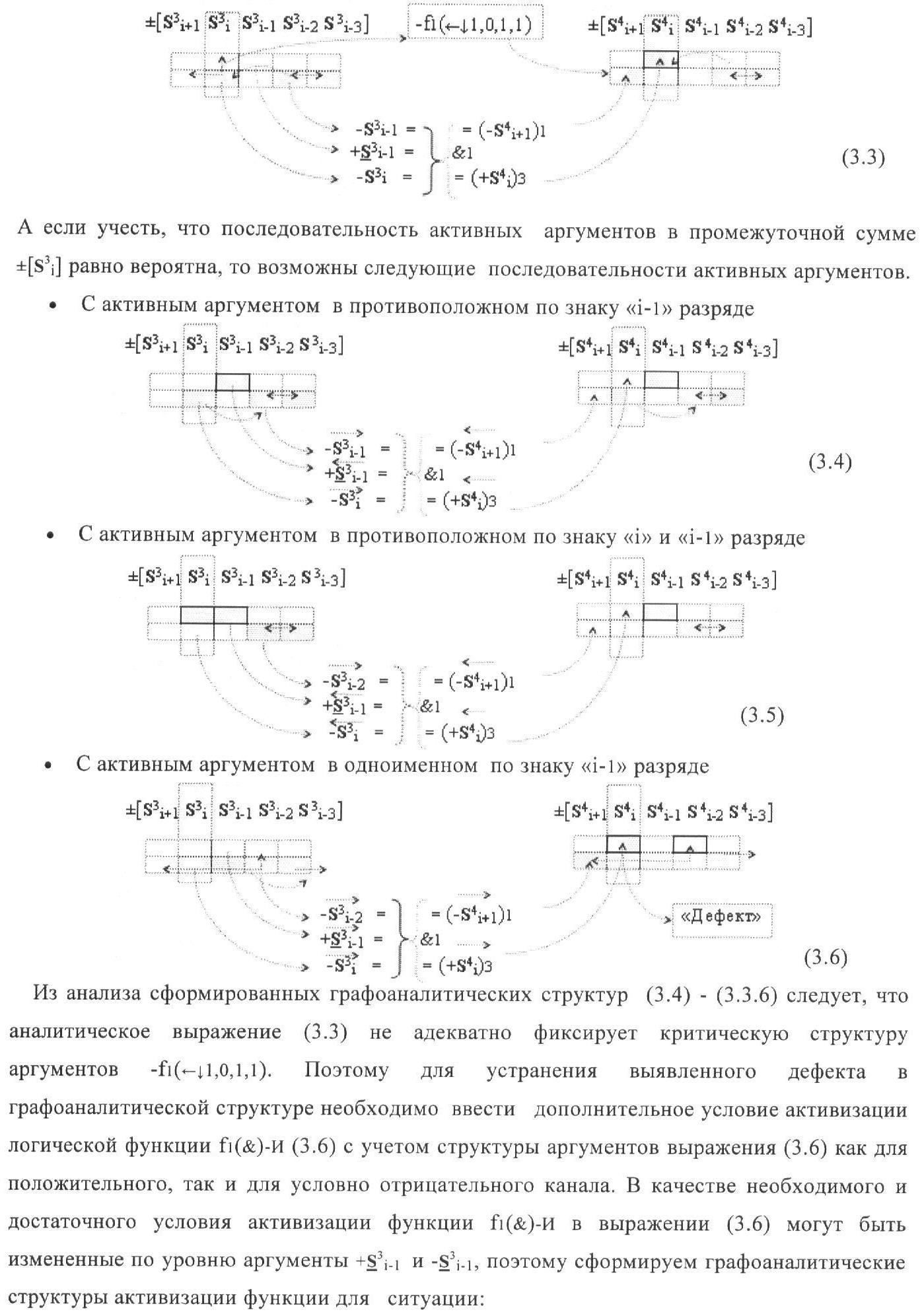 4. Функциональная структура корректировки аргументов промежуточной суммы ±[S3i] параллельного сумматора в позиционно-знаковых кодах f(+/-), условно «i» разряд которой выполнен в виде двух эквивалентных по структуре логических функций положительного и условно отрицательного каналов корректировки аргументов, отличающаяся тем, что в условно «i» разряда каждого канала введены логические функции f1(}&)-ИЛИ-НЕ, f2(}&)-ИЛИ-HE, f3(}&)-ИЛИ-HE, f4(}&)-ИЛИ-НЕ, f5(}&)-ИЛИ-НЕ и f6(}&)-ИЛИ-НЕ, при этом функциональные связи логических функций в структуре сумматора выполнены в соответствии с математической моделью вида