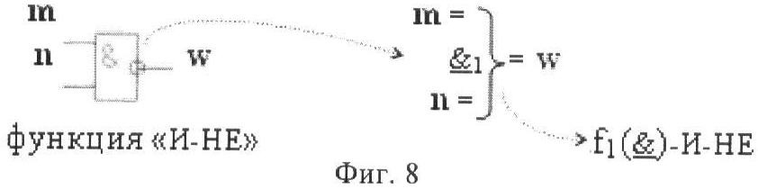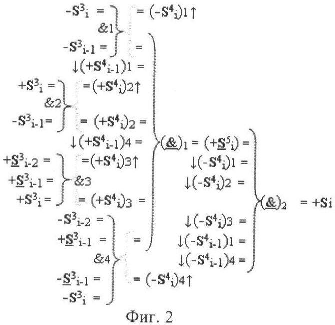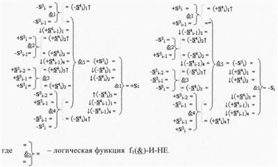 2. Функциональная структура корректировки аргументов промежуточной суммы ±[S3i] параллельного сумматора в позиционно-знаковых кодах f(+/-), условно «i» разряд которой выполнен в виде двух эквивалентных по структуре логических функций положительного и условно отрицательного каналов корректировки аргументов и каждый канал «i» разряда включает логическую функцию f1(&)-И, первая функциональная входная связь которой является выходной функциональной связью логической функции f5(&)-И-НЕ, которая формирует преобразованный аргумент или отличающаяся тем, что в условно «i» разряда каждого канала введены логические функции f1(&)-И-НЕ, f2(&)-И-НЕ, f3(&)-И-НЕ и f4(&)-И-НЕ, при этом функциональные связи логических функций в структуре сумматора выполнены в соответствии с математической моделью вида