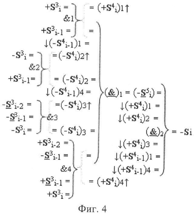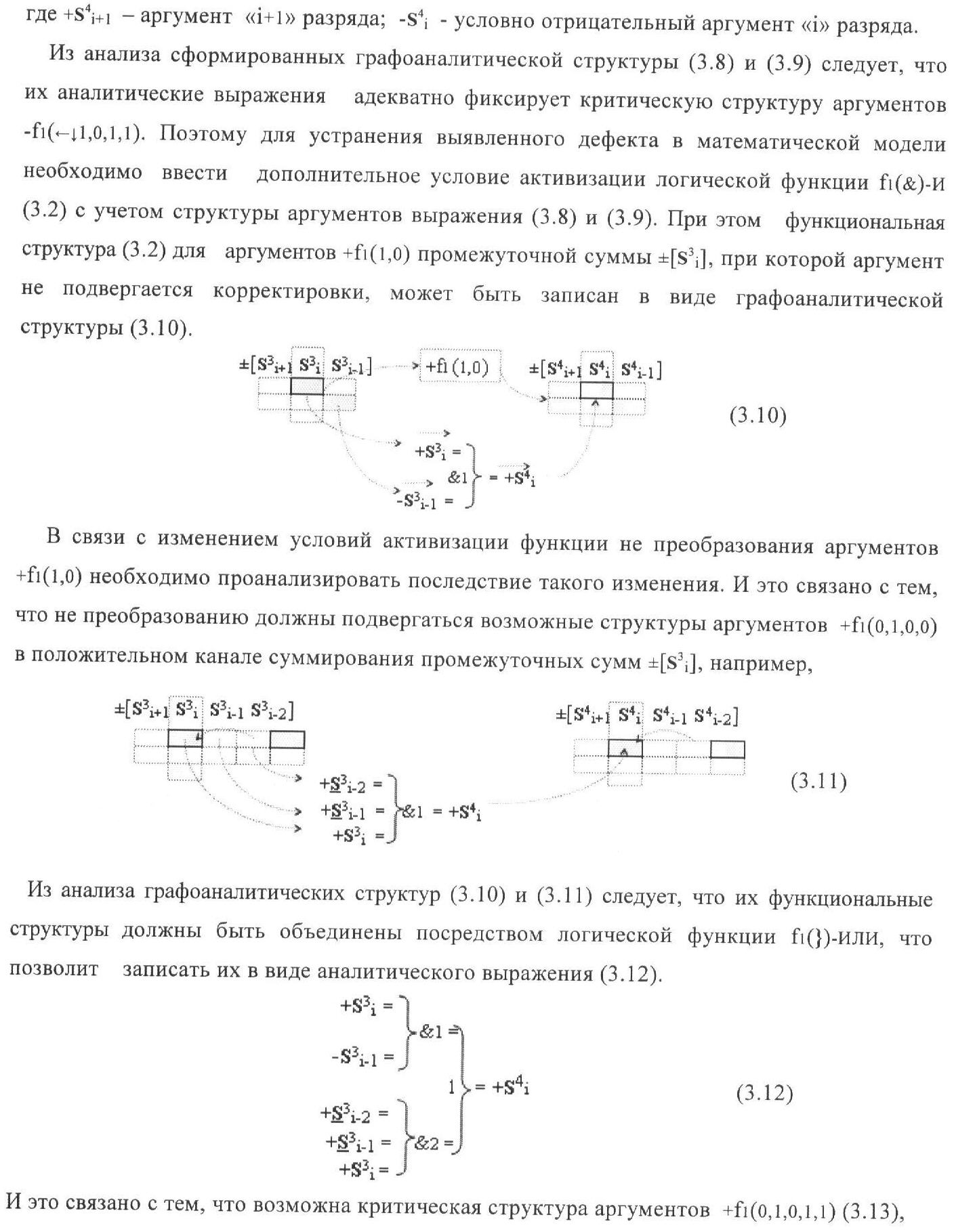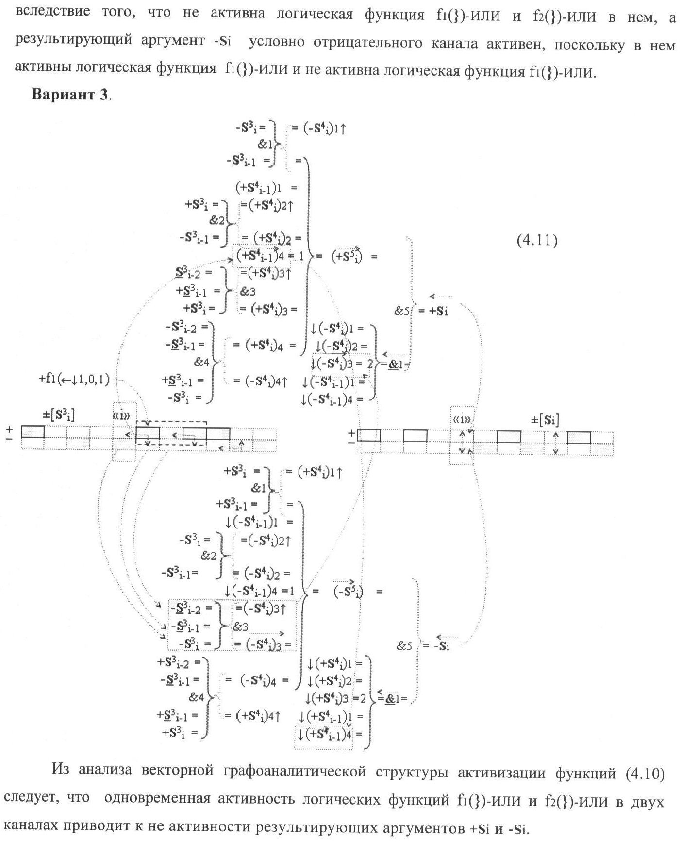 3. Функциональная структура корректировки аргументов промежуточной суммы ±[S3i] параллельного сумматора в позиционно-знаковых кодах f(+/-), условно «i» разряд которой выполнен в виде двух эквивалентных по структуре логических функций положительного и условно отрицательного каналов корректировки аргументов, и каждый канал «i» разряда включает логическую функцию f1(&)-И, первая функциональная входная связь которой является выходной функциональной связью логической функции f1(&)-И-HE, которая формирует преобразованный аргумент или отличающаяся тем, что в условно «i» разряда каждого канала введены логические функции f1(})-ИЛИ, f2(})-ИЛИ, f3(})-ИЛИ и f4(})-ИЛИ, при этом функциональные связи логических функций в структуре сумматора выполнены в соответствии с математической моделью вида