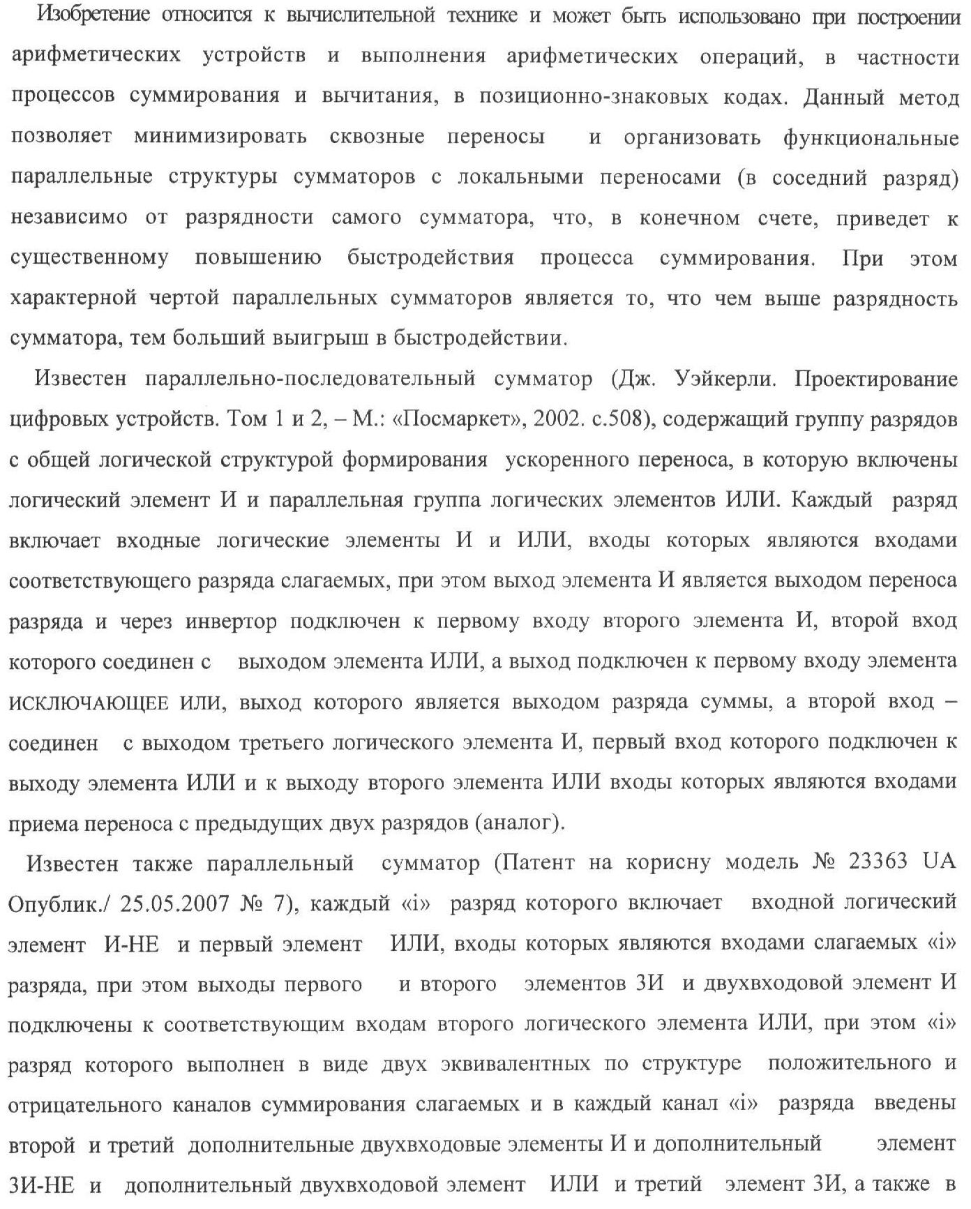 Изобретение относится к вычислительной технике и может быть использовано при построении арифметических устройств для выполнения арифметических операций суммирования и вычитания в позиционно-знаковых кодах. Техническим результатом является упрощение функциональной структуры сумматора. Каждый разряд сумматора выполнен в виде двух эквивалентных по структуре каналов – положительного и условно отрицательного, при этом, в одном из вариантов выполнения, i-ый разряд каждого канала содержит четыре логических элемента И и два логических элемента ИЛИ-НЕ. 4 н.п. ф-лы, 21 ил.