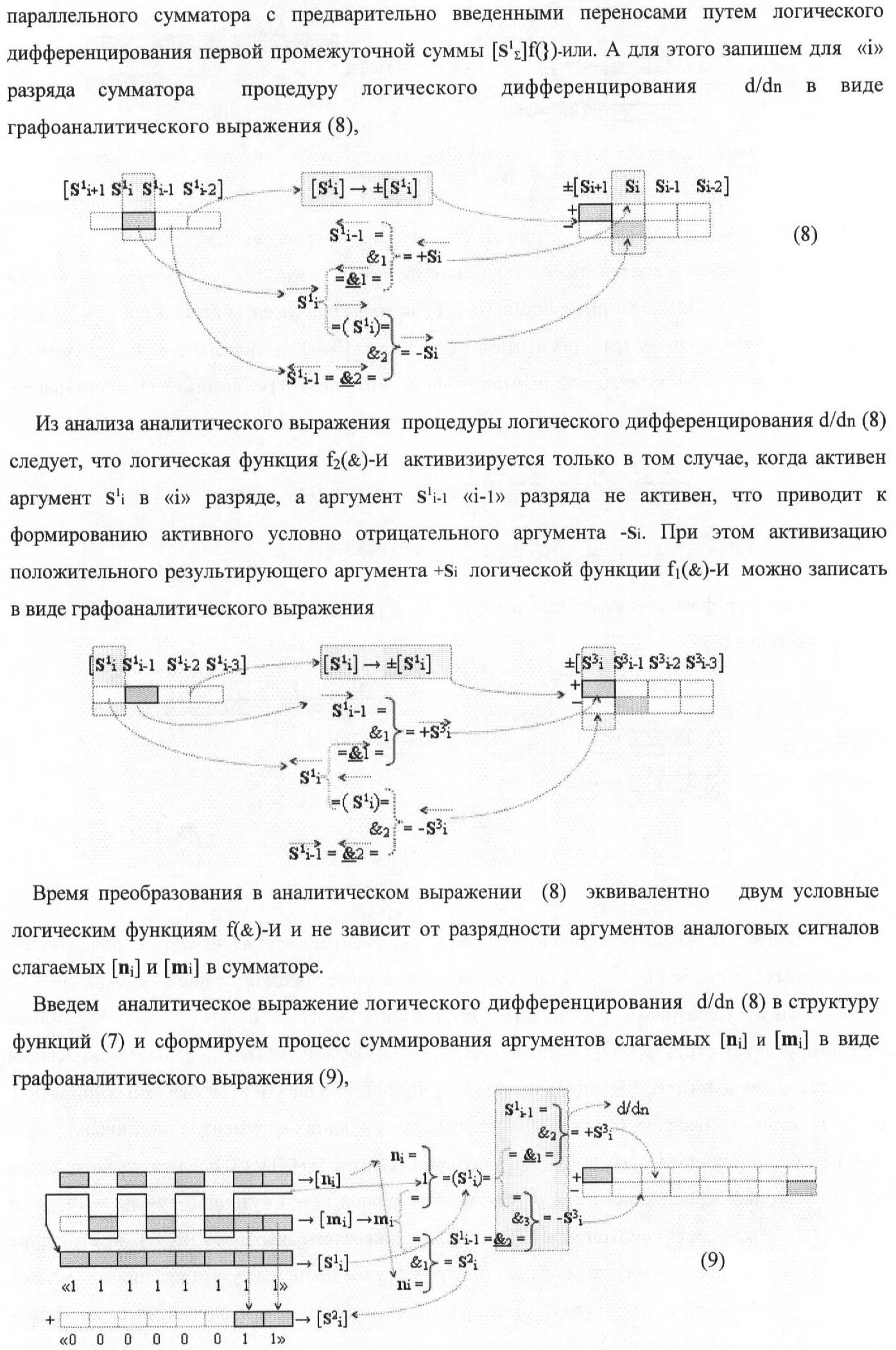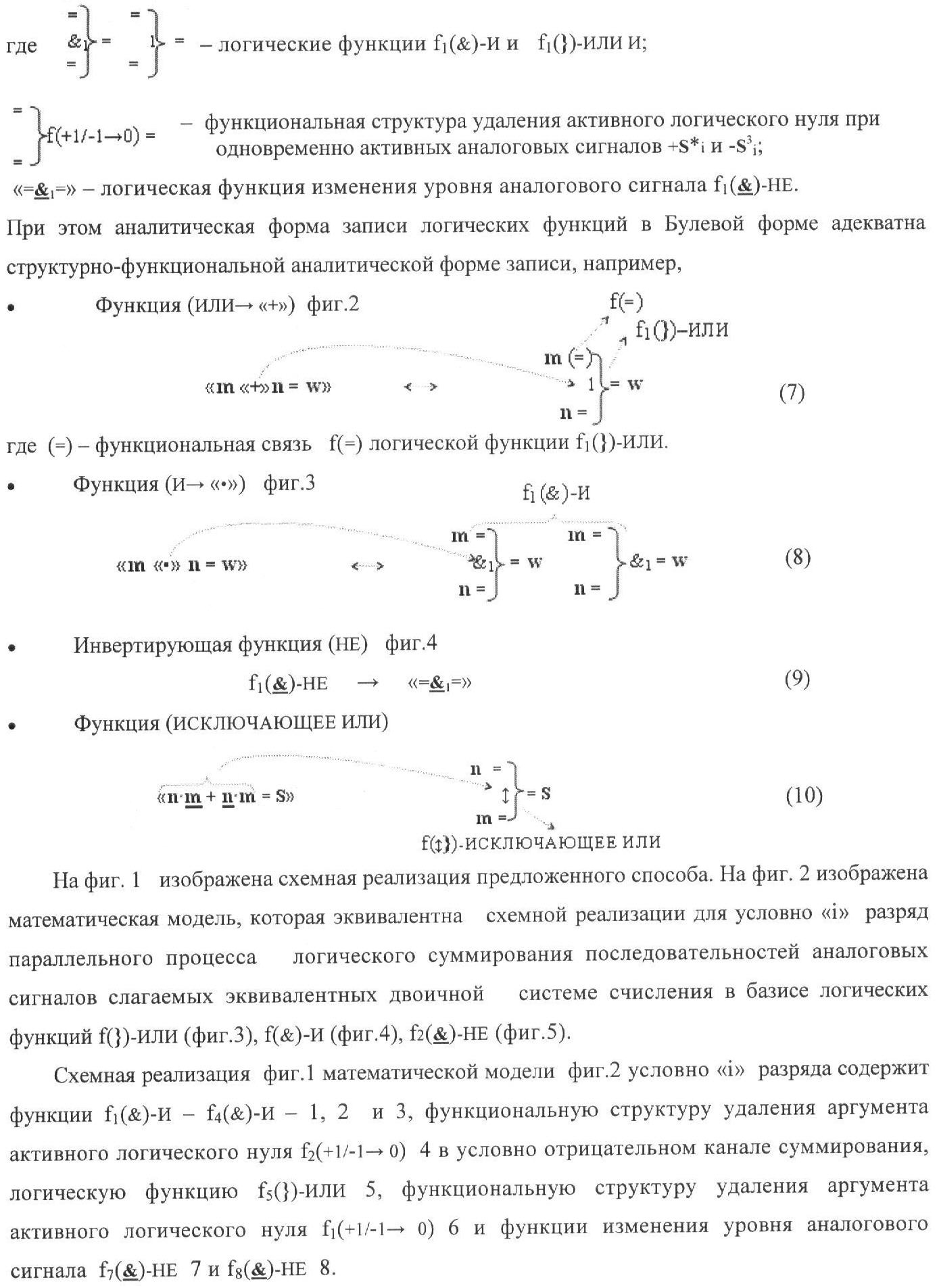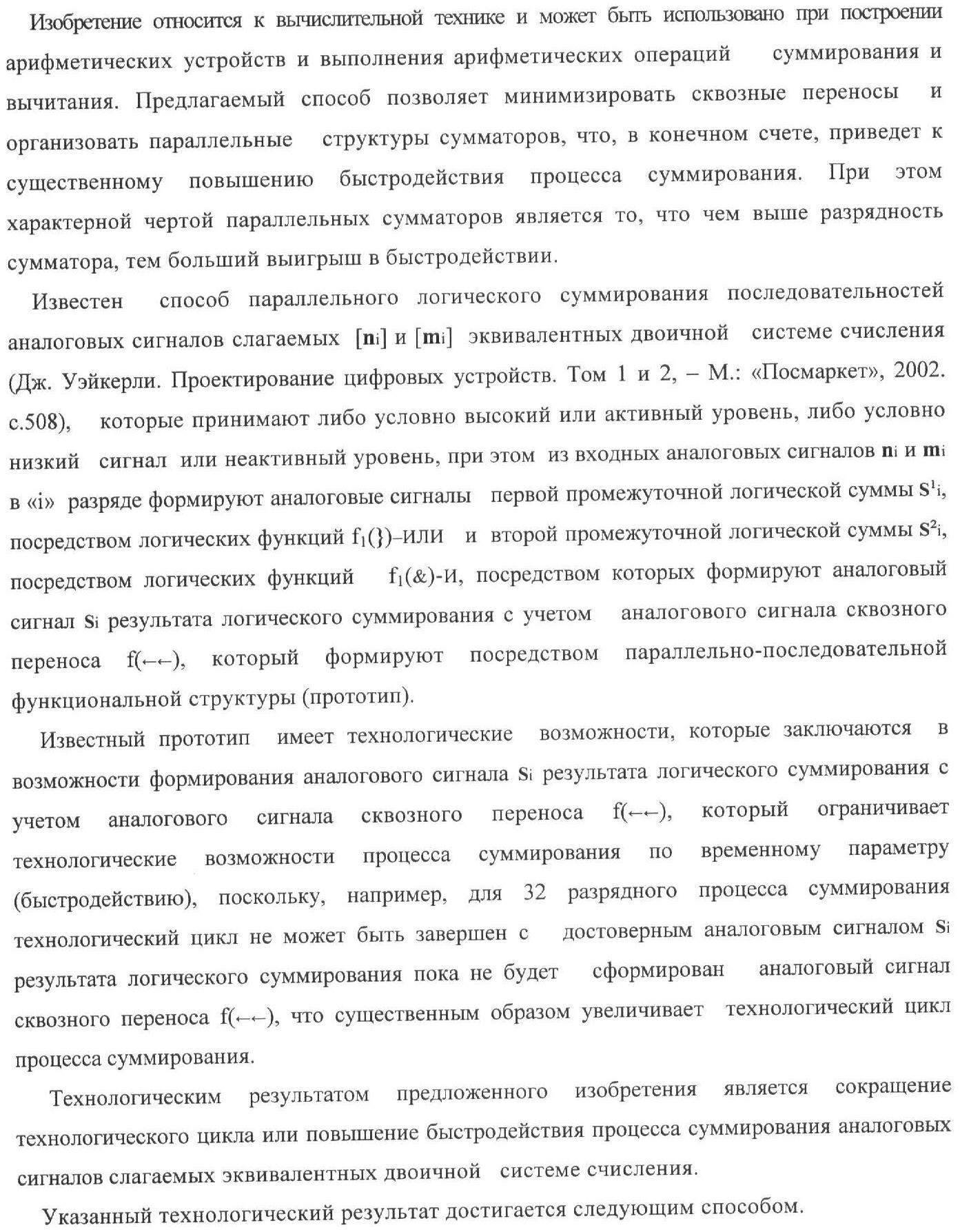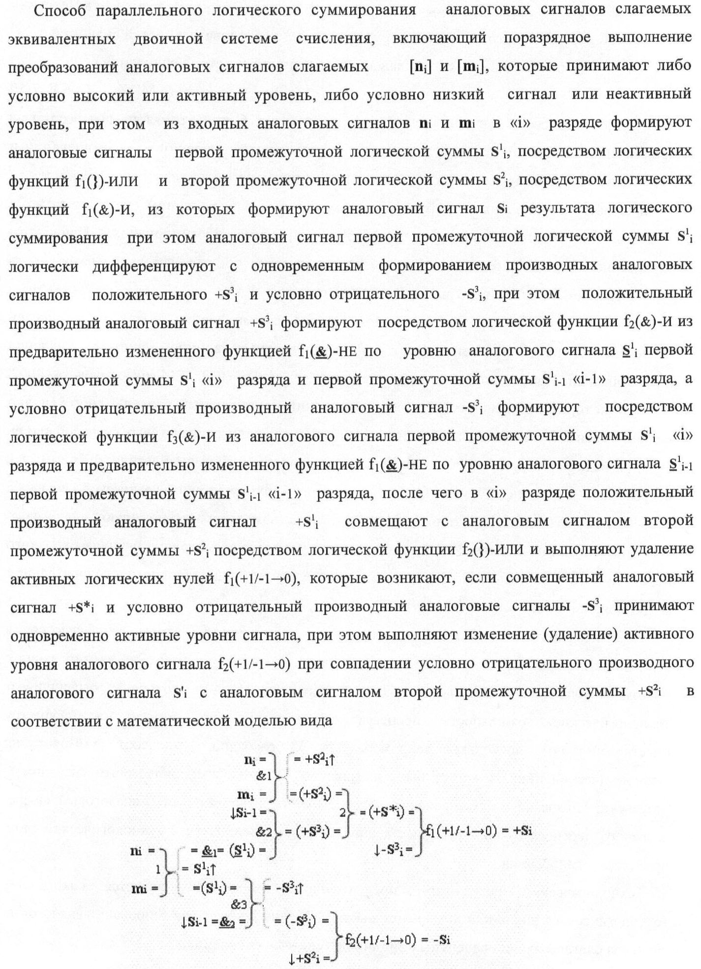 Способ параллельного логического суммирования аналоговых сигналов слагаемых эквивалентных двоичной системе счисления, включающий поразрядное выполнение преобразований аналоговых сигналов слагаемых [ni] и [mi], которые принимают либо условно высокий или активный уровень, либо условно низкий сигнал или неактивный уровень, при этом из входных аналоговых сигналов ni и mi в «i» разряде формируют аналоговые сигналы первой промежуточной логической суммы S1 i, посредством логических функций f1(})-ИЛИ и второй промежуточной логической суммы S2 i, посредством логических функций f1(&)-И, из которых формируют аналоговый сигнал Si результата логического суммирования, отличающийся тем, что аналоговый сигнал первой промежуточной логической суммы S1 i логически дифференцируют с одновременным формированием производных аналоговых сигналов положительного +S3 i и условно отрицательного -S3 i, при этом положительный производный аналоговый сигнал +S3 i формируют посредством логической функции f2(&)-И из предварительно измененного функцией f1(&)-HE по уровню аналогового сигнала S1 i первой промежуточной суммы S1 i «i» разряда и первой промежуточной суммы S1 i-1 «i-1» разряда, а условно отрицательный производный аналоговый сигнал -S3 i формируют посредством логической функции f3(&)-И из аналогового сигнала первой промежуточной суммы S1 i «i» разряда и предварительно измененного функцией f2(&)-HE по уровню аналогового сигнала S1 i-1 первой промежуточной суммы S1 i-1 «i-1» разряда, после чего в «i» разряде положительный производный аналоговый сигнал +S1 i совмещают с аналоговым сигналом второй промежуточной суммы +S2 i посредством логической функции f2(})-ИЛИ и выполняют изменение уровня аналогового сигнала результирующего аргумента +S*i, что соответствует процедуре удаления активного логического нуля f1(+1/-1 0), которые формируется, если совмещенный аналоговый сигнал +S*i и условно отрицательный производный аналоговые сигналы -S3 i принимают одновременно активные уровни аналогового сигнала, при этом выполняют изменение (удаление) активного уровня аналогового сигнала f2(+1/-1 0) при совпадении условно отрицательного производного аналогового сигнала S3 i с аналоговым сигналом второй промежуточной суммы +S2 i в соответствии с математической моделью вида