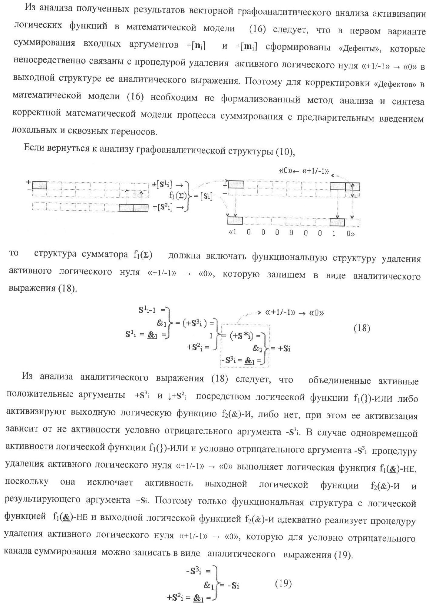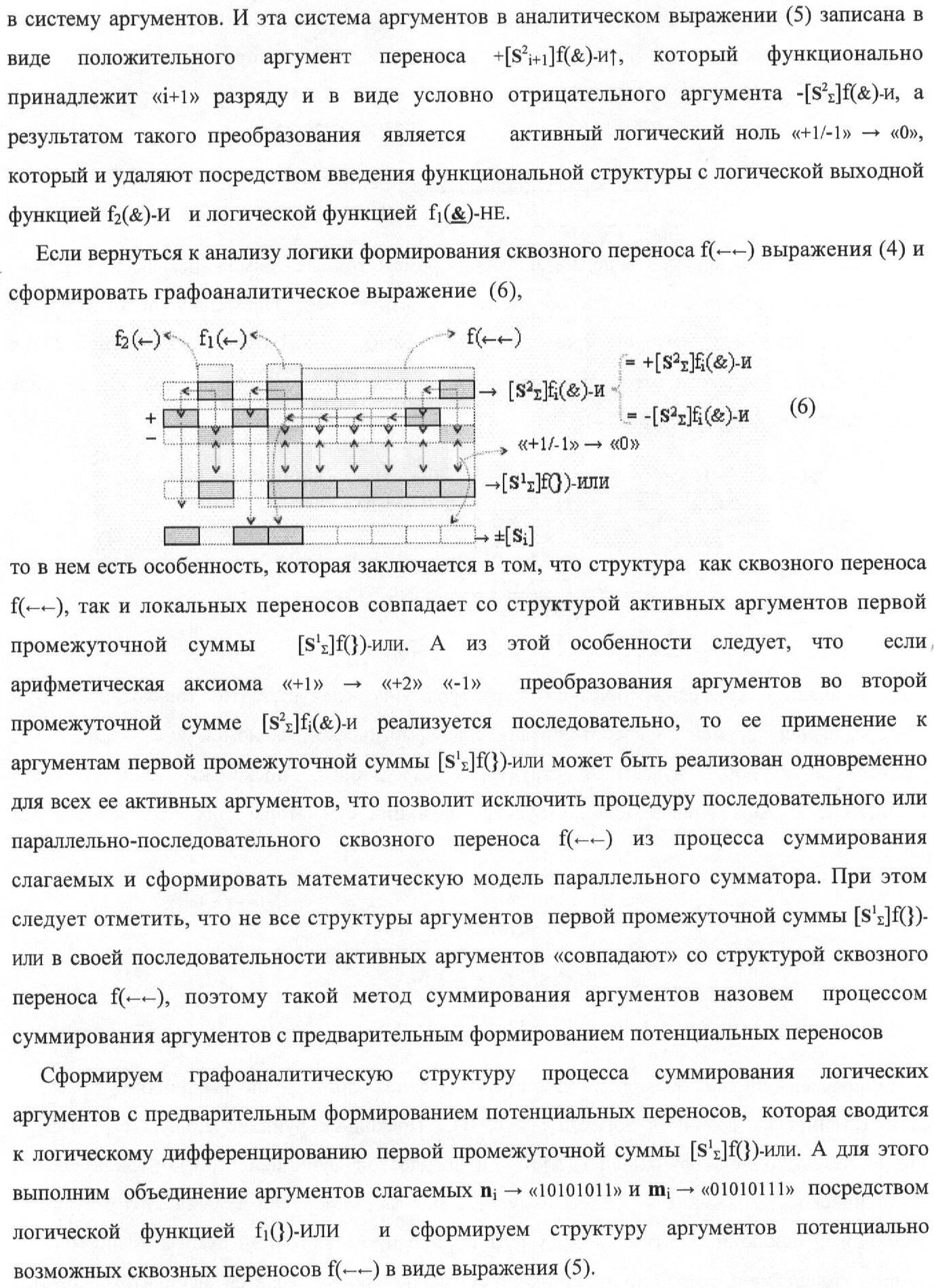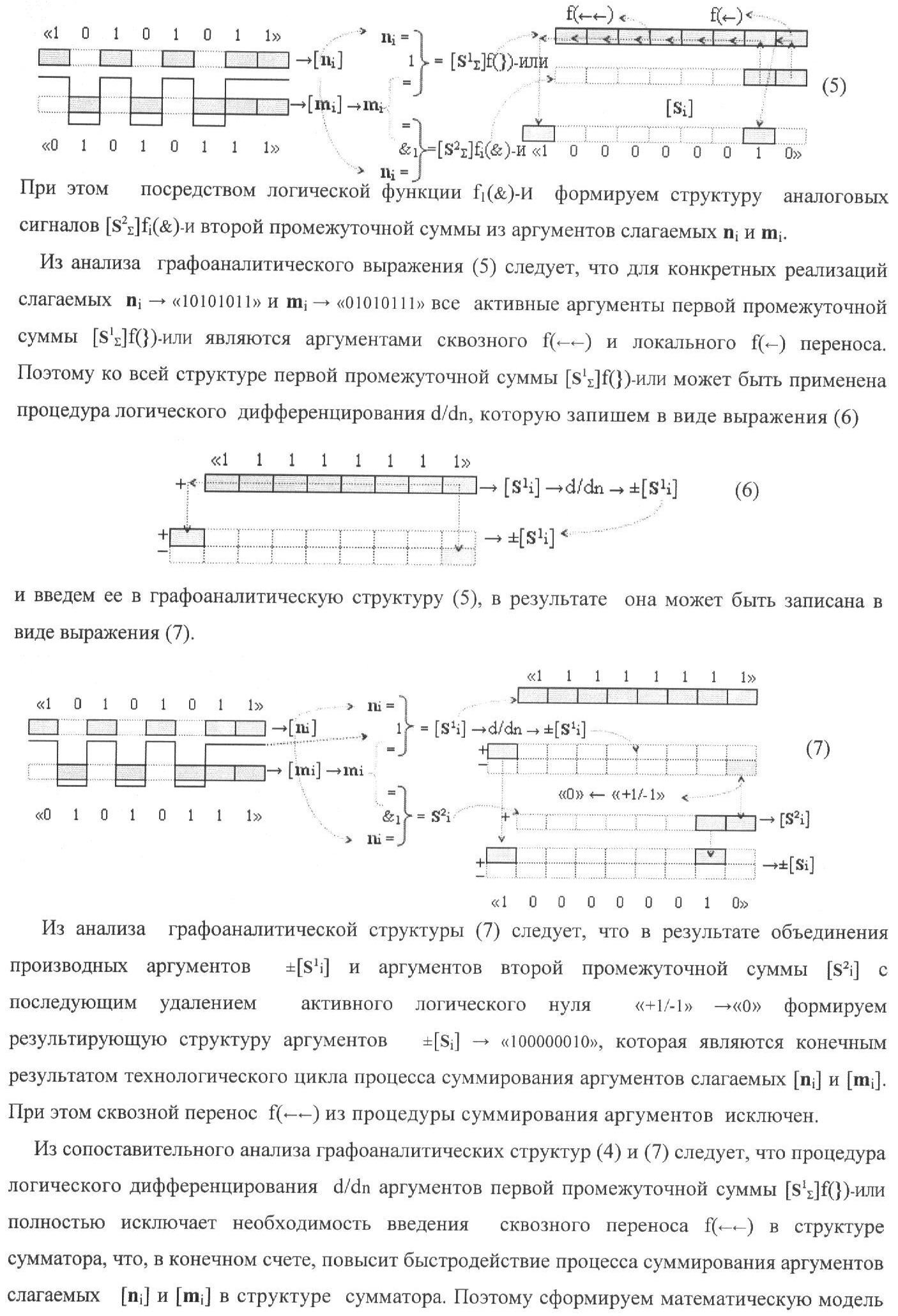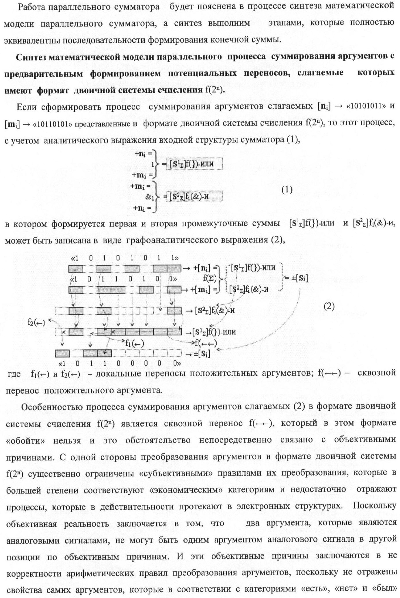 Способ параллельного логического суммирования аналоговых сигналов слагаемых эквивалентных двоичной системе счисления, включающий поразрядное выполнение преобразований аналоговых сигналов слагаемых [ni] и [mi], которые принимают либо условно высокий или активный уровень, либо условно низкий сигнал или неактивный уровень, при этом из входных аналоговых сигналов ni и mi в «i» разряде формируют аналоговые сигналы первой промежуточной логической суммы S1 i, посредством логических функций f1(})-ИЛИ и второй промежуточной логической суммы S2 i, посредством логических функций f1(&)-И, из которых формируют аналоговый сигнал Si результата логического суммирования, отличающийся тем, что аналоговый сигнал первой промежуточной логической суммы S1 i логически дифференцируют с одновременным формированием производных аналоговых сигналов положительного +S3 i и условно отрицательного -S3 i, при этом положительный производный аналоговый сигнал +S3 i формируют посредством логической функции f2(&)-И из предварительно измененного функцией f1(&)-HE по уровню аналогового сигнала S1 i первой промежуточной суммы S1 i «i» разряда и первой промежуточной суммы S1 i-1 «i-1» разряда, а условно отрицательный производный аналоговый сигнал -S3 i формируют посредством логической функции f3(&)-И из аналогового сигнала первой промежуточной суммы S1 i «i» разряда и предварительно измененного функцией f2(&)-HE по уровню аналогового сигнала S1 i-1 первой промежуточной суммы S1 i-1 «i-1» разряда, после чего в «i» разряде положительный производный аналоговый сигнал +S1 i совмещают с аналоговым сигналом второй промежуточной суммы +S2 i посредством логической функции f2(})-ИЛИ и выполняют изменение уровня аналогового сигнала результирующего аргумента +S*i, что соответствует процедуре удаления активного логического нуля f1(+1/-1 0), которые формируется, если совмещенный аналоговый сигнал +S*i и условно отрицательный производный аналоговые сигналы -S3 i принимают одновременно активные уровни аналогового сигнала, при этом выполняют изменение (удаление) активного уровня аналогового сигнала f2(+1/-1 0) при совпадении условно отрицательного производного аналогового сигнала S3 i с аналоговым сигналом второй промежуточной суммы +S2 i в соответствии с математической моделью вида