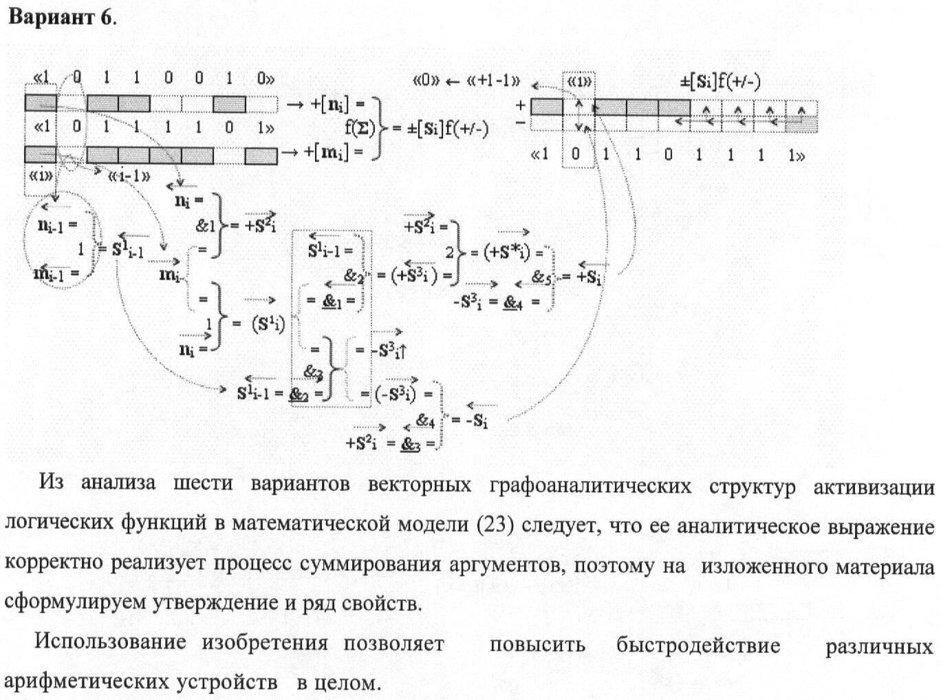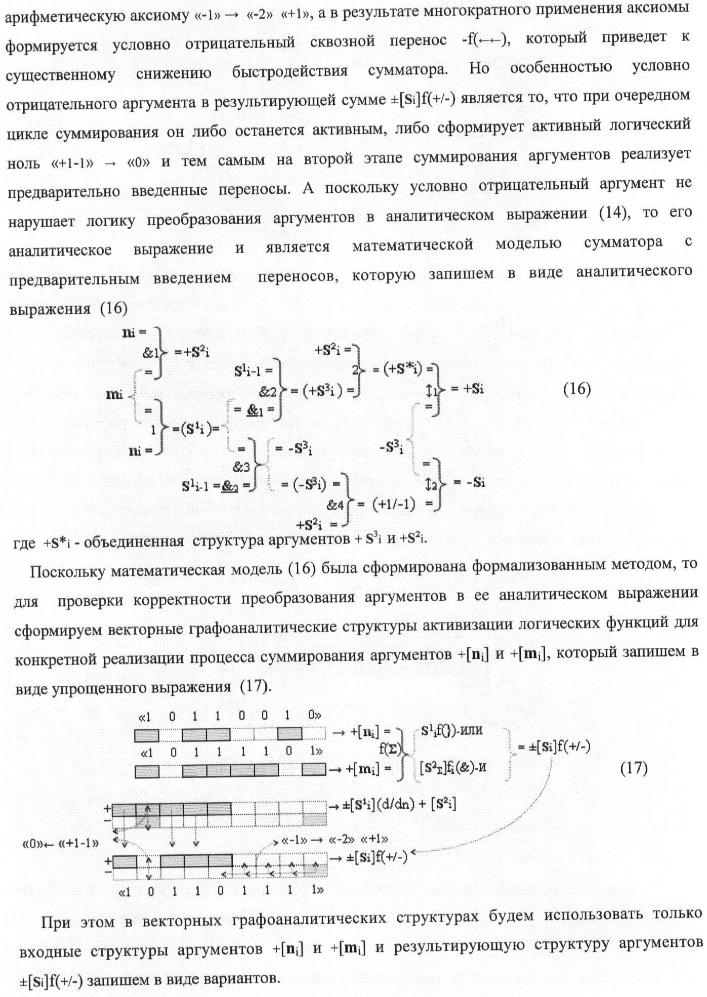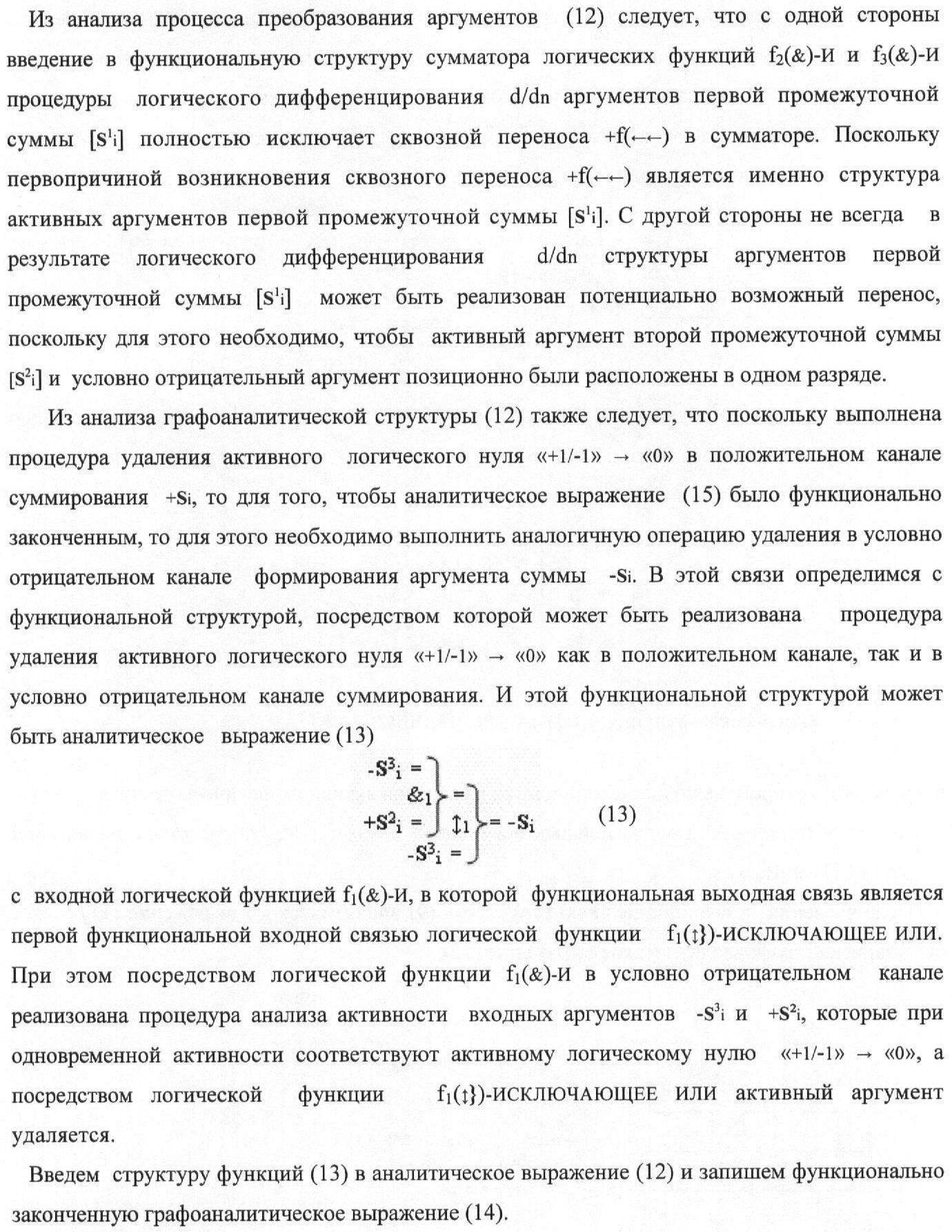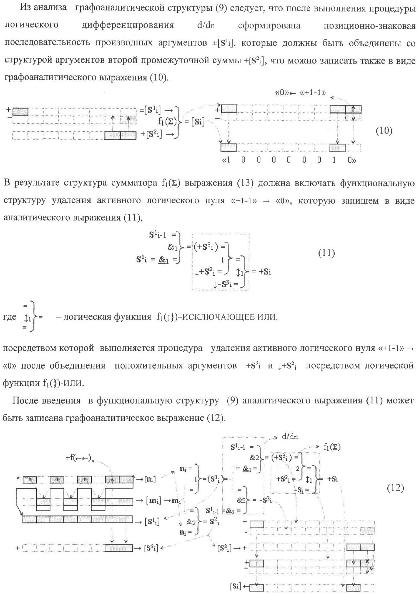 Способ параллельного логического суммирования аналоговых сигналов слагаемых эквивалентных двоичной системе счисления, включающий поразрядное выполнение преобразований аналоговых сигналов слагаемых [ni] и [mi], которые принимают либо условно высокий или активный уровень, либо условно низкий сигнал или неактивный уровень, при этом из входных аналоговых сигналов ni и mi в «i» разряде формируют аналоговые сигналы первой промежуточной логической суммы S1 i, посредством логических функций f1(})-ИЛИ и второй промежуточной логической суммы S2 i, посредством логических функций f1(&)-И, из которых формируют аналоговый сигнал Si результата логического суммирования, отличающийся тем, что аналоговый сигнал первой промежуточной логической суммы S1 i логически дифференцируют с одновременным формированием производных аналоговых сигналов положительного +S3 i и условно отрицательного -S3 i, при этом положительный производный аналоговый сигнал +S3 i формируют посредством логической функции f2(&)-И из предварительно измененного функцией f1(&)-HE по уровню аналогового сигнала S1 i первой промежуточной суммы S1 i «i» разряда и первой промежуточной суммы S1 i-1 «i-1» разряда, а условно отрицательный производный аналоговый сигнал -S3 i формируют посредством логической функции f3(&)-И из аналогового сигнала первой промежуточной суммы S1 i «i» разряда и предварительно измененного функцией f2(&)-HE по уровню аналогового сигнала S1 i-1 первой промежуточной суммы S1 i-1 «i-1» разряда, после чего в «i» разряде положительный производный аналоговый сигнал +S1 i совмещают с аналоговым сигналом второй промежуточной суммы +S2 i посредством логической функции f2(})-ИЛИ и выполняют изменение уровня аналогового сигнала результирующего аргумента +S*i, что соответствует процедуре удаления активного логического нуля f1(+1/-1 0), которые формируется, если совмещенный аналоговый сигнал +S*i и условно отрицательный производный аналоговые сигналы -S3 i принимают одновременно активные уровни аналогового сигнала, при этом выполняют изменение (удаление) активного уровня аналогового сигнала f2(+1/-1 0) при совпадении условно отрицательного производного аналогового сигнала S3 i с аналоговым сигналом второй промежуточной суммы +S2 i в соответствии с математической моделью вида