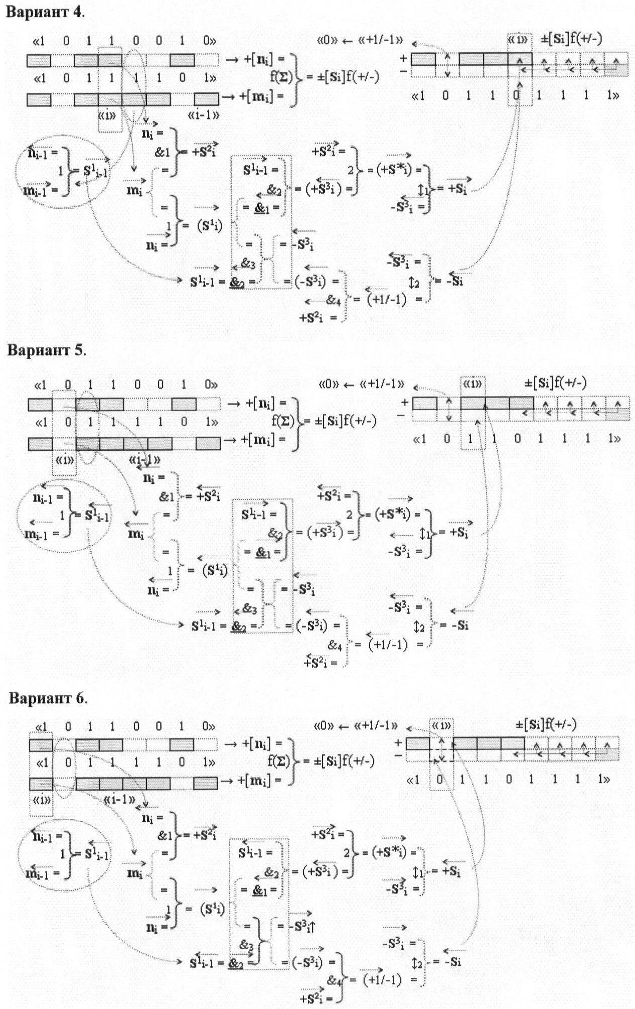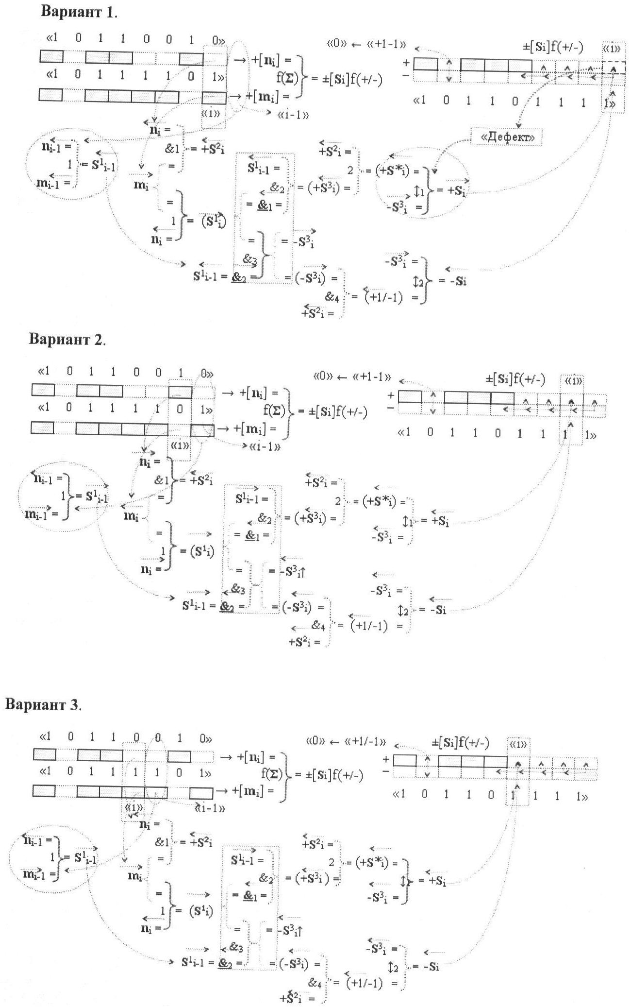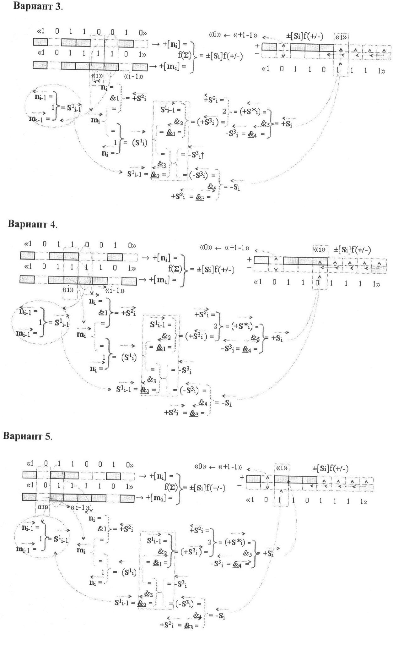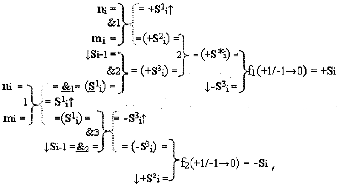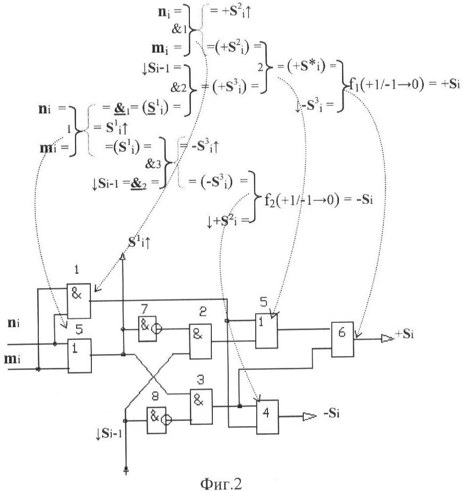 Способ параллельного логического суммирования аналоговых сигналов слагаемых эквивалентных двоичной системе счисления, включающий поразрядное выполнение преобразований аналоговых сигналов слагаемых [ni] и [mi], которые принимают либо условно высокий или активный уровень, либо условно низкий сигнал или неактивный уровень, при этом из входных аналоговых сигналов ni и mi в «i» разряде формируют аналоговые сигналы первой промежуточной логической суммы S1 i, посредством логических функций f1(})-ИЛИ и второй промежуточной логической суммы S2 i, посредством логических функций f1(&)-И, из которых формируют аналоговый сигнал Si результата логического суммирования, отличающийся тем, что аналоговый сигнал первой промежуточной логической суммы S1 i логически дифференцируют с одновременным формированием производных аналоговых сигналов положительного +S3 i и условно отрицательного -S3 i, при этом положительный производный аналоговый сигнал +S3 i формируют посредством логической функции f2(&)-И из предварительно измененного функцией f1(&)-HE по уровню аналогового сигнала S1 i первой промежуточной суммы S1 i «i» разряда и первой промежуточной суммы S1 i-1 «i-1» разряда, а условно отрицательный производный аналоговый сигнал -S3 i формируют посредством логической функции f3(&)-И из аналогового сигнала первой промежуточной суммы S1 i «i» разряда и предварительно измененного функцией f2(&)-HE по уровню аналогового сигнала S1 i-1 первой промежуточной суммы S1 i-1 «i-1» разряда, после чего в «i» разряде положительный производный аналоговый сигнал +S1 i совмещают с аналоговым сигналом второй промежуточной суммы +S2 i посредством логической функции f2(})-ИЛИ и выполняют изменение уровня аналогового сигнала результирующего аргумента +S*i, что соответствует процедуре удаления активного логического нуля f1(+1/-1 0), которые формируется, если совмещенный аналоговый сигнал +S*i и условно отрицательный производный аналоговые сигналы -S3 i принимают одновременно активные уровни аналогового сигнала, при этом выполняют изменение (удаление) активного уровня аналогового сигнала f2(+1/-1 0) при совпадении условно отрицательного производного аналогового сигнала S3 i с аналоговым сигналом второй промежуточной суммы +S2 i в соответствии с математической моделью вида
