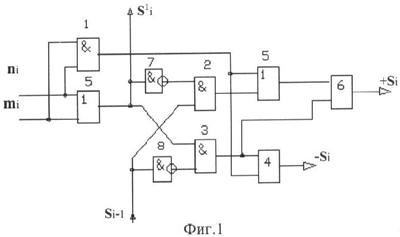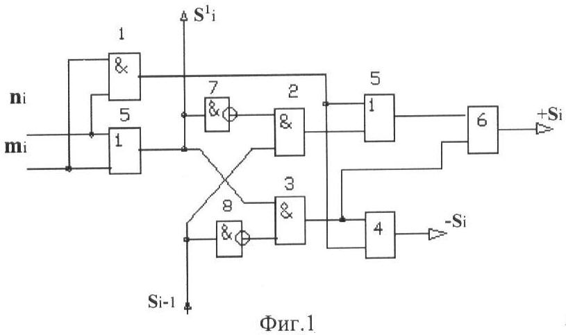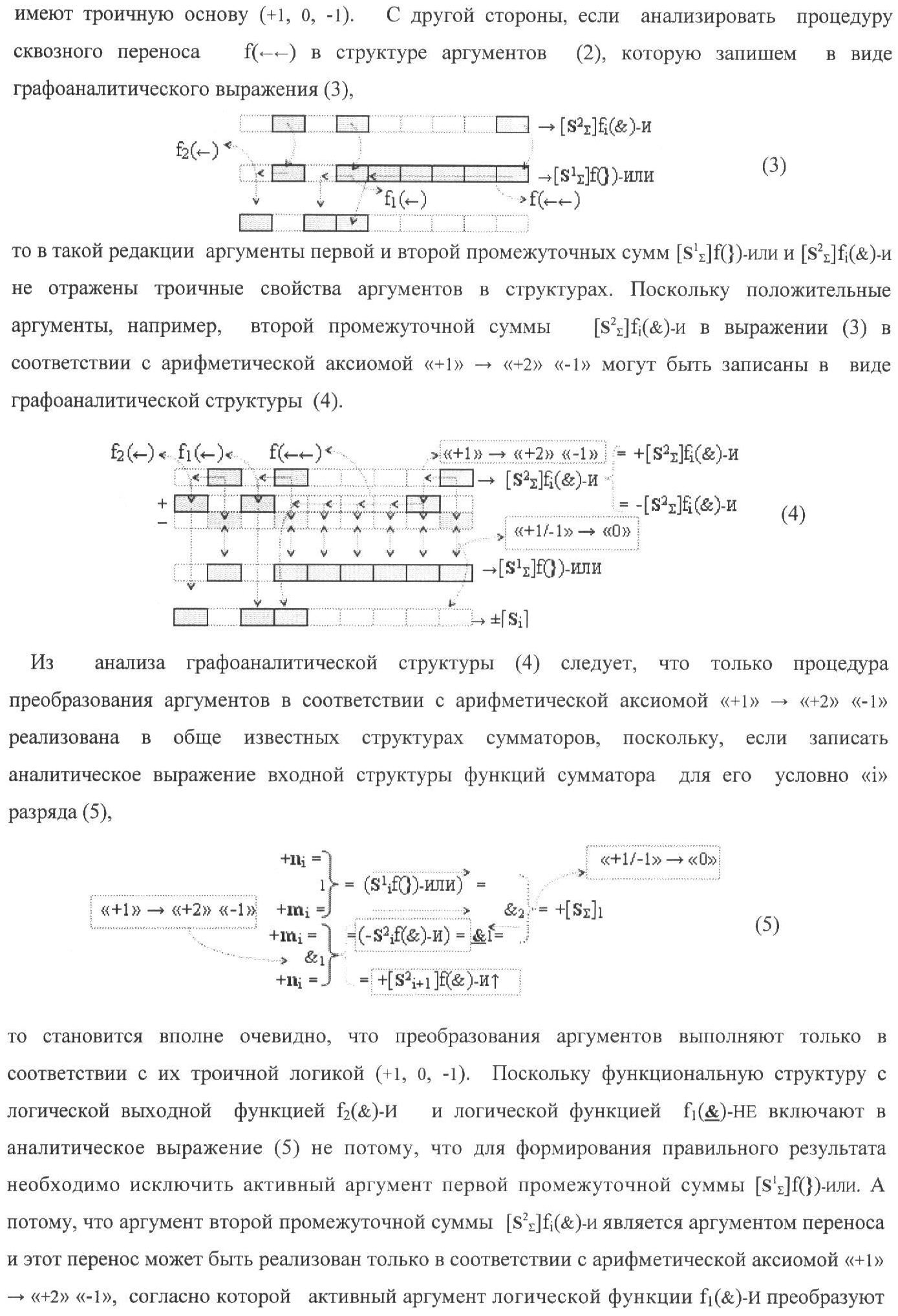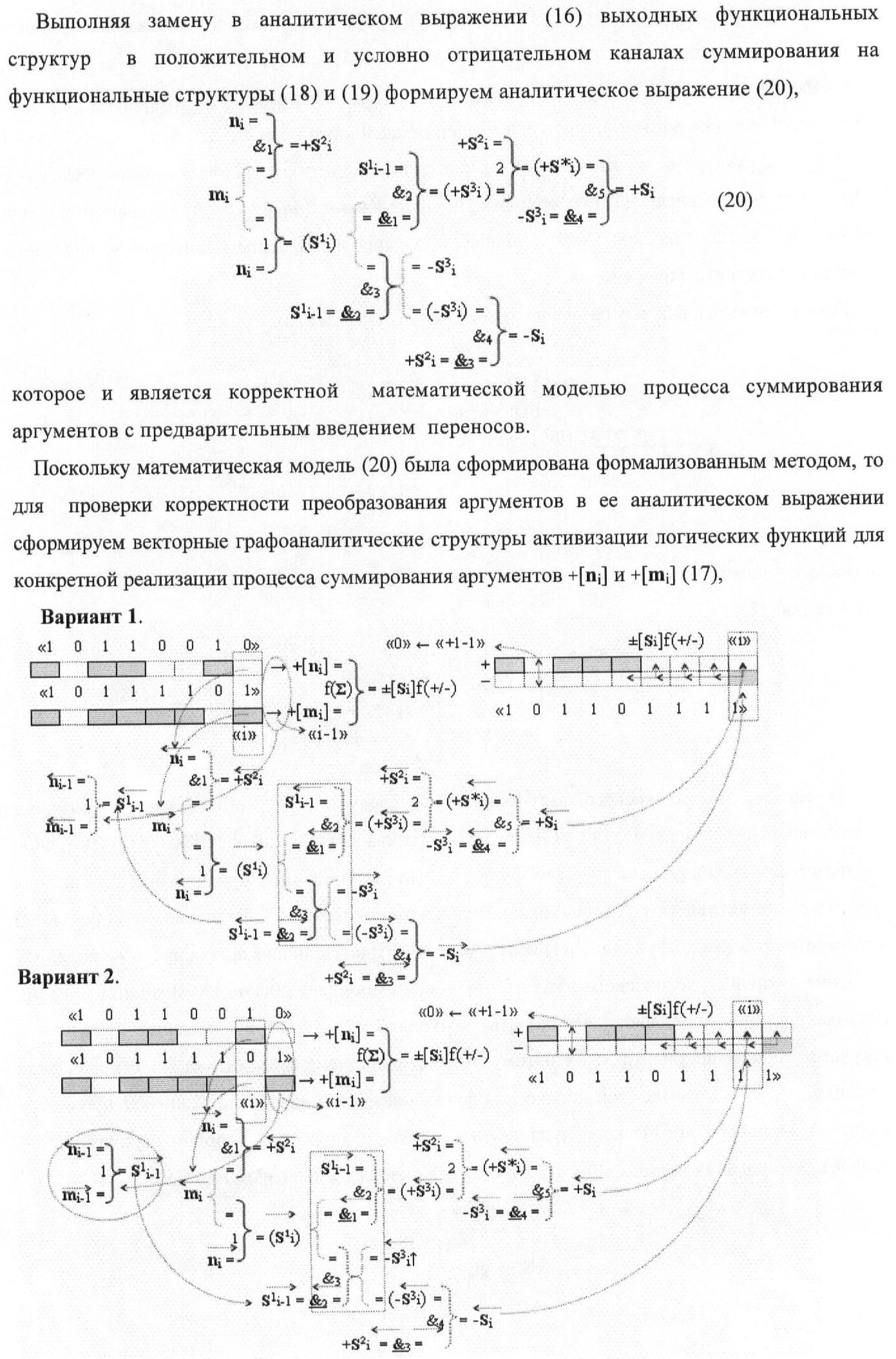 Изобретение относится к вычислительной технике и может быть использовано при построении арифметических устройств для выполнения арифметических операций в позиционно-знаковых кодах. Техническим результатом является повышение быстродействия. Способ заключается в следующем: из входных аналоговых сигналов ni и mi в «i» разряде формируют аналоговые сигналы первой промежуточной логической суммы S1 i, посредством логических функций ИЛИ1 и второй промежуточной логической суммы S2 i, посредством логических функций И1, формируют положительный производный аналоговый сигнал +S3 i посредством логической функции И2 из предварительно измененного функцией НЕ1 по уровню аналогового сигнала S1 i и первой промежуточной суммы S1 i-1 «i-1» разряда, а условно отрицательный производный аналоговый сигнал -S3 i формируют посредством логической функции И3 из аналогового сигнала S1 i и предварительно измененного функцией НЕ2 по уровню аналогового сигнала S1 i-1 первой промежуточной суммы S1 i-1 «i-1» разряда, аналоговый сигнал +S3 i совмещают с аналоговым сигналом +S2 i посредством логической функции ИЛИ2 и выполняют изменение уровня аналогового сигнала результирующего аргумента +S*i, что соответствует процедуре удаления активного логического нуля, который формируется, если совмещенный аналоговый сигнал +S*i и условно отрицательный производный аналоговые сигналы -S3 i принимают одновременно активные уровни аналогового сигнала, выполняют удаление активного уровня аналогового сигнала при совпадении условно отрицательного производного аналогового сигнала -S3 i с аналоговым сигналом второй промежуточный суммы +S2 i. 5 ил.