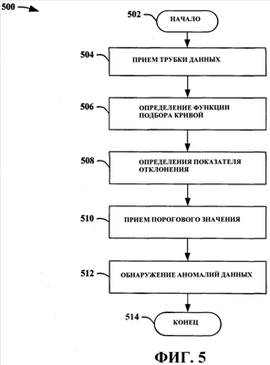 На Фиг. 5 изображена другая блок-схема последовательности операций способа 500 обеспечения автоматического обнаружения аномалий перспективных представлений данных, соответствующего аспекту настоящего изобретения. Способ 500 начинается приемом трубки данных, представляющей такой срез данных с перспективного представления данных, в котором изменяется только одно измерение (этап 504). После этого производится определение того, какая функция наилучшим образом представляет данные в трубке данных (этап 506). Функция может быть получена при помощи авторегрессионного процесса, такого как кусочно-линейные процессы и процессы, использующие дерево регрессии, для непрерывных и дискретных данных. Функция также может быть получена как функция, задаваемая пользователем. После этого на основе прогнозируемого значения данных, выдаваемого функцией подбора кривой, и фактических значений данных определяются показатели отклонения (этап 508). После этого принимается пороговое значение, которое определяет величину отклонения, допускаемую прежде, чем значение данных признается ошибочным (этап 510). Пороговое значение может быть определено системой и/или предоставлено пользователем. Это может быть статическое значение и/или динамическое значение. Пороговое значение также может варьироваться в зависимости от типа аномалии данных. После этого путем определения того, какие значения данных имеют показатели отклонения, превышающие пороговое значение, производится обнаружение аномалий данных (этап 512), а этап 514 завершает процесс. Обычно аномалии данных транслируются пользователю посредством представленных на экране индикаторов, таких как выделение, оконтуривание и/или цветовое кодирование и т.п. Однако в равной степени могут использоваться пиктограммы и другие графические индикаторы. Индикаторы позволяют пользователям оценить, на каком уровне может быть найдена аномалия данных. Они также могут быть использованы для индикации типа аномалии данных и/или степени отклонения аномалии данных. Другие примеры по настоящему изобретению включают в себя дополнительные операции, которые автоматически отображают аномалию данных для пользователя, не требуя ввода пользователем дополнительных команд для просмотра фактических аномальных данных. Это значительно снижает количество выдаваемых пользователю данных, поскольку для этого не требуется, чтобы пользователь для нахождения и просмотра аномалии данных знал и понимал все индикаторы уровней данных.