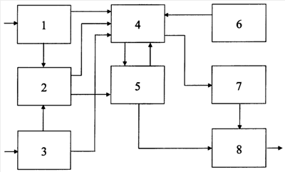 Решение сложной задачи по прогнозированию возможностей восприятия человеком визуальной информации, необходимой для принятия решений в обстановке дефицита времени, моделируется устройством, вариант структурной схемы которой показан на чертеже. Схема устройства включает: 1 – имитатор первой работы, 2 – имитатор второй работы, 3 – имитатор третьей работы, 4 – блок памяти, 5 – арифметический блок, 6 – задатчик ресурса, 7 – блок коррекции, 8 – блок сравнения.