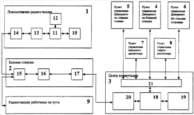 В кабине локомотива каждого поезда размещается локомотивная радиостанция 1, взаимодействующая с другими абонентами с помощью базовой станции 2 и центра коммутации 3. Через локомотивную радиостанцию 1 машинист поезда взаимодействует с дежурными по станциям с помощью пультов управления дежурных по станциям 4, 5, 6, а также с поездным диспетчером и с энергодиспетчером с помощью пульта управления поездного диспетчера 7 и пульта управления энергодиспетчера 8 соответственно или с работником на пути с помощью радиостанции 9.