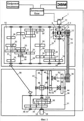 Тренажер содержит приводной механизм 1, связанный с ведущим валом 2 конической передачи 3, имеющей ведущее колесо 4, жестко установленное на ведущем валу 2, первое ведомое колесо 5, свободно установленное на первом ведомом валу 6 и зацепленное с ведущим колесом 4, дополнительное колесо 7, свободно установленное на первом ведомом валу 6, второе ведомое колесо 8, жестко установленное на втором ведомом валу 9 и зацепленное с первым ведомым 5 и дополнительным 7 колесами, и двухстороннюю муфту 10 переключения, установленную на первом ведомом валу 6 с возможностью поочередного зацепления с первым ведомым 5 и дополнительным 7 колесами. На ведущем валу 2 установлены приводной механизм 1 и электронное считывающее устройство 11, состоящее из датчика считывания количества оборотов и датчика, определяющего направление вращения ведущего вала 2. На первом ведомом валу 6 конической передачи 3 жестко установлено ведущее звено (шкив) 12 передачи с гибким элементом 13. Второй ведомый вал 9 связан с входным валом 14 коробки 15 переключения передач, имеющей шестерни 16-26, жестко установленные соответственно на валах 14, 27-31, и подвижные в осевом направлении на шлицах шестерни 32-35. Ведомое звено 36 передачи с гибким элементом 13 жестко установлено на ведущем валу 37 редуктора 38, имеющего первое колесо 39, жестко установленное на ведущем валу 37, второе колесо 40, свободно установленное на ведущем валу 37, первую одностороннюю муфту 41 переключения, установленную на ведущем валу 37 с возможностью зацепления с вторым колесом 40, третье колесо 42, жестко установленное на ведомом валу 43, четвертое колесо 44, свободно установленное на ведомом валу 43, и вторую одностороннюю муфту 45 переключения, установленную на ведомом валу 43 с возможностью зацепления с четвертым колесом 44. Ведомый вал 43 связан с червяком 46 червячной передачи 47, червячное колесо 48 которой жестко установлено на валу 49. Вал 49 связан с эпициклическим колесом 50 трехзвенного планетарного механизма 51, солнечное колесо 52 которого свободно установлено на валу 53 водила 54 и посредством колеса 55, колеса 56, жестко установленного на валу 57, и карданной передачи 58 связано с выходным валом 31 коробки 15 переключения передач. На валу 53 водила 54 установлено электронное считывающее устройство 59, состоящее из датчика считывания количества оборотов и датчика определяющего направление вращения вала 53 водила 54. Переключением ступеней в коробке передач 15 и зубчатых муфт 10, 41 и 45 обеспечиваются различные передаточные отношения между ведущим валом 2 и валом 53 водила 54. Электронные считывающие устройства 11 и 59 (фиг.1), каждое из которых включает в себя датчик, фиксирующий количество оборотов ведущего вала и вала водила (фиг.2), состоящий из постоянного магнита 63, неподвижно установленного на ведущем валу и валу водила с напрессованной на нем металлической обоймой 62 с прорезями, вращающегося внутри неподвижной металлической обоймы 60 с установленной на ее внешней стороне катушкой индуктивности 61, и датчик, определяющий направление вращения ведущего вала и вала водила (фиг.3), состоящего из неподвижно закрепленного на ведущем валу и валу водила ротора 70 с металлическими магнитопроводами 69, на которых установлены катушки индуктивности 67 и коллектор 68, вращающиеся в статорах 64, на которых установлены полюсные постоянные магниты 65 и щеточный у