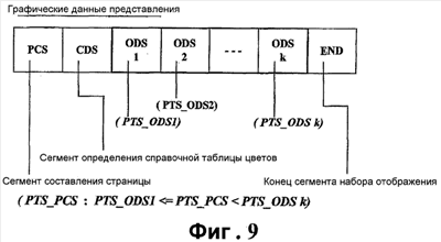 На фиг.9 показана структура графических данных, предназначенных для составления страницы графического символа субтитра, такой как показана на фиг.8. В структуре данных по фиг.9 первый сегмент представляет собой PCS, который включает в себя информацию для графической страницы и все объекты, которые должны быть включены в страницу, второй представляет собой CDS, который определяет палитру для графического плана, и, по меньшей мере, один ODS следует после CDS. Каждый ODS включает в себя графические данные растрового изображения для объектов, которые должны отображаться на странице графического символа субтитра. Последний объект представляет собой END (конец сегмента набора отображения), который должен обозначать конец набора отображения.