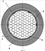 На фиг.5 представлено поперечное сечение заготовки, собранной для изготовления теплостабилизированного сверхпроводника на основе Nb3Sn, легированного редкоземельным интерметаллидом РrВ6, расположенным внутри сплющенных трубок, навитых по спирали в зазоре, выполненном в радиальном направлении в стенке полого медного цилиндра.