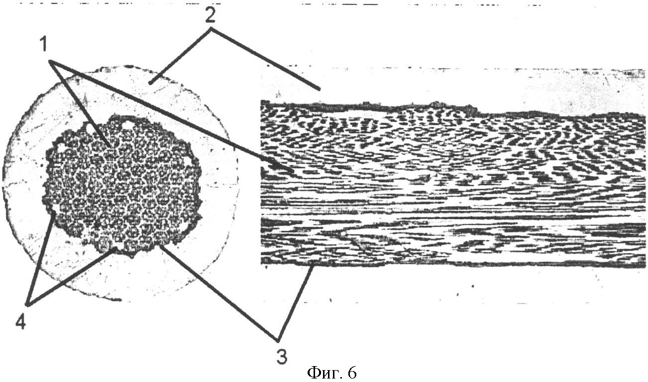 На фиг.6 представлены поперечное и продольное сечения экспериментального сверхпроводника на основе Nb3Sn, изготовленного известным способом (контрольный образец для сравнительных исследований).