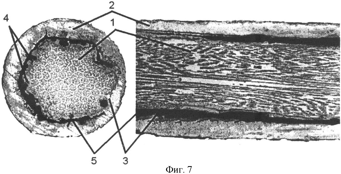 На фиг.7 представлены поперечное и продольное сечения экспериментального сверхпроводника на основе Nb3Sn с легирующей добавкой РrВ6 по предложенному изобретению.