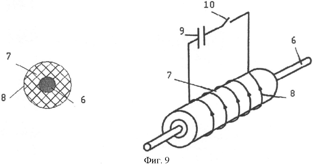 Далее образцы сверхпроводников 6 (фиг.7) помещали в изолирующие оправки 7 для имитации адиабатических условий. На оправку 7 наматывали катушку возбуждения 8 из медного провода диаметром 0,125мм, содержащую 600 витков. Продольные электромагнитные возмущения моделировали разрядом конденсатора 9 с помощью ключа 10 на катушку возбуждения 8. При этом возникали электромагнитные колебания частотой 320 Гц, которые приводили к индукционному нагреву образца длиной 120 мм кольцевыми вихревыми токами с характерным временем их затухания 1,1 мс.