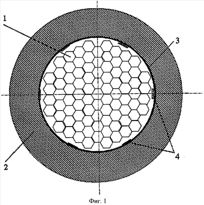 Собранная известным способом заготовка (фиг.1) включает предварительно подготовленные шестигранники бронза/ниобий 1, полый медный цилиндр 2, соосно с которым расположена оболочка из ниобия 3 и проставки из тантала 4, не позволяющие при диффузионном отжиге образоваться непрерывному цилиндрическому слою Nb3Sn в оболочке и, таким образом, предотвратить ее роль как экрана в переменных магнитных полях.
