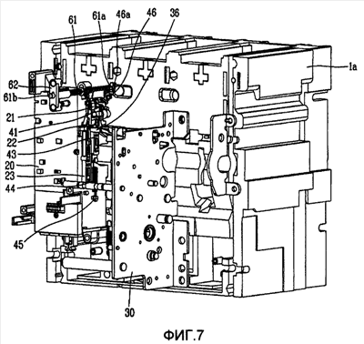 В первую очередь, на фиг.7 изображен вид в перспективе, показывающий соединенное состояние между приводом, передающим движущую силу блоком и механизмом переключения, которые все предназначены для выполнения операции размыкания, в состоянии, когда передний основной кожух удален с воздушного выключателя, соответствующего настоящему изобретению, который будет описан далее.