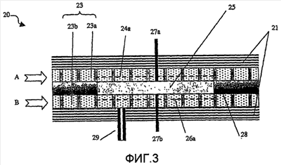Текучие среды A и B реагируют на соответствующих им электродах, как описано выше со ссылкой на Фигуру 1, и в цепи, к которой подсоединены токосъемники 27a, 27b, устанавливается электрический ток. Токосъемники 27a, 27b могут быть предусмотрены в виде сетки, проволоки или проводящих дорожек, либо прикрепленных, приклеенных или напыленных на промежуточный слой 28. Могут быть нанесены сложные рисунки из проводящих, полупроводящих или изолирующих дорожек в двух или трех измерениях, что позволяет решать многие задачи.