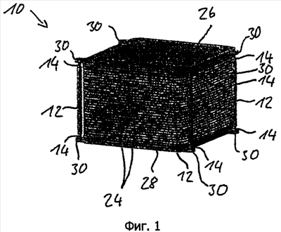 На фиг.1 в изометрии изображена форма выполнения штабеля 10 высокотемпературных топливных элементов согласно изобретению. Изображенный штабель высокотемпературных топливных элементов содержит известным самим по себе способом множество идентичных элементов 24, установленных между верхней 26 и нижней 28 концевой пластиной. Верхняя 26 и нижняя 28 концевая пластина имеют по своим соответствующим углам серьги 30, снабженные раззенкованными отверстиями. В варианте выполнения, изображенном на фиг.1, временное стягивающее устройство образовано четырьмя втулками 12 (из которых видны только три) и восемью винтами 14 (из которых видны только шесть) с потайными головками. Как втулки 12, снабженные внутренней резьбой, так и винты 14 изготовлены из пластмассы, которая сгорает полностью при температуре, предпочтительно, ниже рабочей температуры штабеля высокотемпературных топливных элементов, которая может составлять, например, 850°С. Пластмасса может включать, например, полимеризационные пластмассы, например полипропилен и/или полиэтилен.