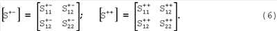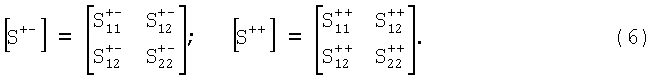 К полученному таким образом восьмиполюснику применяется метод суперпозиции синфазного и противофазного возбуждений, описанный в работе: Фельдштейн А.Л., Явич Л.Р., Смирнов В.П. «Справочник по элементам волноводной техники», М.: Советское Радио, 1967, раздел 2.10. Согласно этому методу в горизонтальной плоскости симметрии, перпендикулярной заземленной плоскости на фиг.3 и проходящей посередине проводящего цилиндра длиной lC, сначала размещается «электрическая» разделительная плоскость симметрии (противофазное возбуждение верхней и нижней половин фильтра), а затем «магнитная» (синфазное возбуждение половин). В обоих случаях находятся элементы матрицы рассеяния отрезка кабеля «над землей» с новой нумерацией плеч согласно фиг.4, нижний конец оплетки которого сначала закорочен на «землю» («электрическая» разделительная плоскость), а затем разомкнут («магнитная» разделительная плоскость). Верхний конец оплетки разомкнут в обоих случаях. Соответствующие этим случаям несимметричные матрицы рассеяния для противофазного (+-) и синфазного (++) возбуждений запишутся: