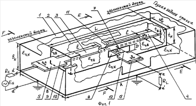 Однако в описании изобретения по данному АС СССР указывается, что « СВЧ-сигнал в полосе пропускания проходит через П-образные полуволновые проводники благодаря емкости связи между ними ». Поэтому упомянутому ППФ присущи те же ограничения, что и фильтру с непосредственной связью резонаторов, описанному в вышеупомянутом «Справочнике ». И хотя исполнение резонаторов в форме буквы «П» несколько сокращает их продольный геометрический размер, все равно вдоль оси разомкнутого с обеих сторон полуволнового резонатора должна формироваться стоячая волна напряжения, расстояние между узлами которой составляет половину длины волны 0 в диэлектрике. Иными словами, продольный размер АF фильтра определяется не геометрической длиной резонаторов [которая за счет исполнения резонатора в виде буквы «П» (или, например, «Н») будет несколько короче ], а равным количеству резонаторов N числом полуволн в диэлектрике, укладывающихся вдоль продольного размера фильтра.