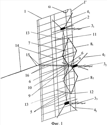 Директорные антенны 31, 32, 33 с активными V-образными вибраторами соответственно 41, 42, 43 и зигзагообразное полотно 7 расположены от рефлектора 1 по мере удаления от него в трех вертикальных параллельных плоскостях (на фиг.1 не показаны). В первой наиболее близкой к рефлектору 1 плоскости размещены верхняя