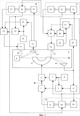 Все три блока автоматической подстройки частоты 5, 17, 22 выполнены, как в прототипе, по традиционной схеме, содержащей входной усилитель, синхронный детектор и выходной интегратор, где опорный вход синхронного детектора образует опорный вход блока автоматической подстройки частоты, а вход усилителя и выход интегратора образуют соответственно сигнальный вход и выход блока автоматической подстройки частоты. Каждый из блоков автоматической подстройки частоты 5, 17, 22 осуществляет синхронное детектирование сигнала, поступающего с первого выхода соответствующего фотоприемного устройства 4, 16, 21 относительно опорного сигнала, поступающего с выхода соответствующего низкочастотного генератора 6, 19, 24, и последующее интегрирование полученного в результате синхронного детектирования сигнала ошибки с получением необходимого управляющего напряжения.